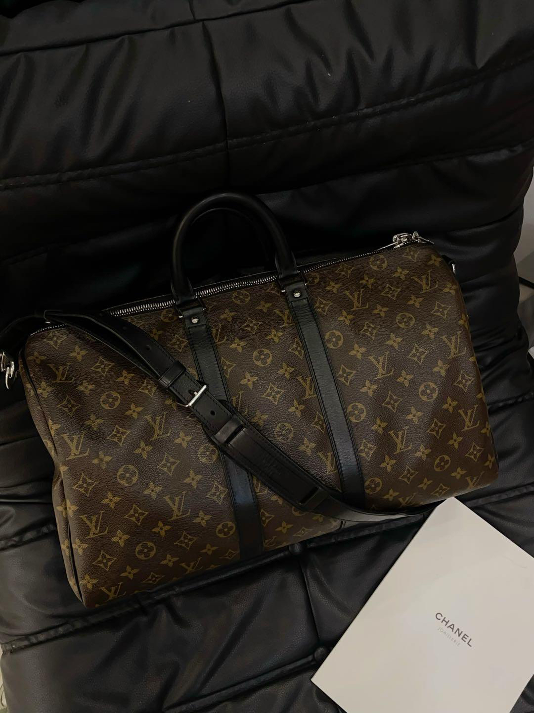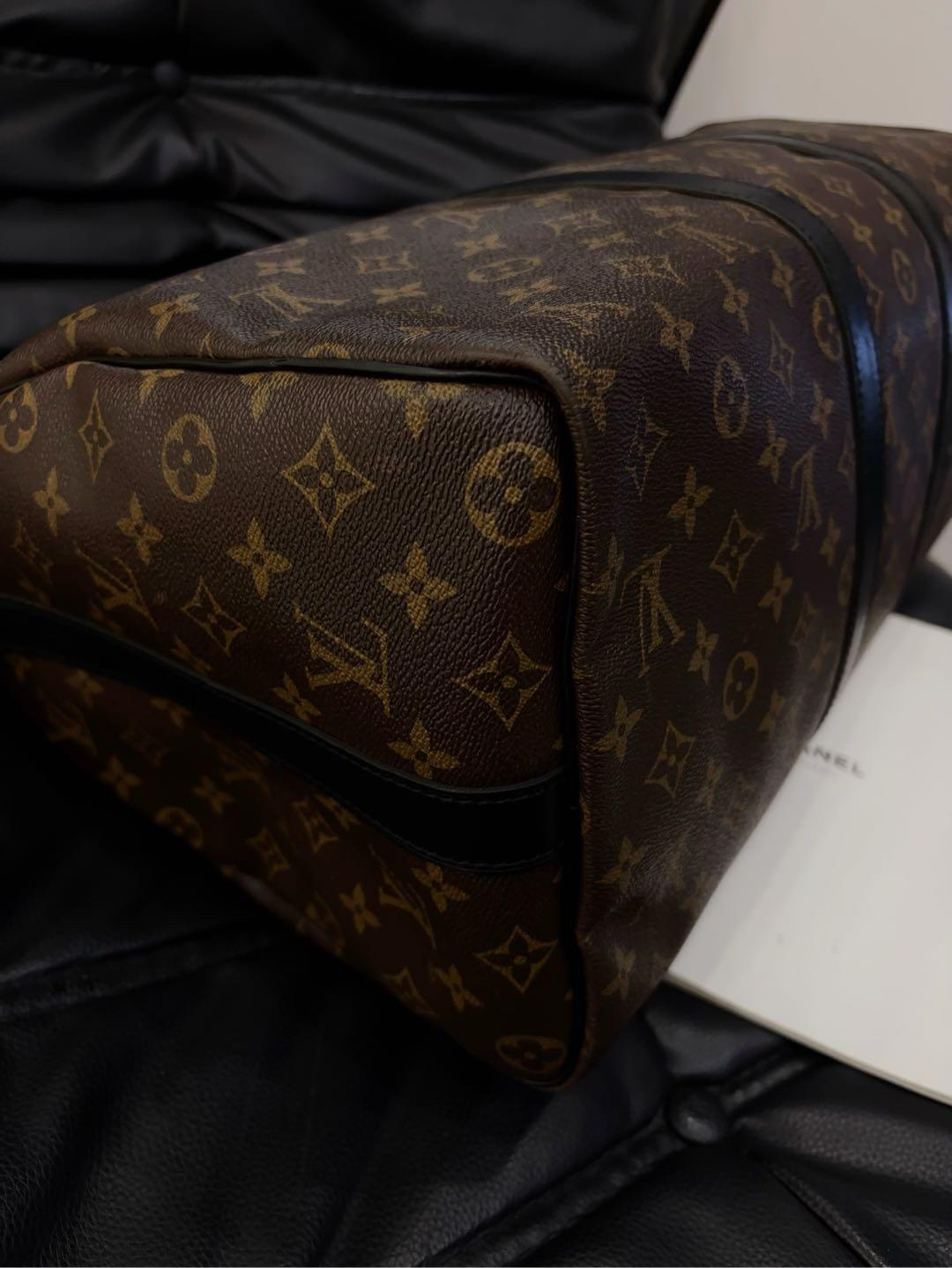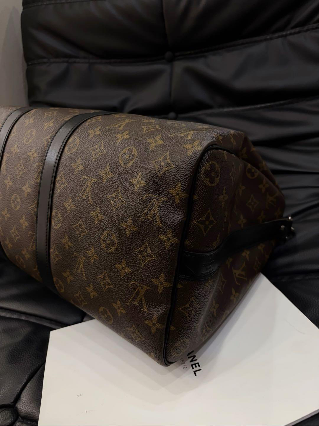 正品二手 Lv keepall 45 棕色 老花拼黑皮 手提 旅行包🍔 95新 45×27 配件:锁头 肩带 防尘袋。五金正常使用痕迹。黄金的尺寸