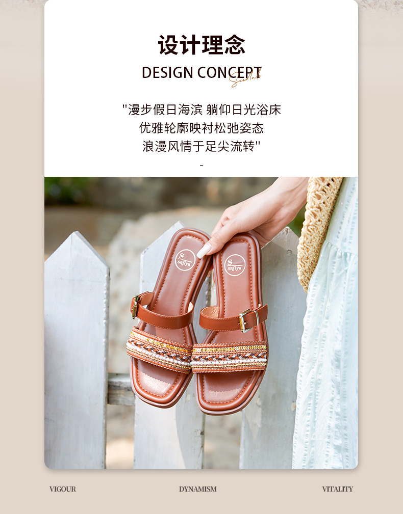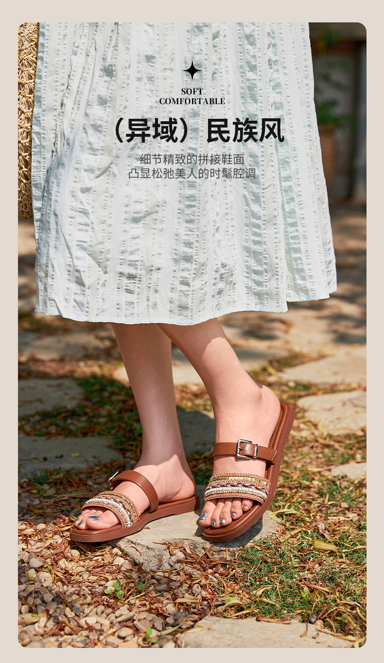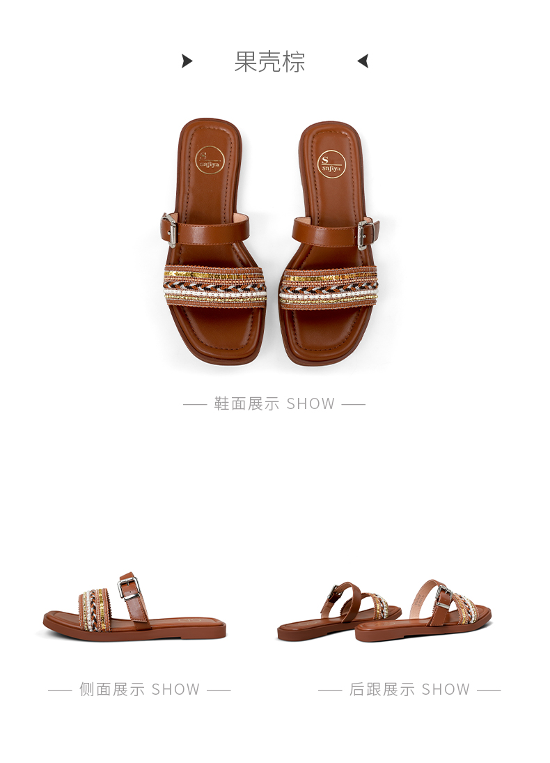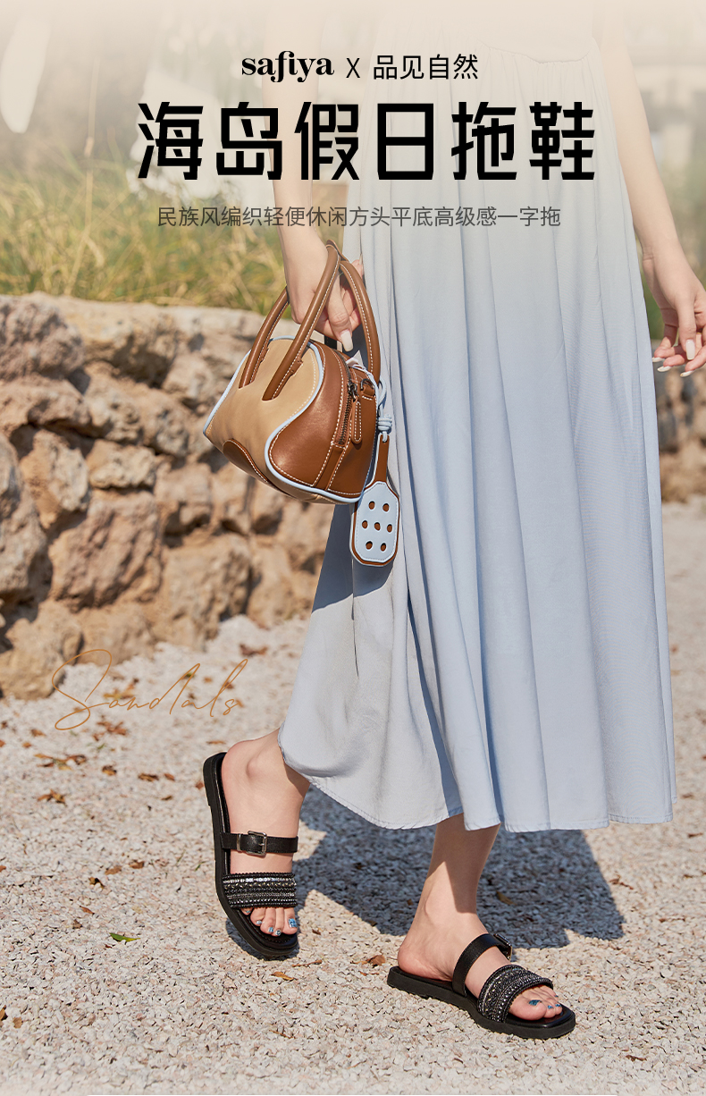 预售7天|Safiya/索菲娅2025民族风编织轻便休闲方头平底高级感一字拖SFD2110365