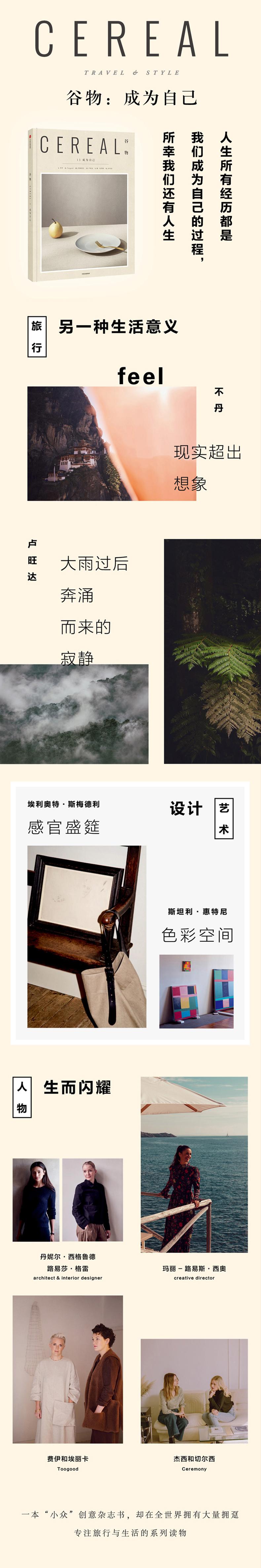 Cereal中文版,一个关注旅行和生活的系列读物;人生所有经历是我们成为自己的过程,所幸我们还有人生;旅行目的地:不丹、卢旺达,只为体会和沉浸;建筑与艺术、设计与时尚:讲述人们喜欢的好故事;以及散文和诗