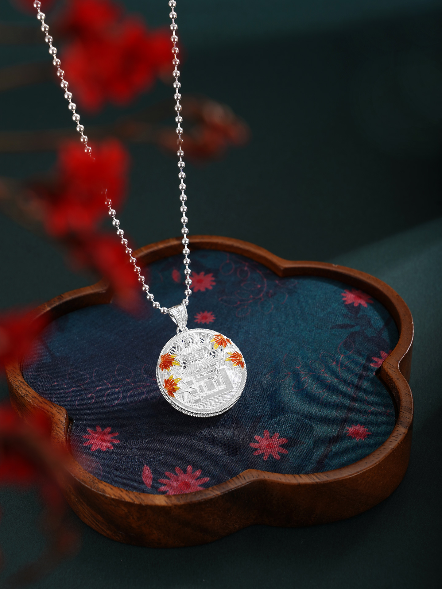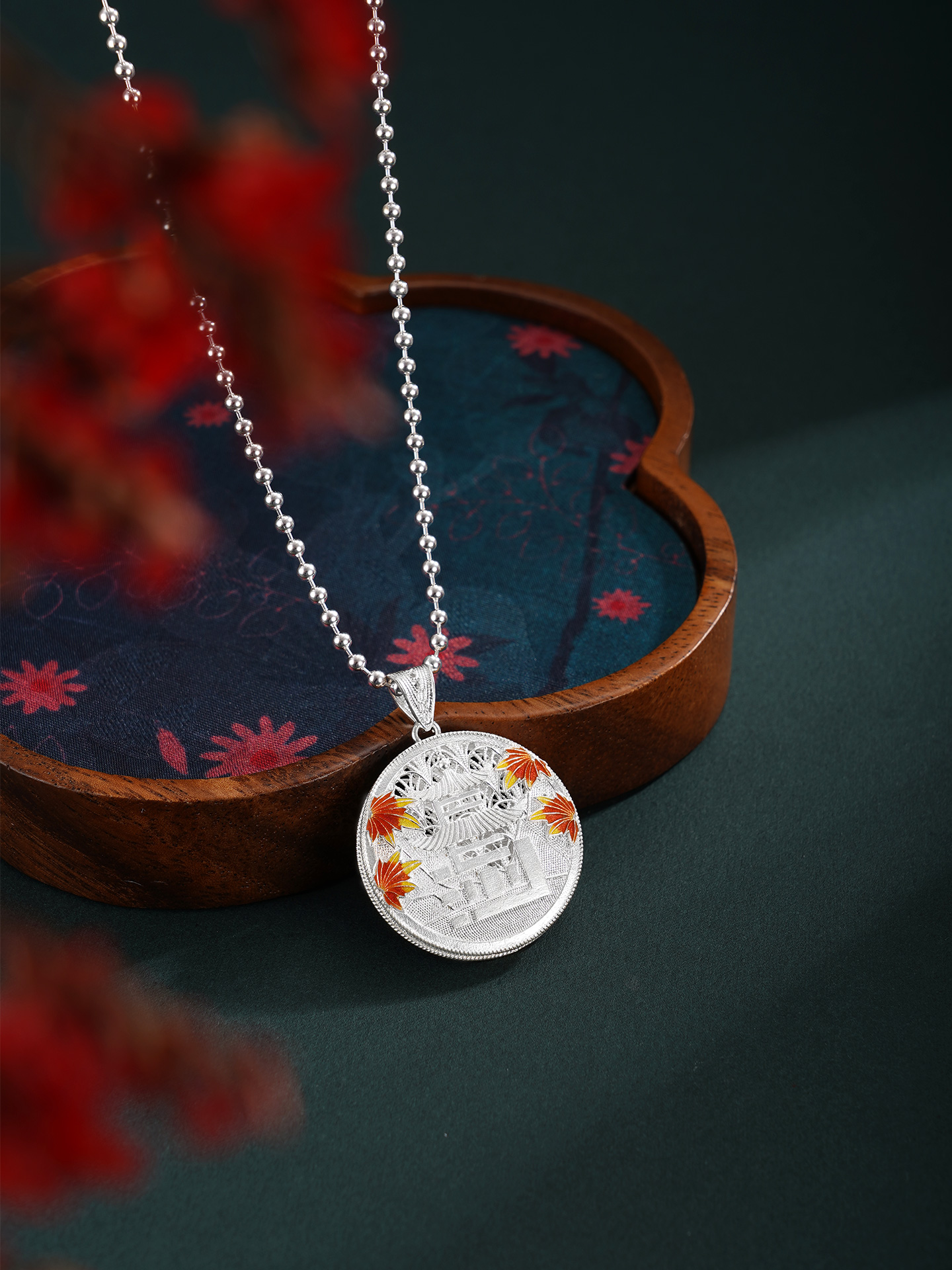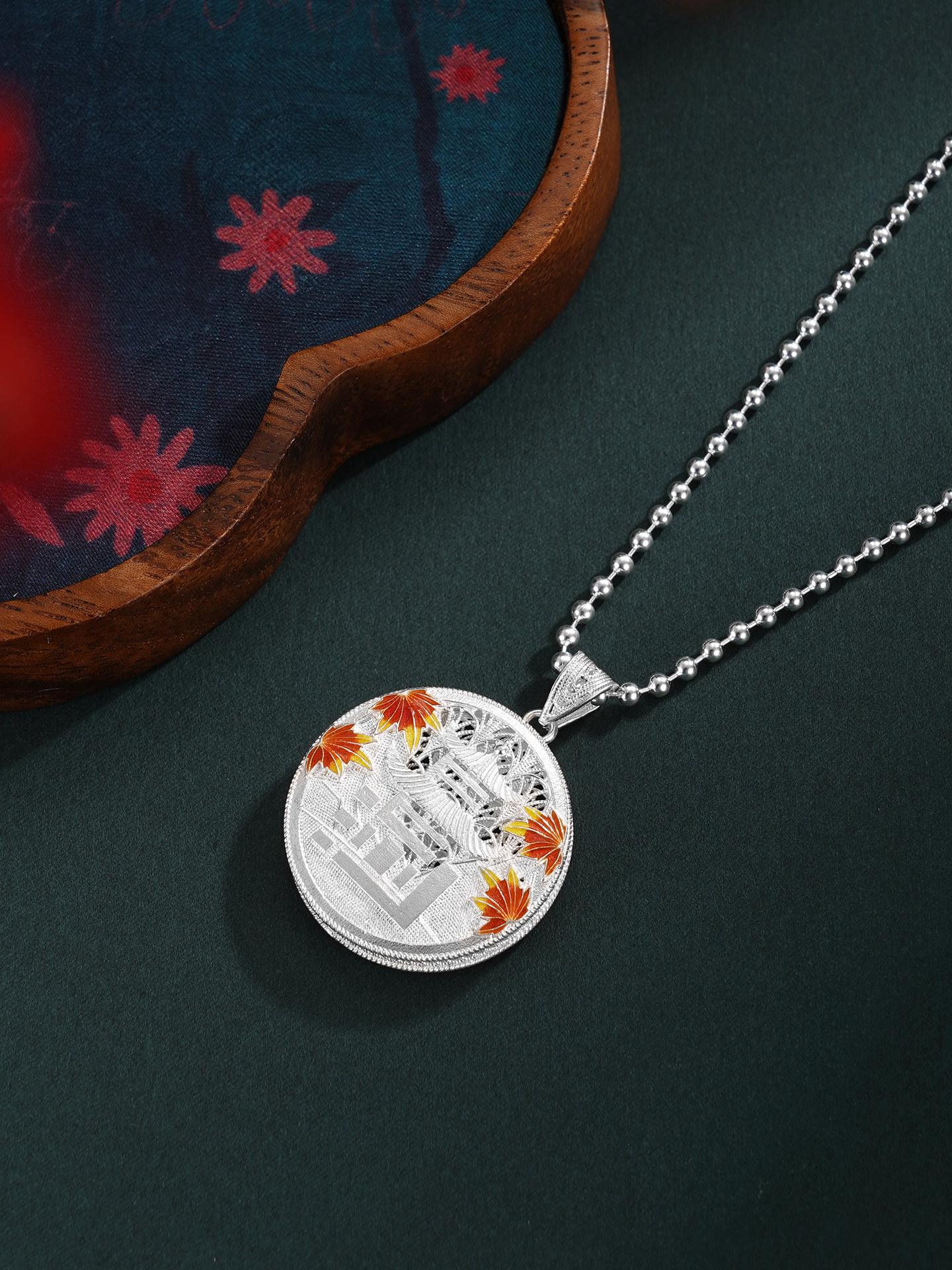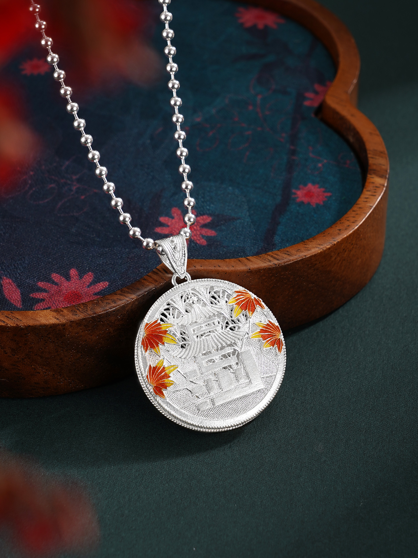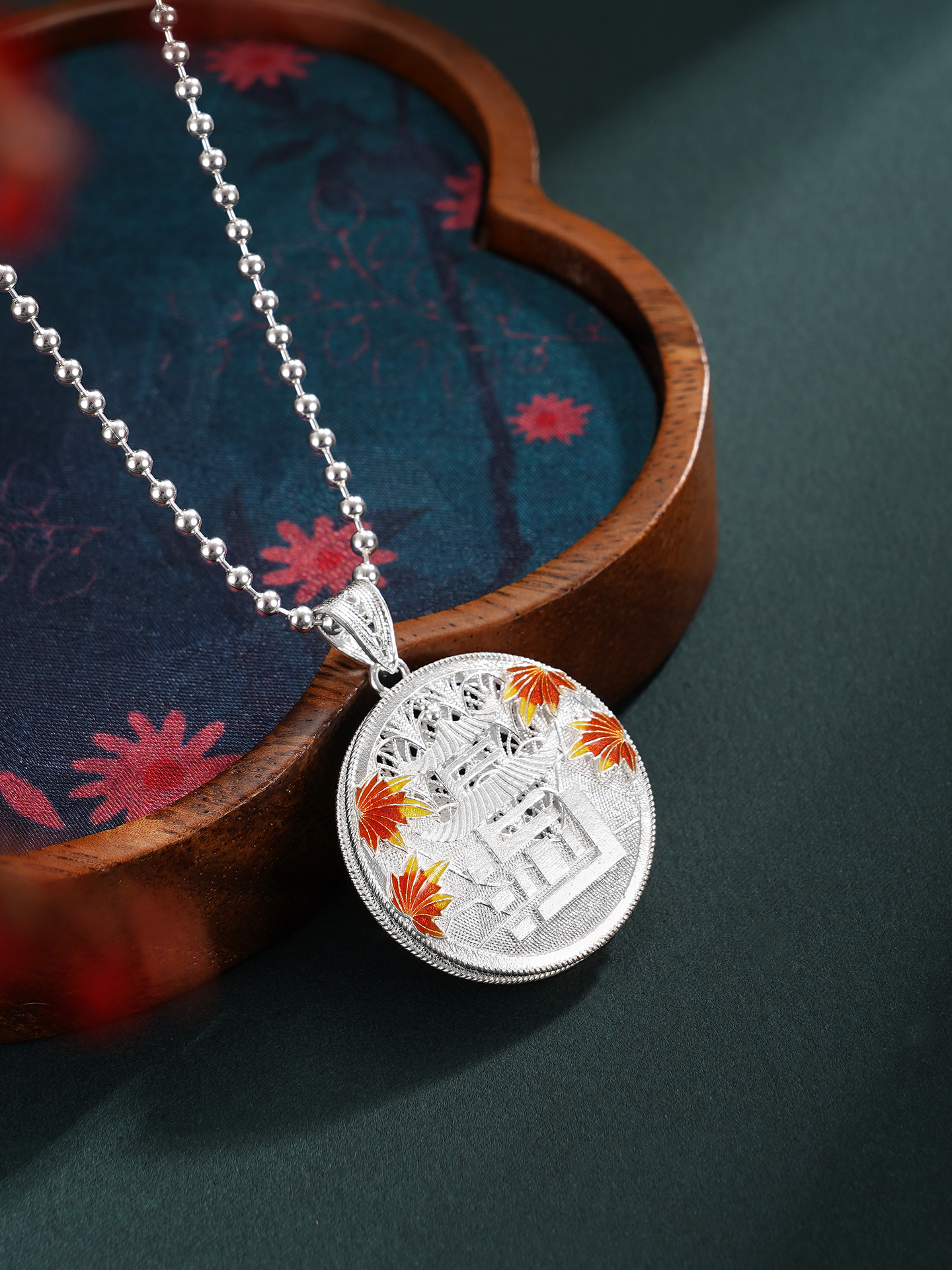 【寓意】:精选990足银,采用非遗银花丝工艺精制而成。“停车坐爱枫林晚,霜叶红于二月花”,枫叶与爱晚亭共生共融,红叶景观尽显长沙的本色,作品灵感源自爱晚亭的枫叶。巧妙地将“长沙”二字与爱晚亭的形象糅合变形,组成吊坠的主体,形成错落有致、古形古意的效果。枫叶环绕,珐琅彩着色,形成秋意冉冉的温柔景象。背面以花丝工艺编织水波纹,致敬纯至美的太平盛世。