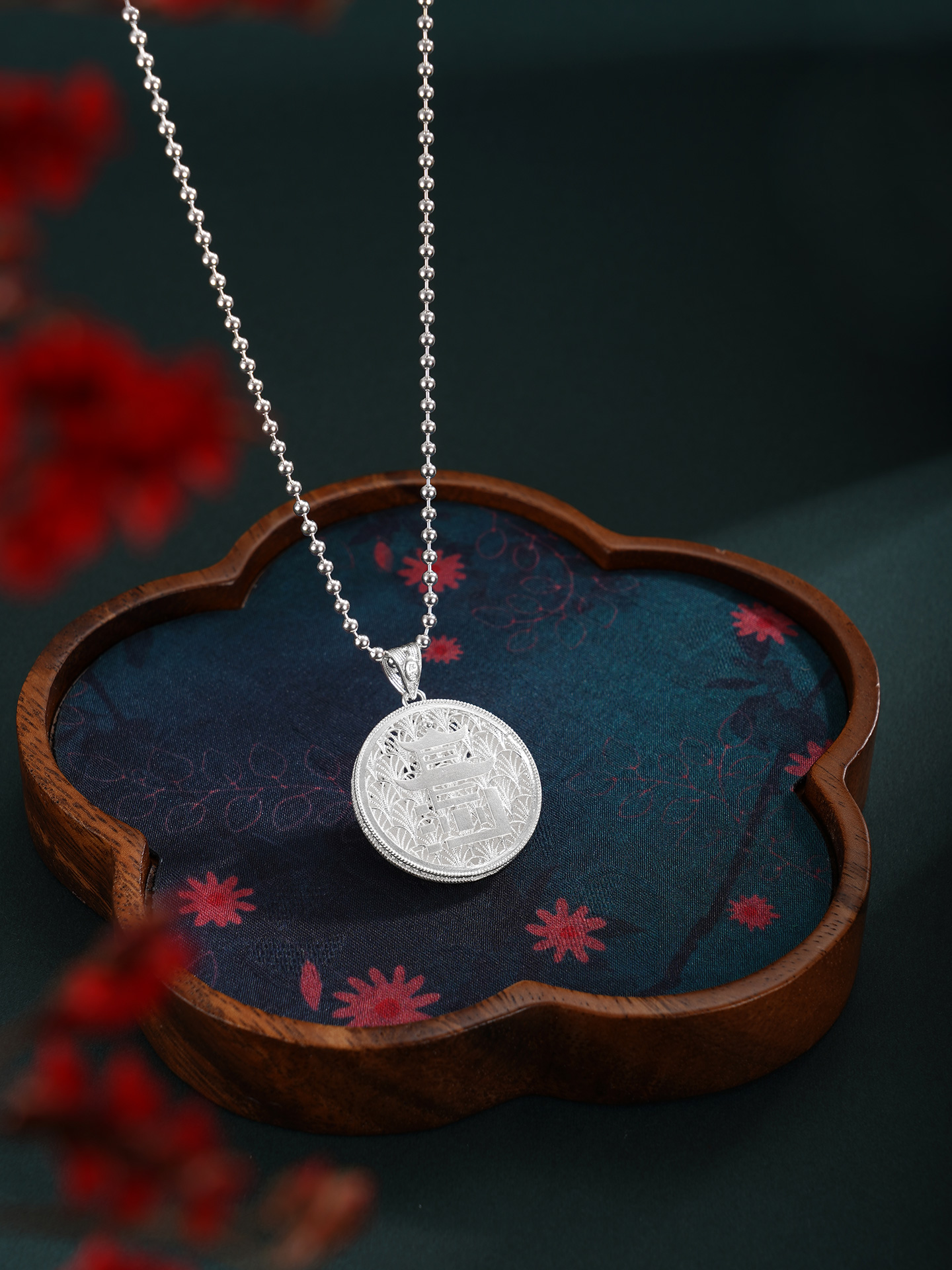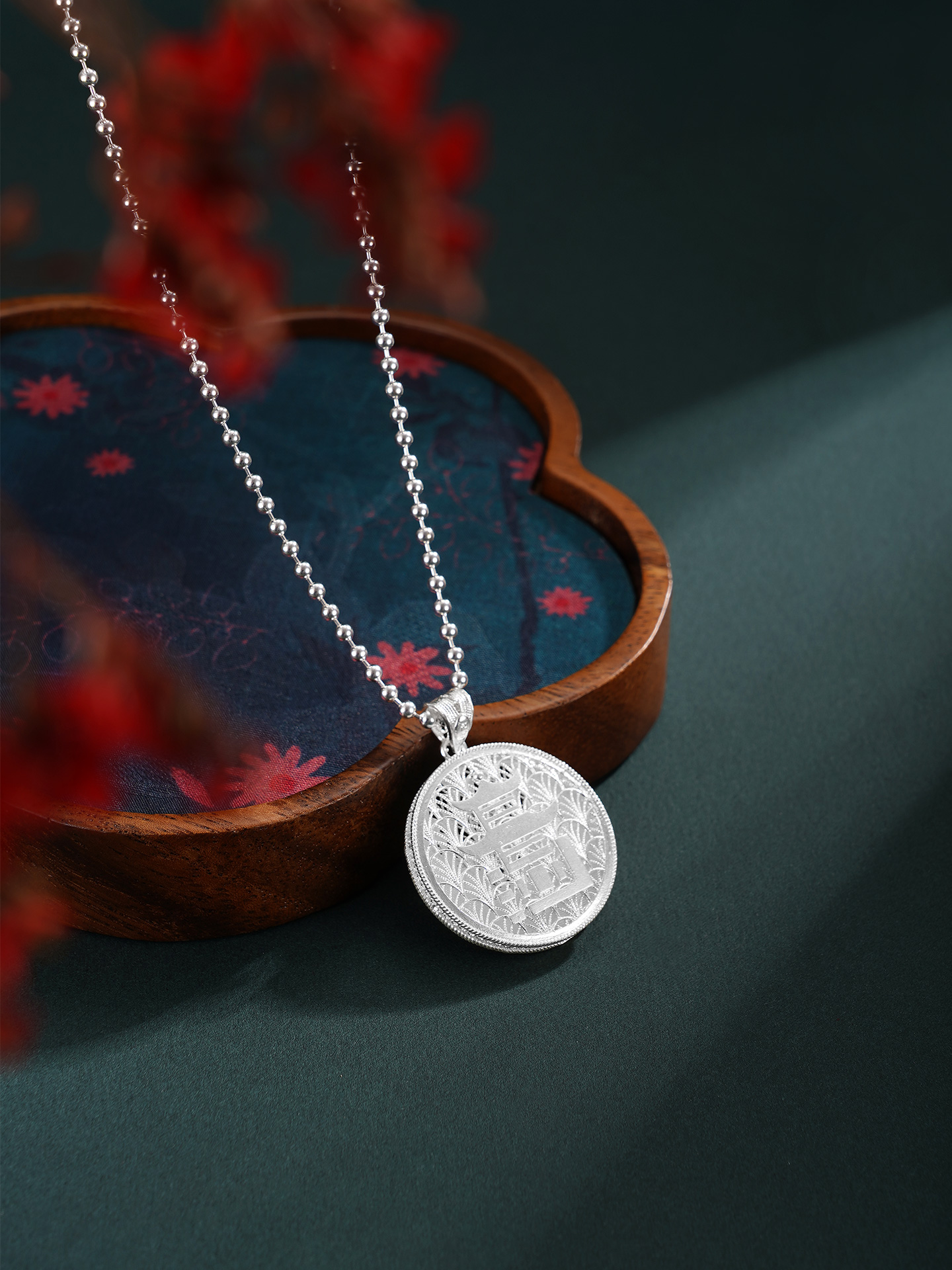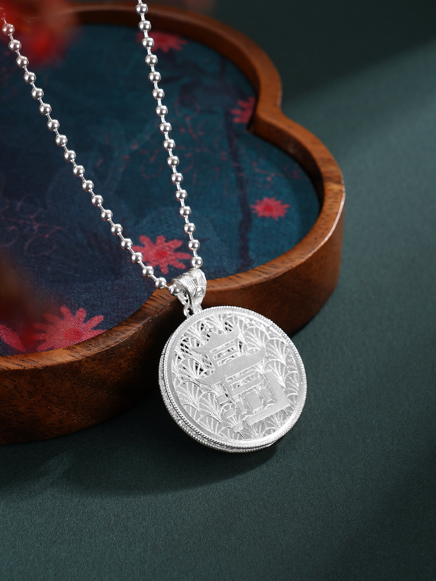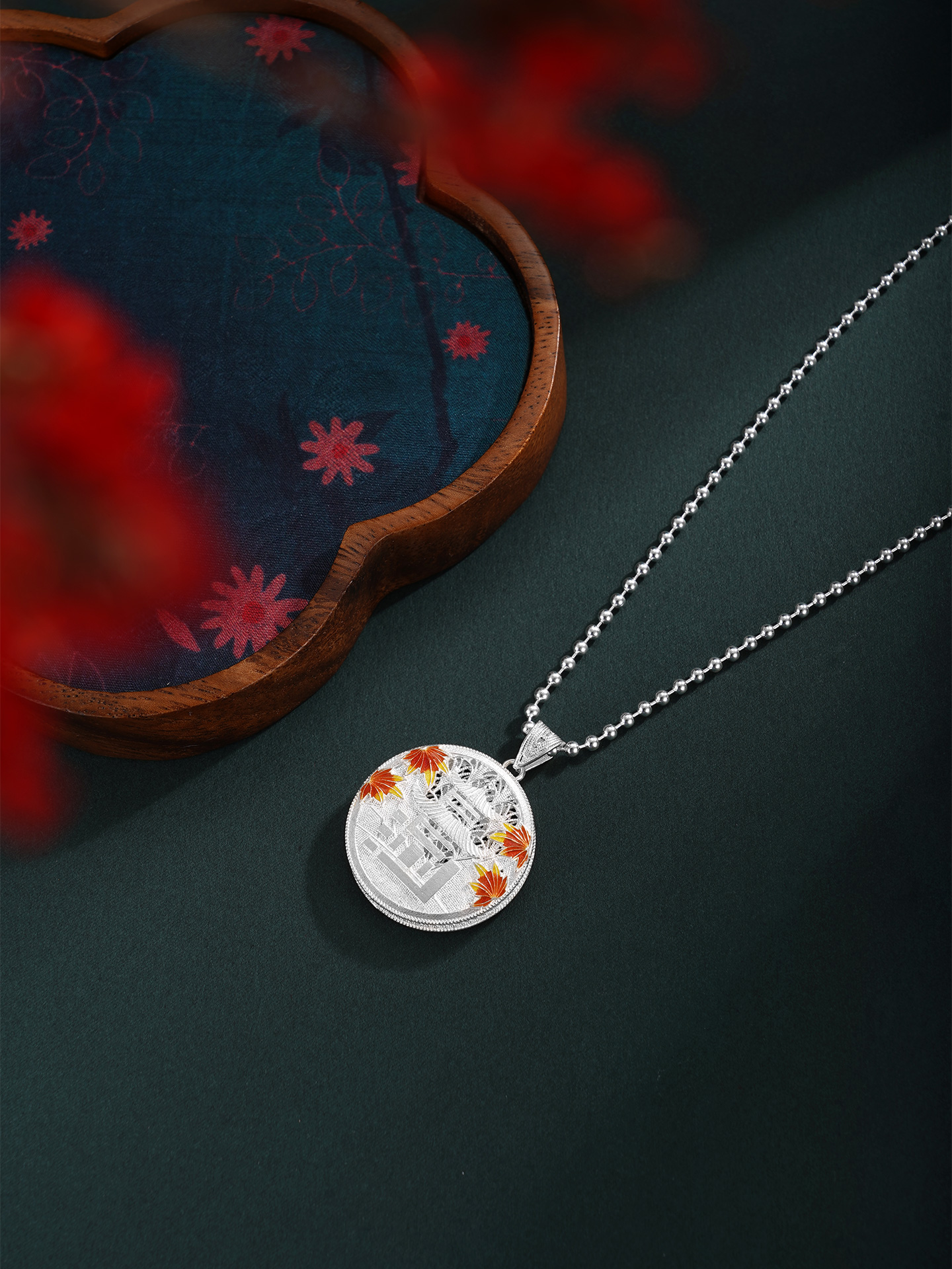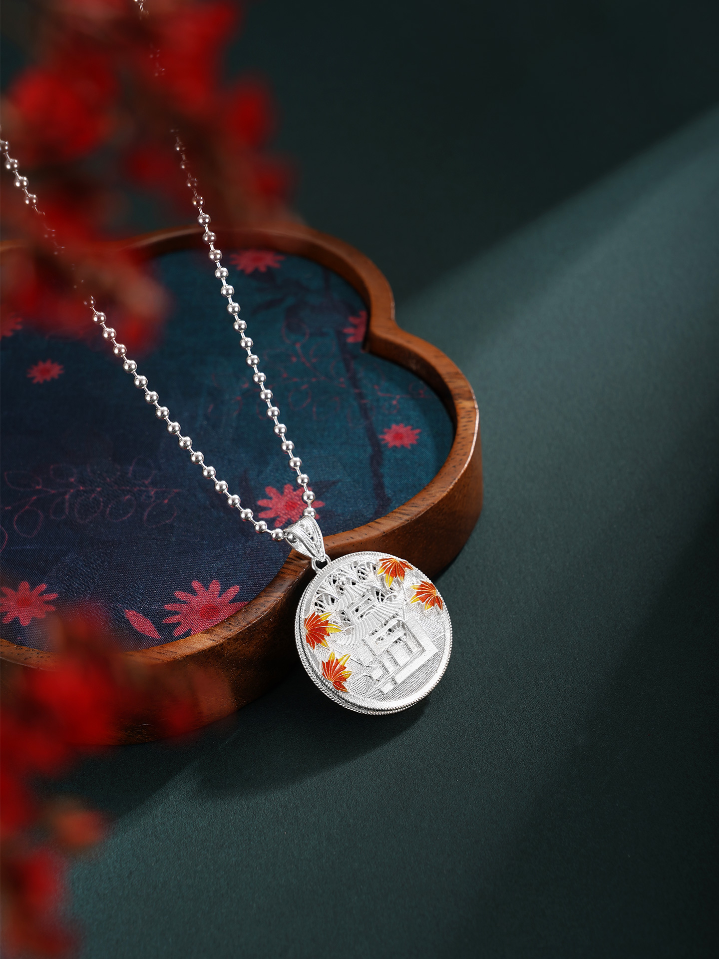 【寓意】:精选990足银,采用非遗银花丝工艺精制而成。“停车坐爱枫林晚,霜叶红于二月花”,枫叶与爱晚亭共生共融,红叶景观尽显长沙的本色,作品灵感源自爱晚亭的枫叶。巧妙地将“长沙”二字与爱晚亭的形象糅合变形,组成吊坠的主体,形成错落有致、古形古意的效果。枫叶环绕,珐琅彩着色,形成秋意冉冉的温柔景象。背面以花丝工艺编织水波纹,致敬纯至美的太平盛世。