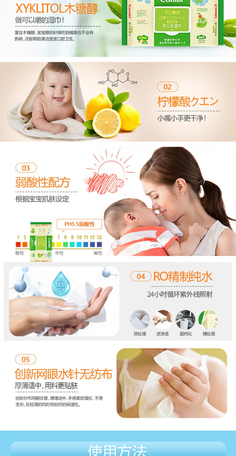 【59元6包】Combi康贝婴儿手口专用婴幼儿柔湿巾儿童宝宝纯水湿纸巾80片6包 CBI-8110