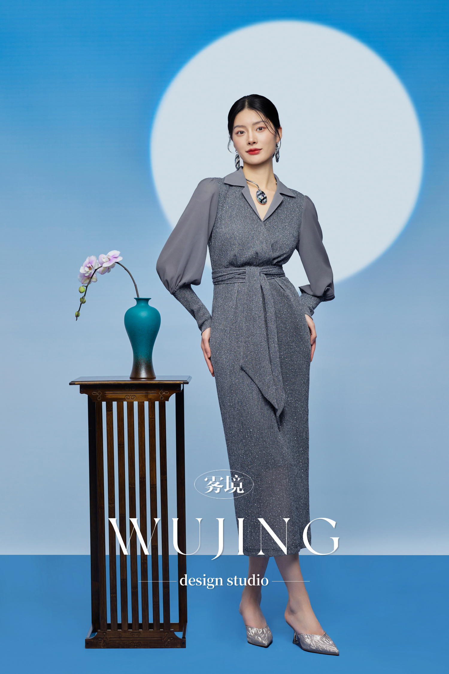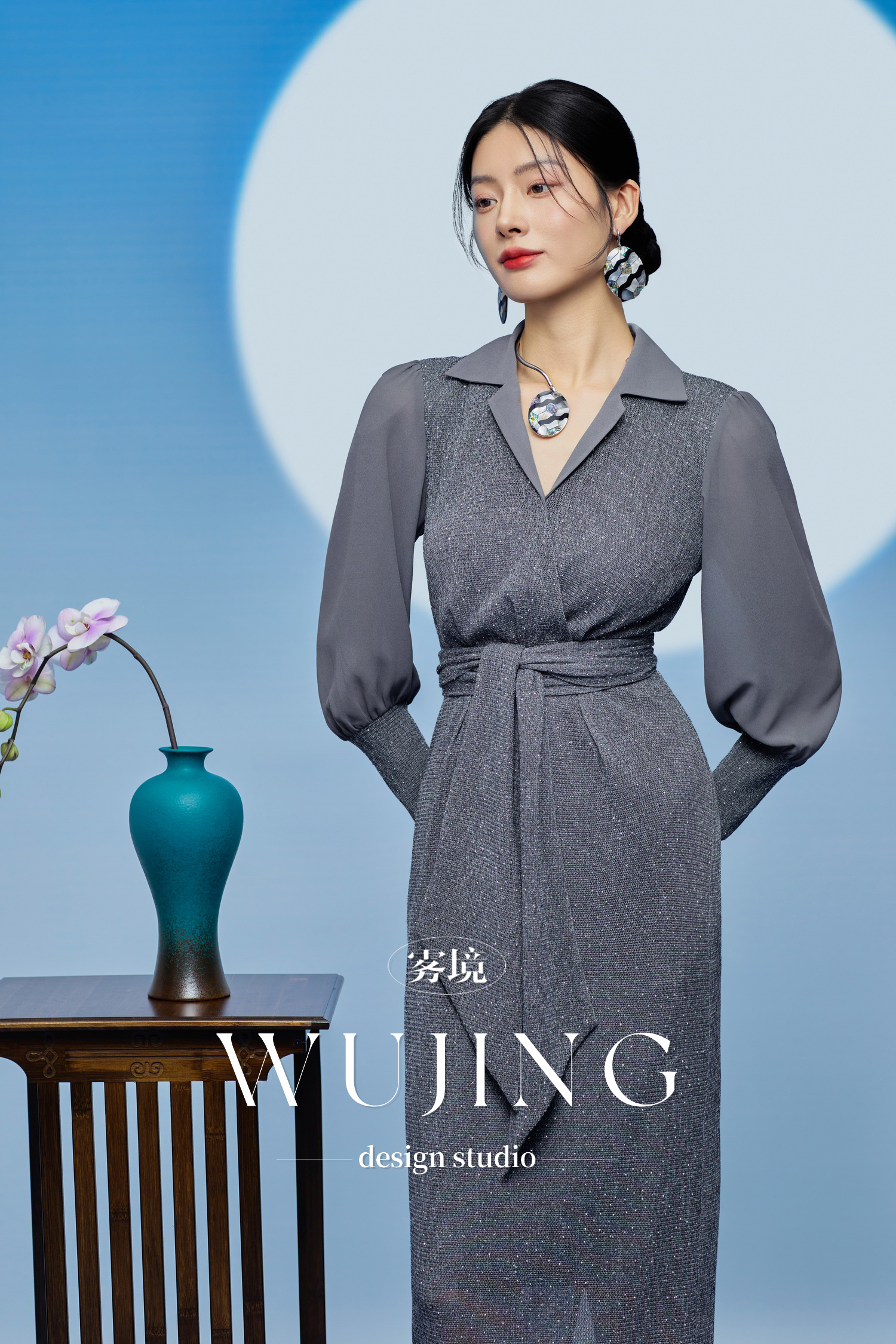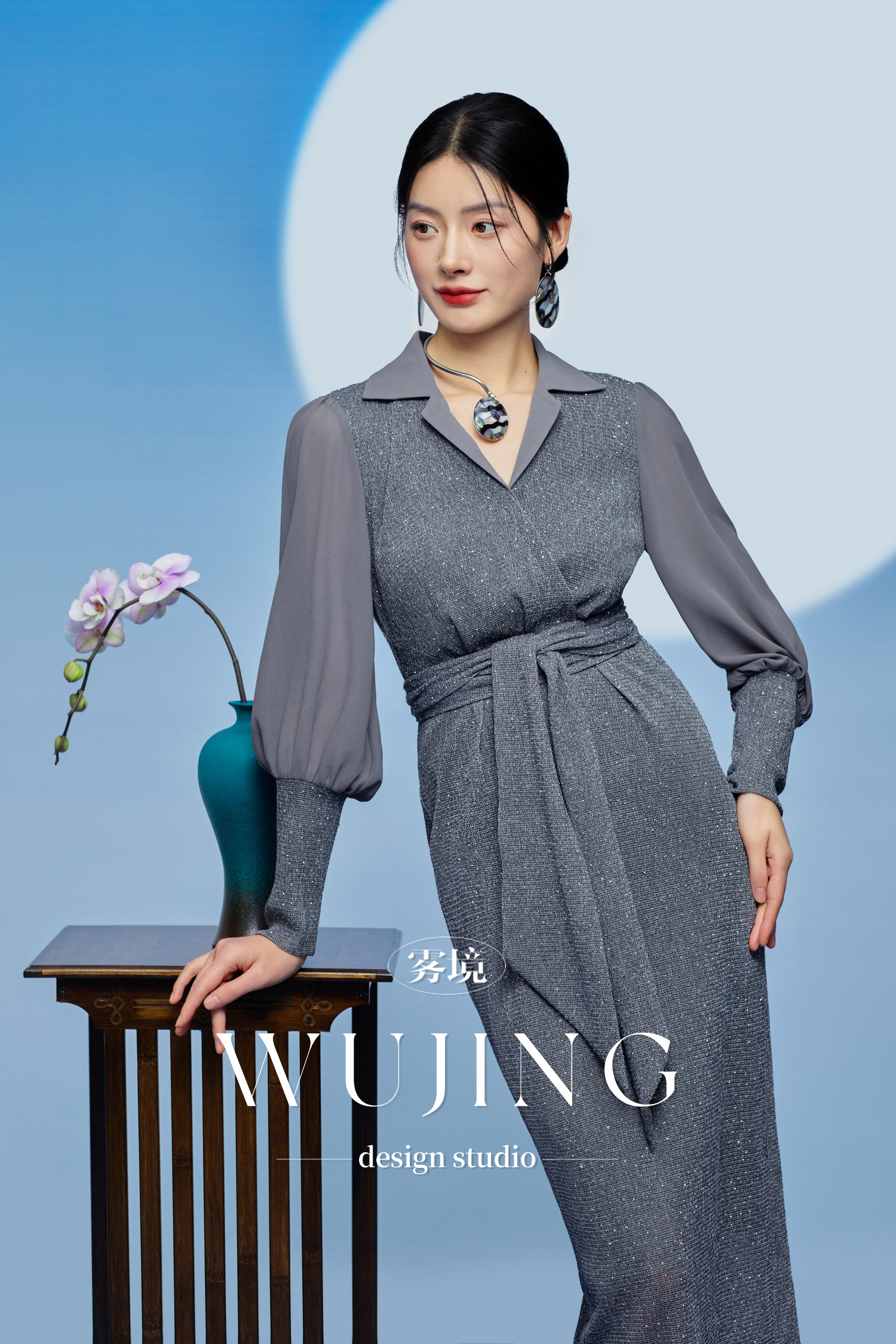 3205184 烟岚云岫 重工烫钻植绒弹力料/韩国进口水晶乔其纱连衣裙 雾境