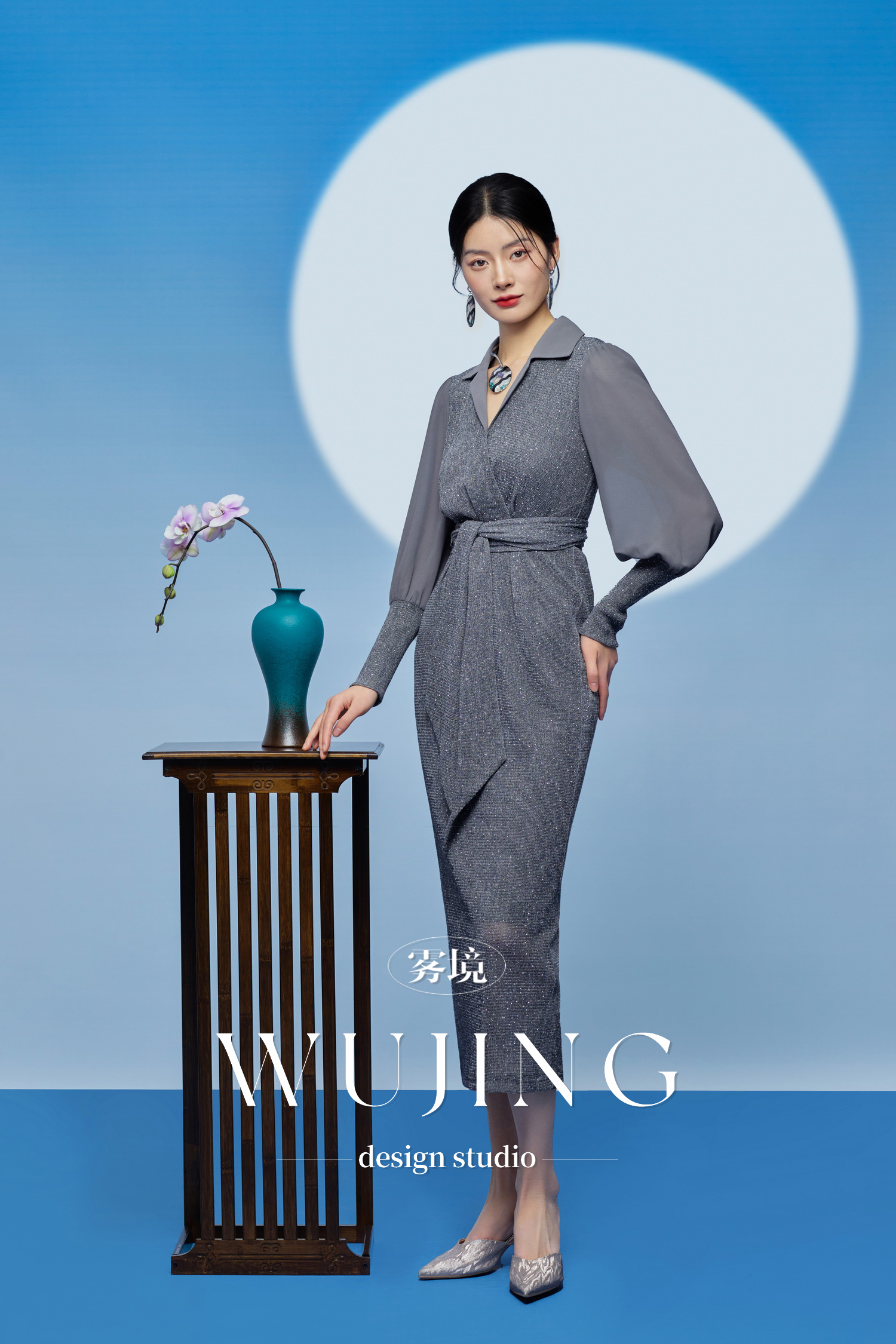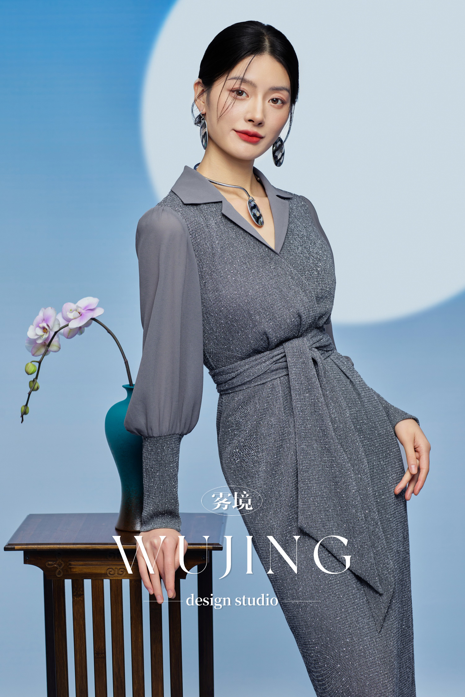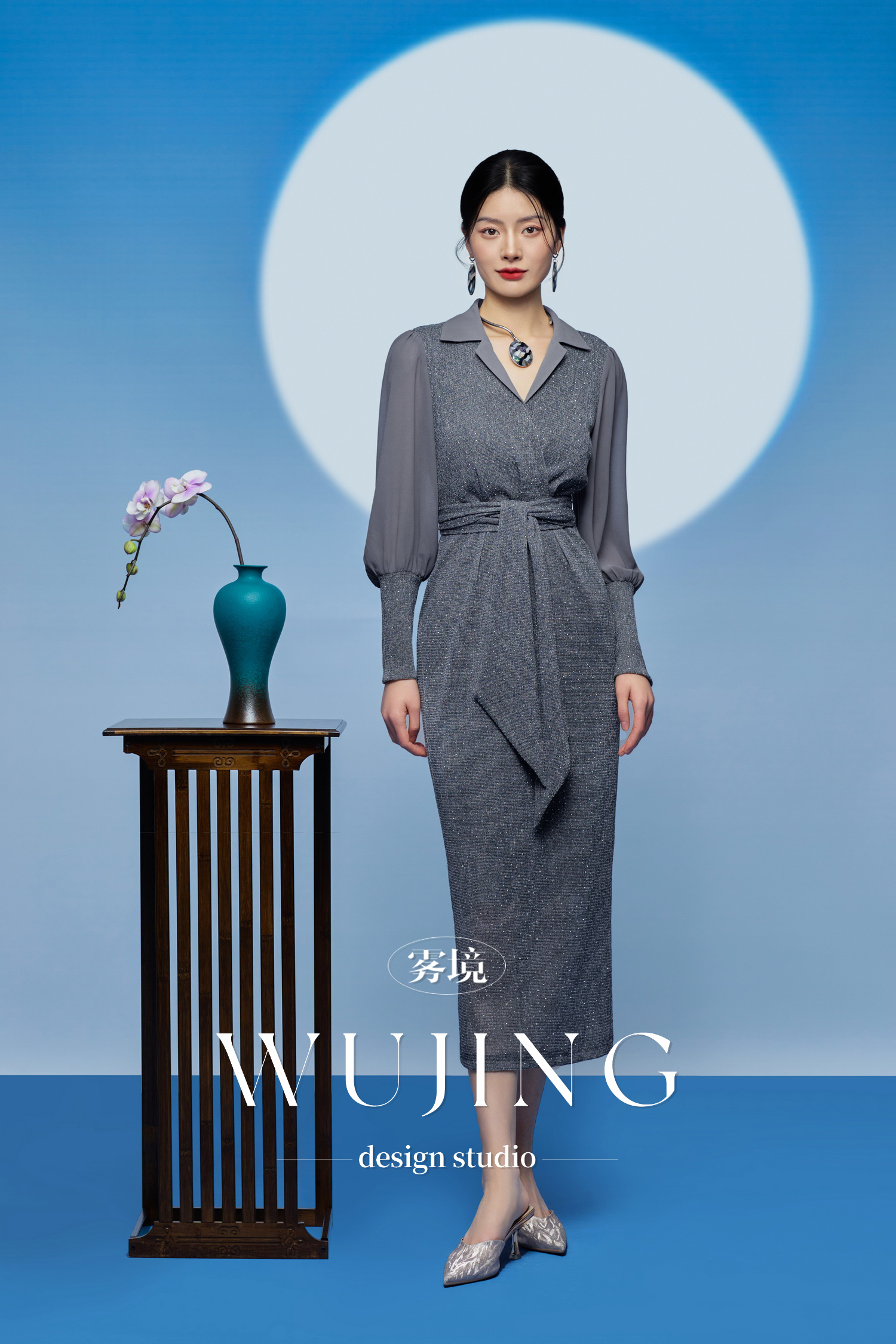 3205184 烟岚云岫 重工烫钻植绒弹力料/韩国进口水晶乔其纱连衣裙 雾境