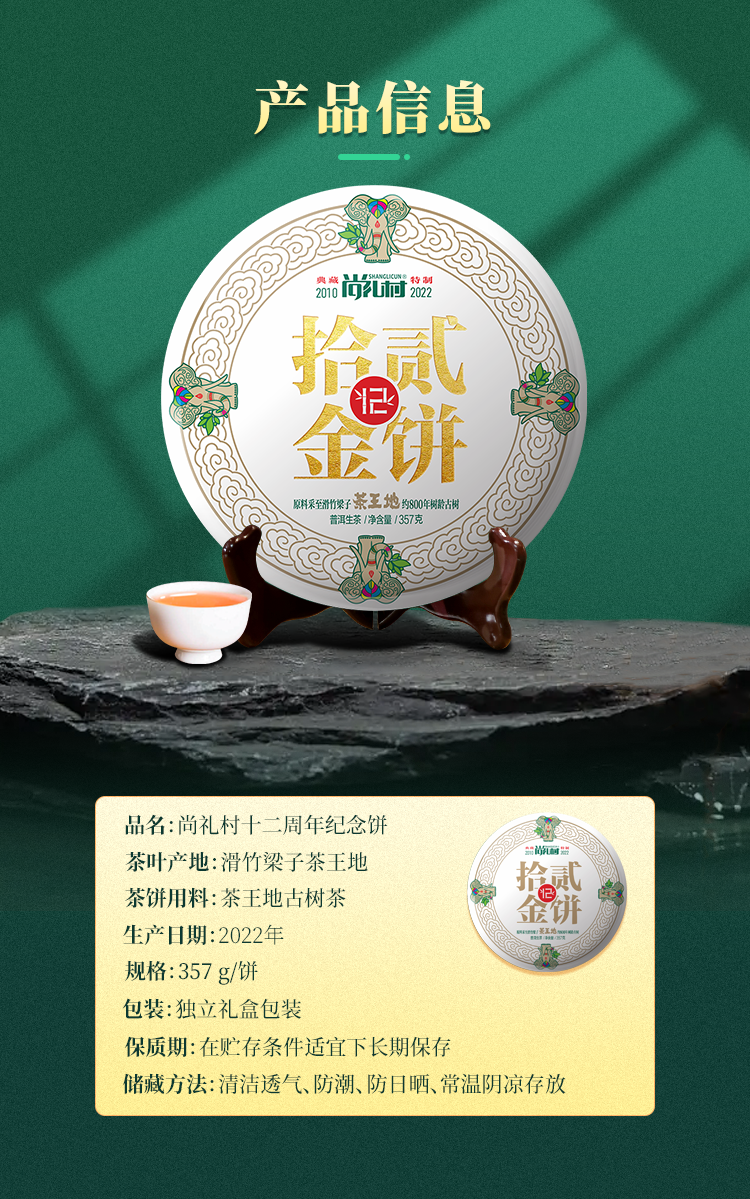 尚礼村2022年拾贰金饼滑竹梁子茶王地800年古树原料普洱生茶357g