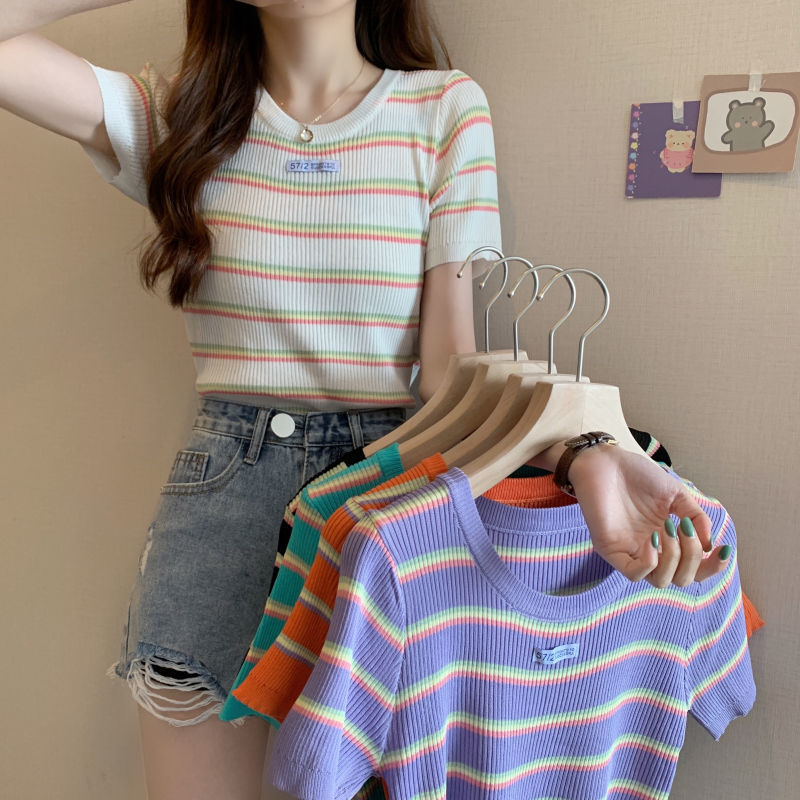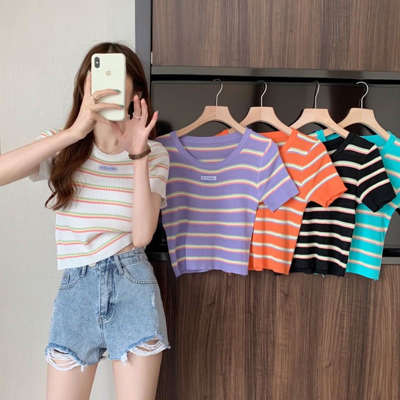 黛唯梵三木子快时尚女装~新款韩版条纹百搭修身显瘦圆领短袖针织上衣女