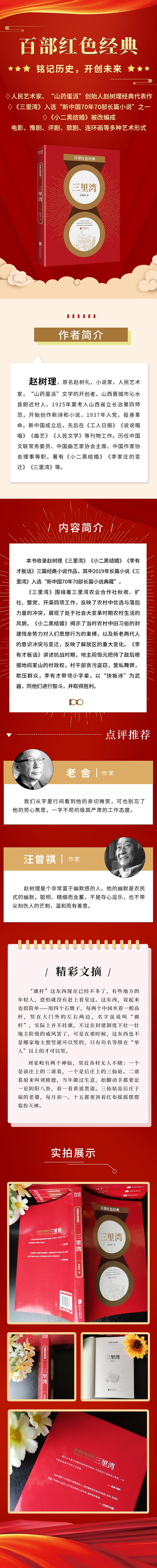 本书收录赵树理《三里湾》《小二黑结婚》《李有才板话》三篇经典小说作品,其中2019年长篇小说《三里湾》入选“新中国70年70部长篇小说典藏”。《三里湾》围绕着三里湾农业合作社秋收、扩社、整党、开渠四项工作,反映了农村中优选与落后力量的冲突,展现了处于社会大变革时期农村生活的风貌。《小二黑结婚》揭示了当时农村中旧习俗的封建残余势力对人们思想行为的束缚,以及新老两代人的意识冲突与变迁,反映了解放区的重大变化。《李有才板话》讲述抗战时期,地主阎恒元把持了敌后根据地阎家山的村政权,村干部贪污盗窃,营私舞弊,欺压群众,李有才带领小字辈,以“快板诗”为武器,同他们进行智斗,并取得胜利。