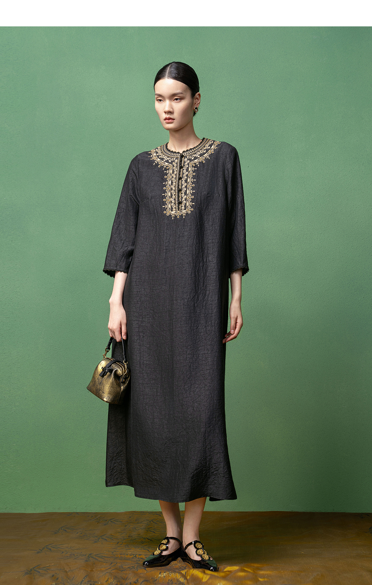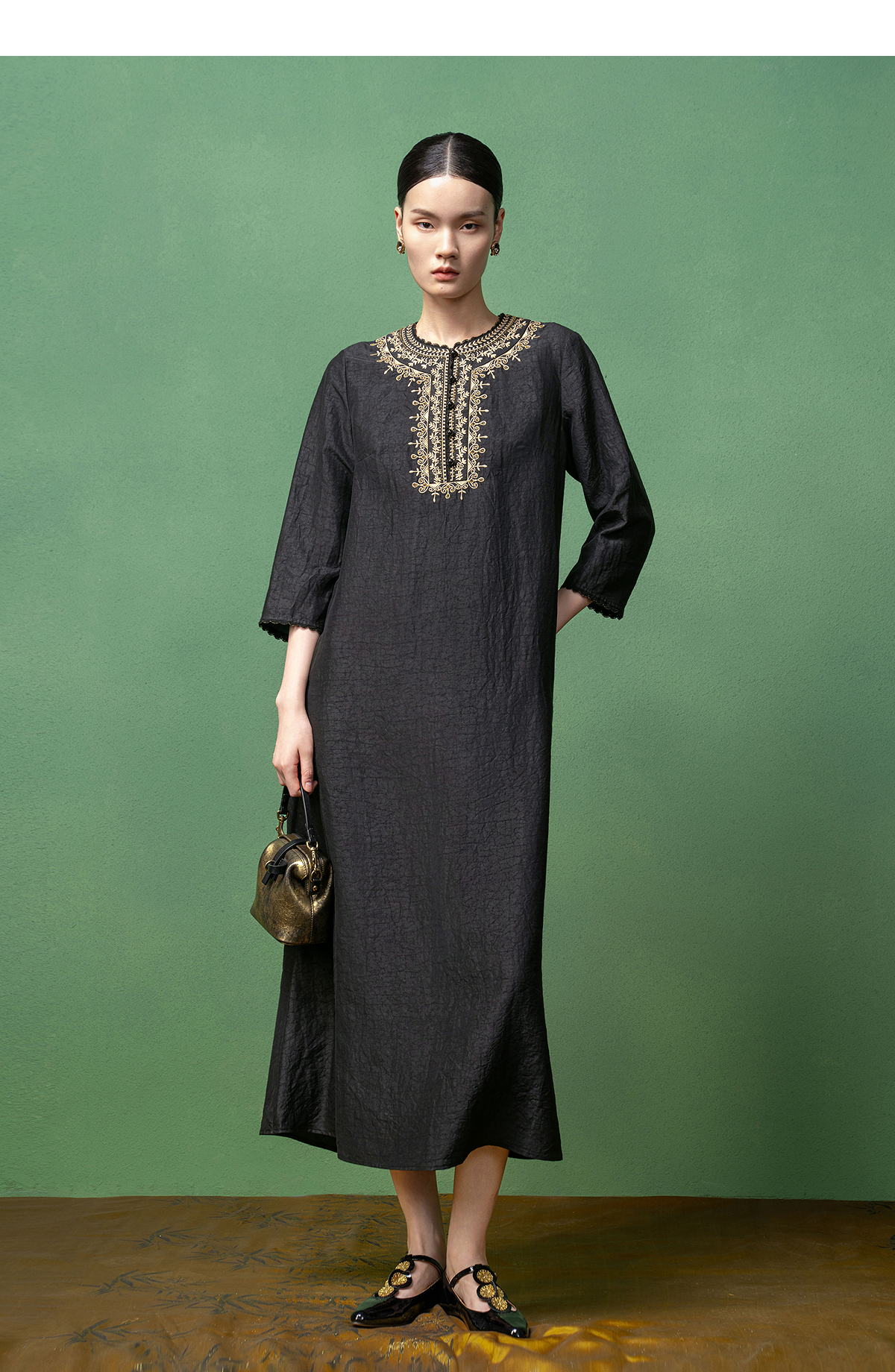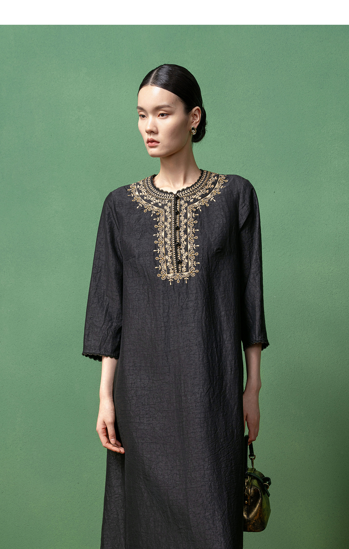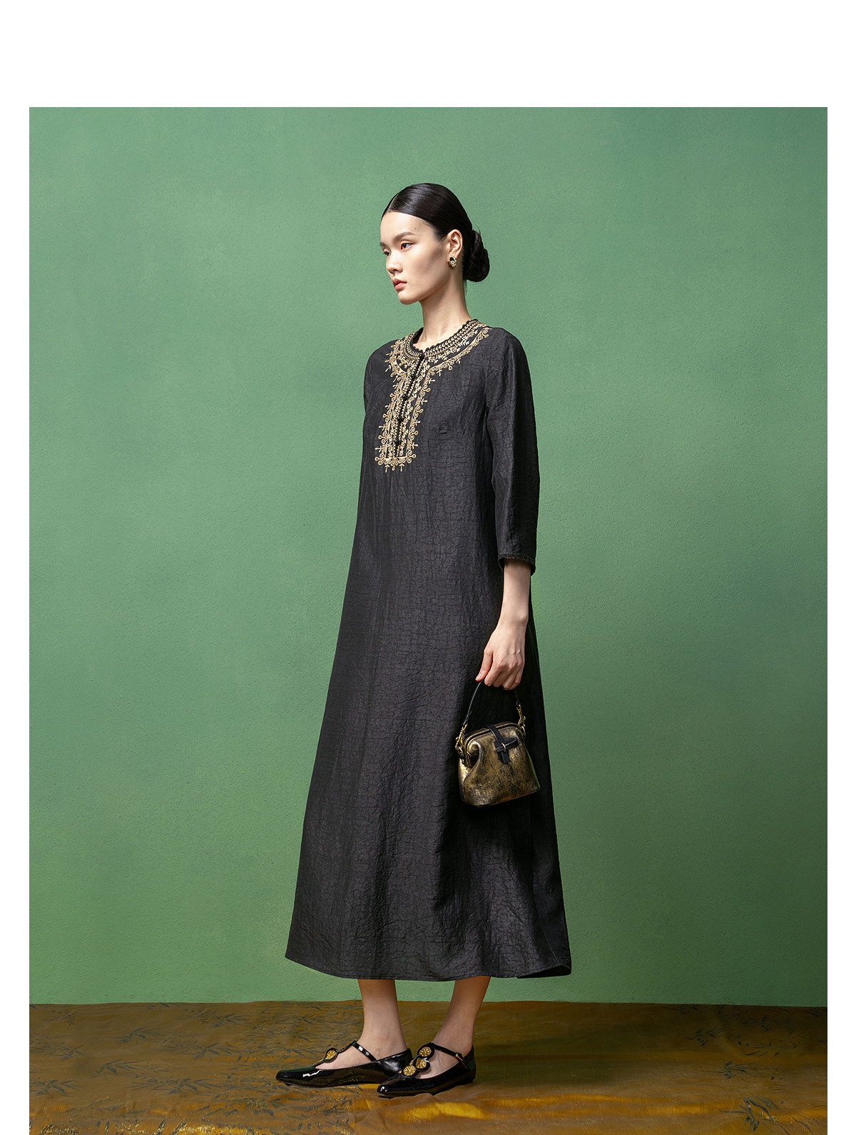 【林栖设计小店】【非遗香云纱】生活在左桑蚕丝连衣裙绣花钉珠2025秋季新款长裙女1953318