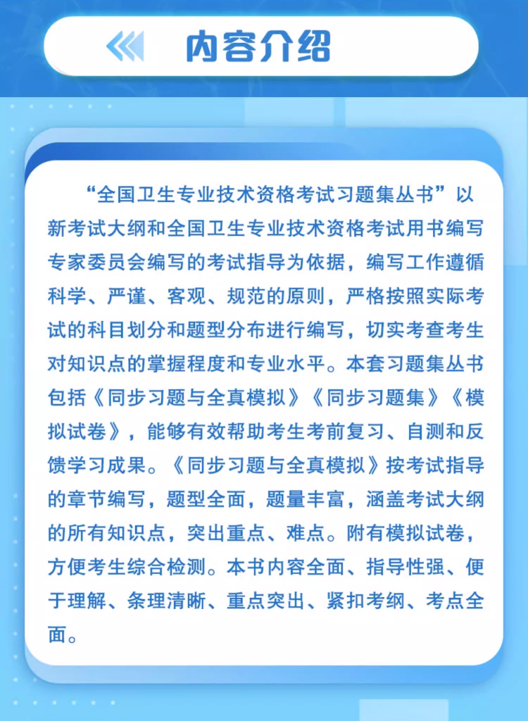 “全国卫生专业技术资格考试习题集丛书”以最新考试大纲和全国卫生专业技术资格考试用书编写专家委员会编写的考试指导为依据,编写工作遵循科学、严谨、客观、规范的原则,严格按照实际考试的科目划分和题型分布进行编写,切实考查考生对知识点的掌握程度和专业水平。本套习题集丛书包括《同步习题与全真模拟》《同步习题集》《模拟试卷》,能够有效帮助考生考前复习、自测和反馈学习成果。《同步习题与全真模拟》按考试指导的章节编写,题型全面,题量丰富,涵盖考试大纲的所有知识点,突出重点、难点。附有模拟试卷,方便考生综合检测。