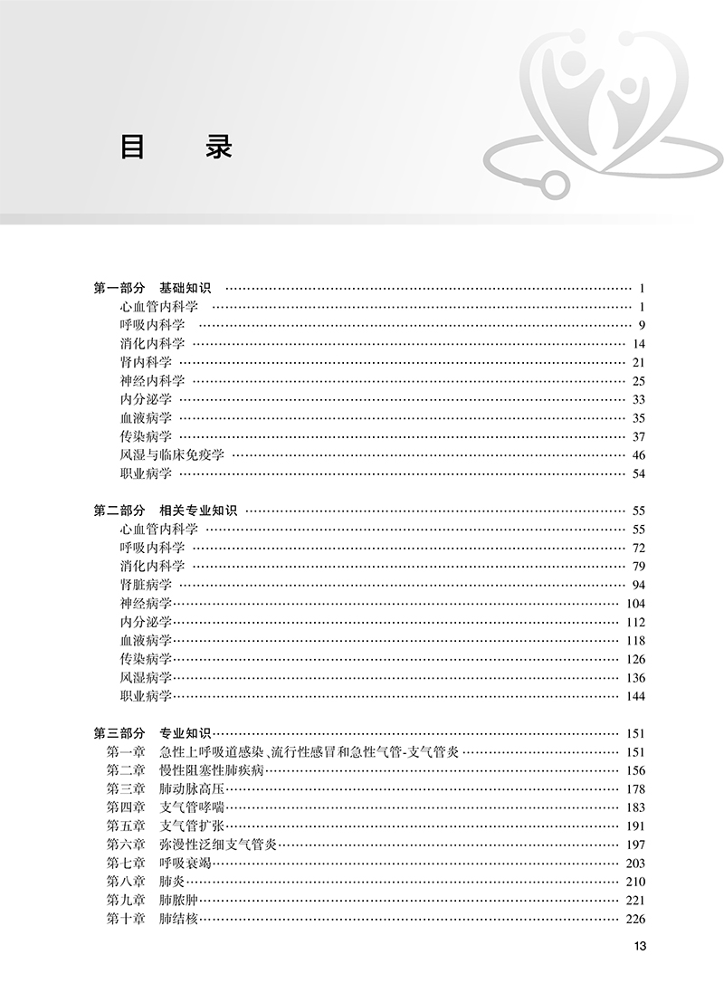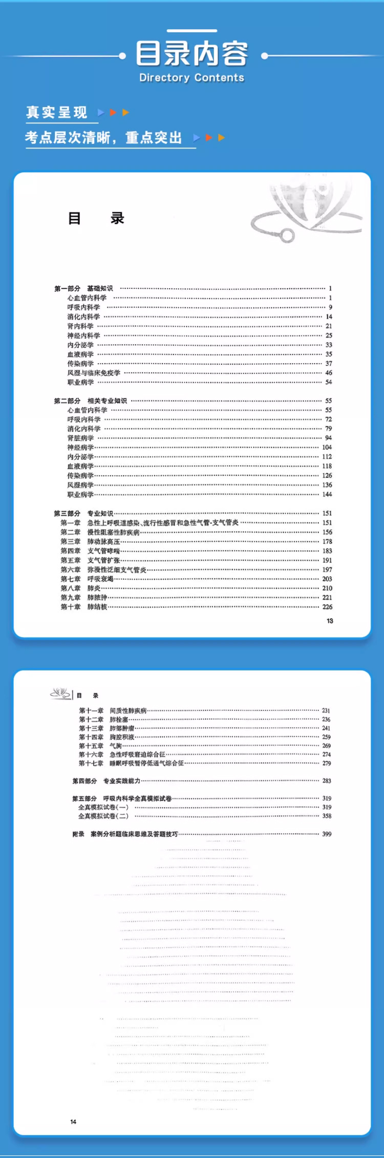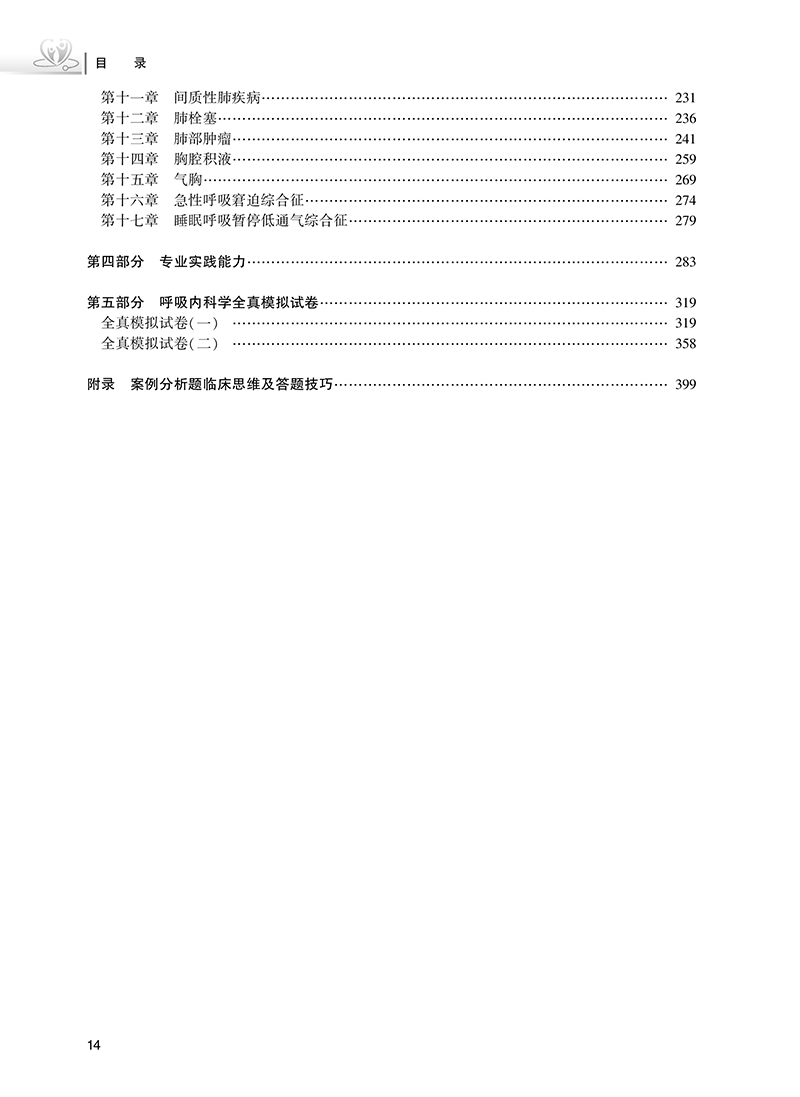 第一部分 基础知识 / 1 心血管内科学 / 1 呼吸内科学 / 9 消化内科学 / 14 肾内科学 / 21 神经内科学 / 25 内分泌学 / 33 血液病学 / 35 传染病学 / 37 风湿与临床免疫学 / 46 职业病学 / 54 第二部分 相关专业知识 / 55 心血管内科学 / 55 呼吸内科学 / 72 消化内科学 / 79 肾脏病学 / 94 神经病学/ 104 内分泌学/ 112 血液病学/ 118 传染病学/ 126 风湿病学/ 136 职业病学/ 144 第三部分 专业知识/ 151 第一章 急性上呼吸道感染、流行性感冒和急性气管 ̄支气管炎/ 151 第二章 慢性阻塞性肺疾病/ 156 第三章 肺动脉高压/ 178 第四章 支气管哮喘/ 183 第五章 支气管扩张/ 191 第六章 弥漫性泛细支气管炎/ 197 第七章 呼吸衰竭/ 203 第八章 肺炎/ 210 第九章 肺脓肿/ 221 第十章 肺结核/ 226 第十一章 间质性肺疾病/ 231 第十二章 肺栓塞/ 236 第十三章 肺部肿瘤/ 241 第十四章 胸腔积液/ 259 第十五章 气胸/ 269 第十六章 急性呼吸窘迫综合征/ 274 第十七章 睡眠呼吸暂停低通气综合征/ 279 第四部分 专业实践能力/ 283 第五部分 呼吸内科学全真模拟试卷/ 319 全真模拟试卷(一) / 319 全真模拟试卷(二) / 358 附录 案例分析题临床思维及答题技巧/ 399
