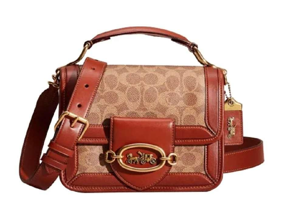COACH 蔻驰 Hero 22 经典老花帆布配皮拼色马车扣顶部手柄翻盖手提单肩斜挎包 小号 女款 棕红老花色