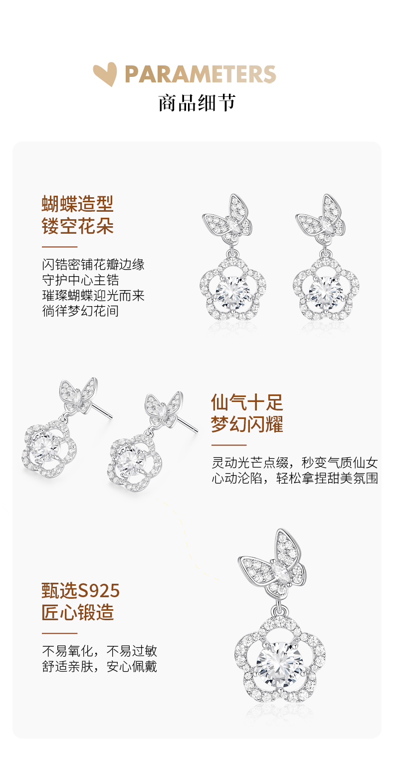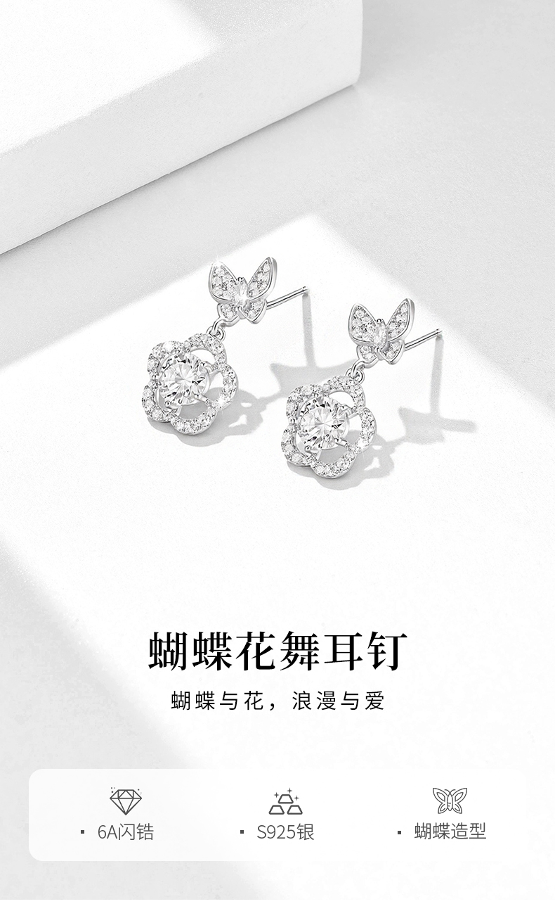 卡蒂罗KADER 蝴蝶花舞耳钉 925银蝴蝶满镶闪锆镂空花朵炽热心动设计耳饰 优雅气质穿搭配饰甜美可爱