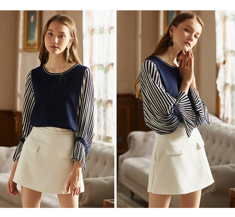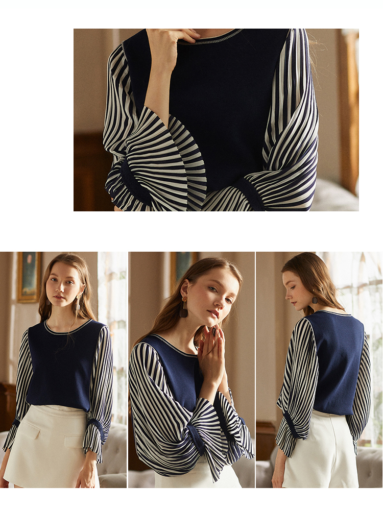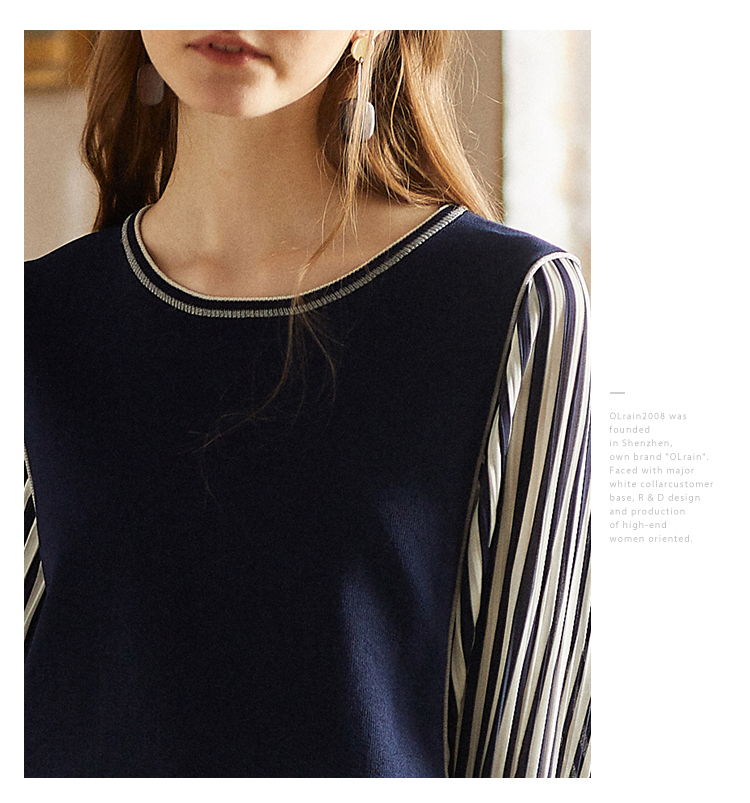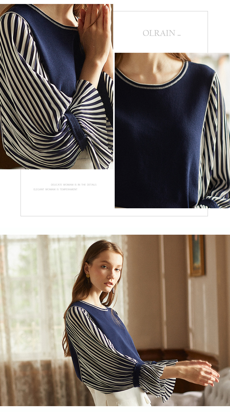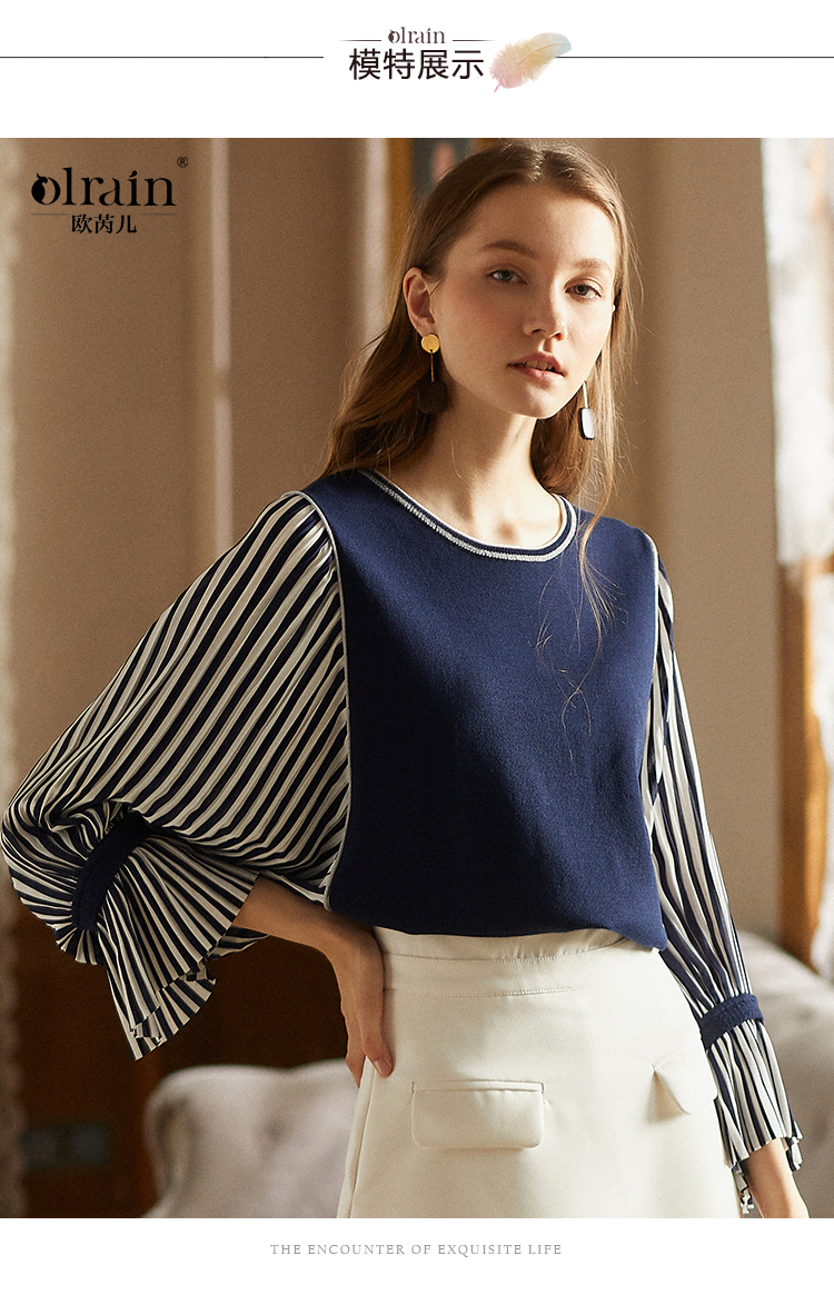 欧芮儿2018秋装新款预宽松显瘦喇叭袖条纹拼接毛针织衫女[促]
