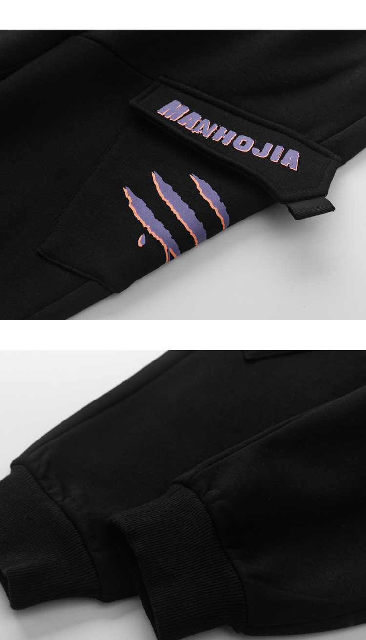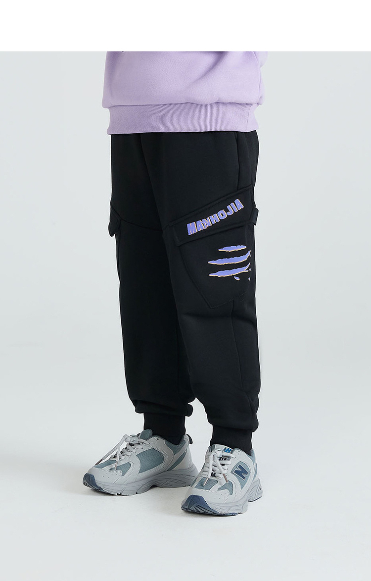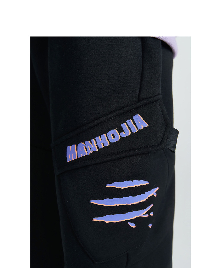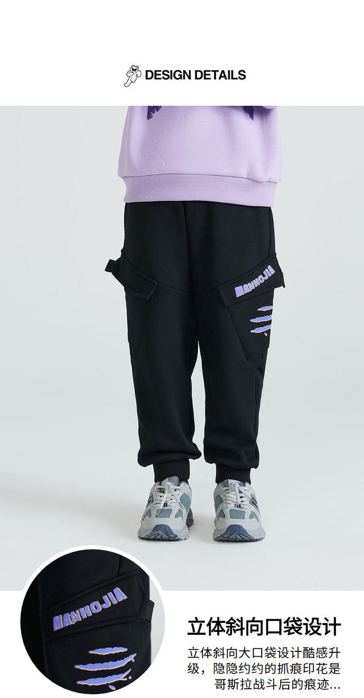 马拉丁潮牌漫画家童装裤子冬季新品立体斜向大口袋抓痕印花工装裤