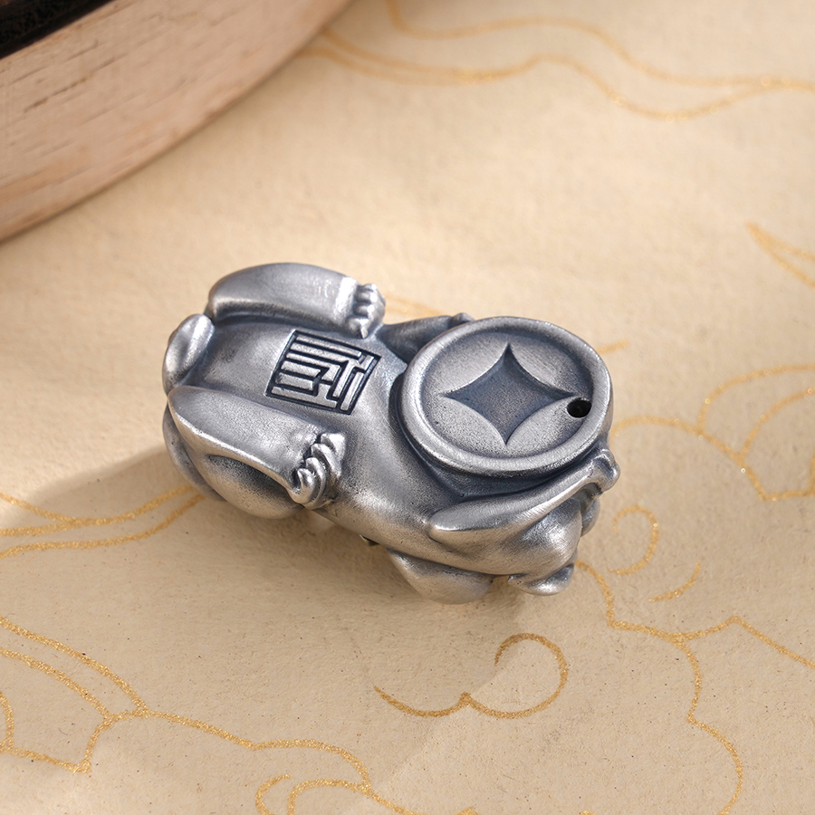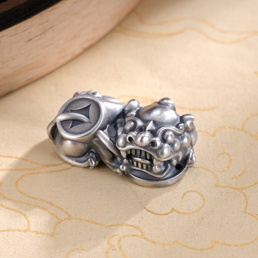 【寓意】:作品灵感源自貔貅,纯银材质,饱满立体。浮雕錾刻铜钱图案,再配以仿古做旧工艺,明暗掩映,质感十足。寓意招财进宝,吉祥守护。