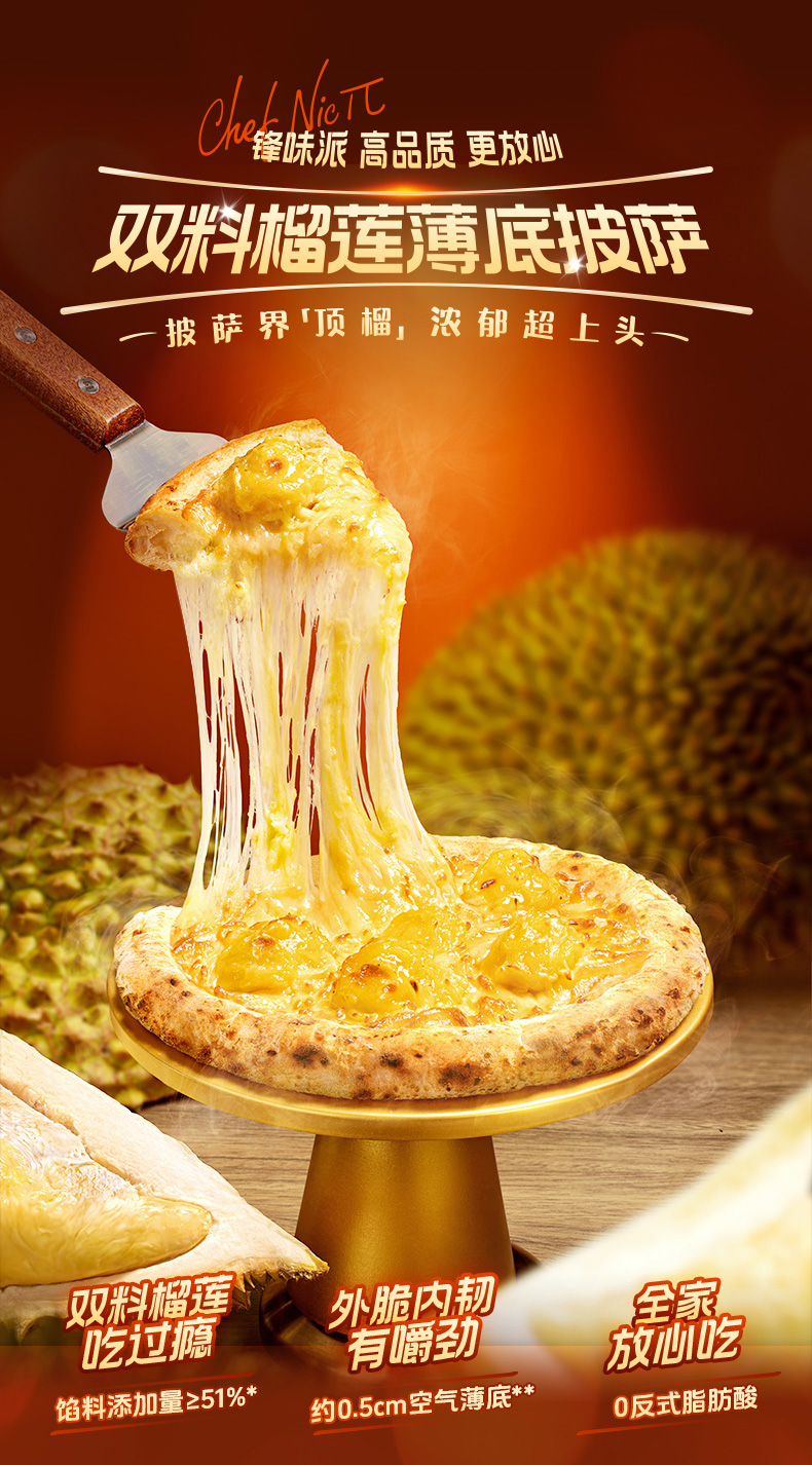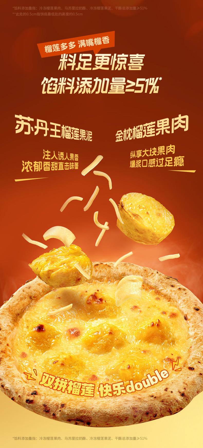 采用金枕榴莲果肉与苏丹王榴莲果泥双拼设计,果肉饱满香甜,细腻绵密;