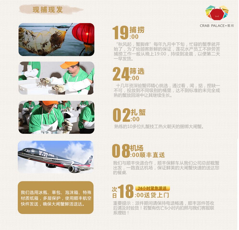 【注意事项】签收后第一时间验货,若有问题,请于3小时内拍照,解开绳子大闸 蟹和快递单合影拍照,单号必须清晰可见; • 客户留下错误地址、电话等信息,备注信息,导致货物不能正常送达 均不在售后范围内; • 大闸蟹发货后不允许改地址,鲜活产品发出后路途不允许有任何改动, 否则增加时长不售后; • 不支持拒收,拒收承担双倍运费; • 产品已经发出的情况下,不可更改地址、不退货,不拒收,下单前, 一定要留对信息,