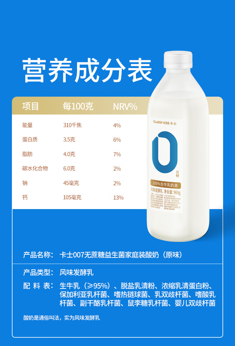 卡士/CLASSY-KISS 0蔗糖 益生菌原味酸奶 家庭装 969g(瓶)