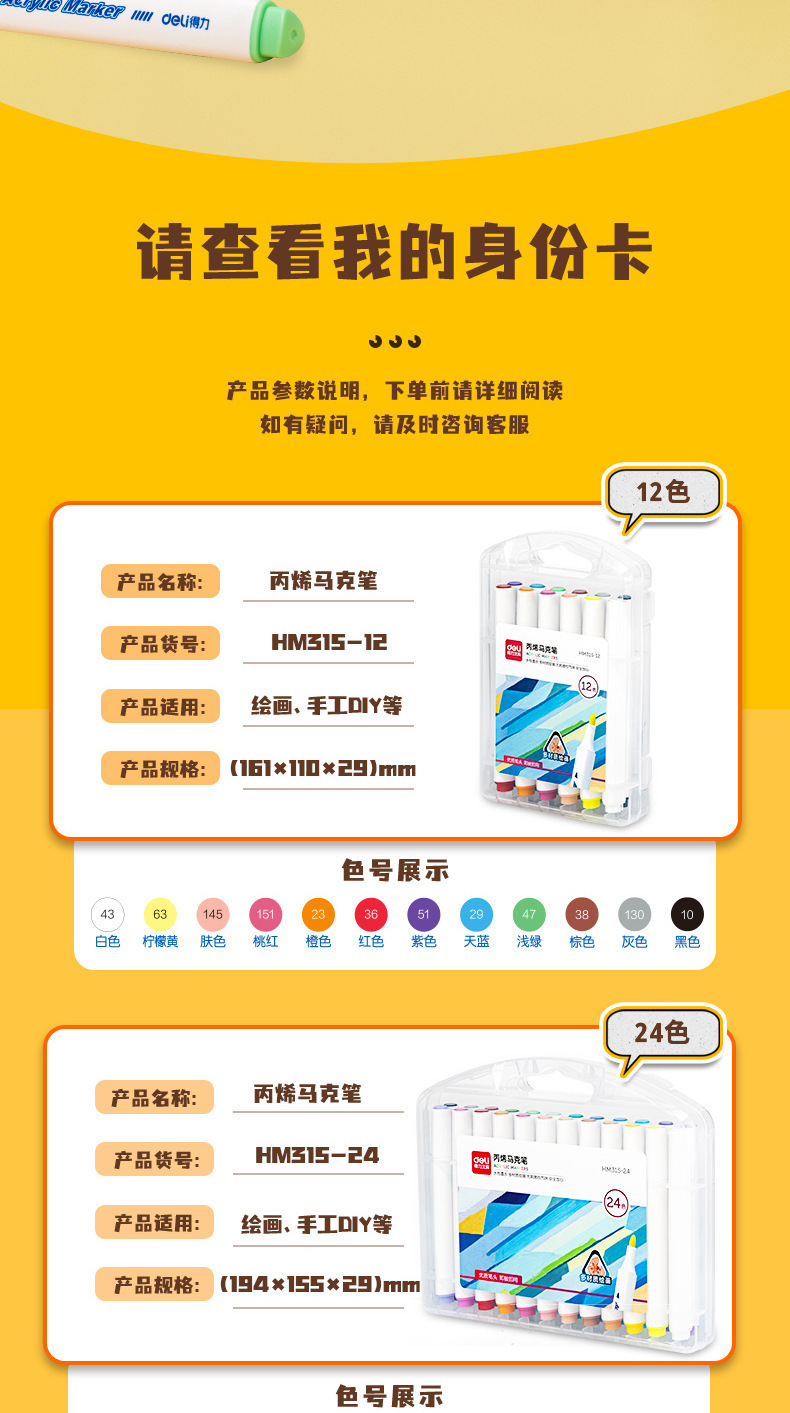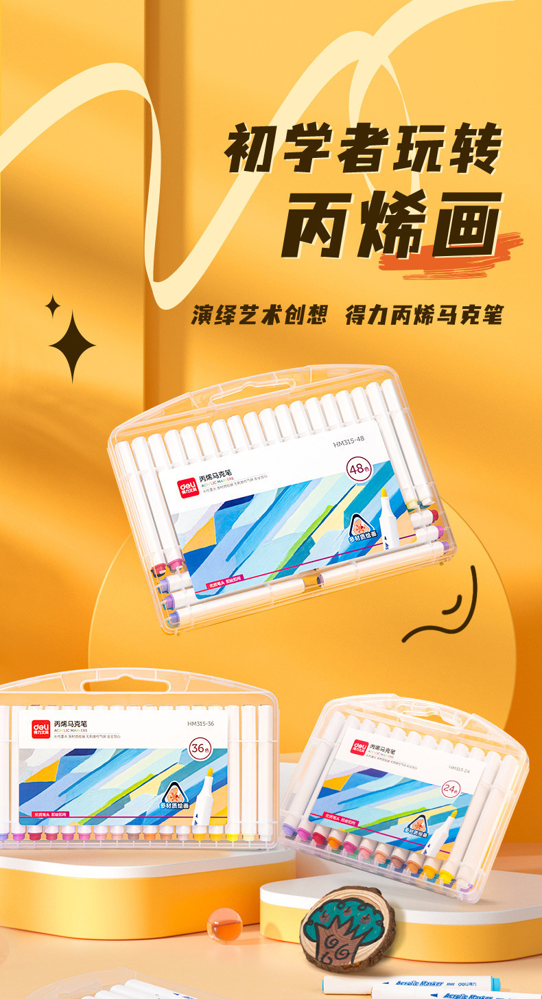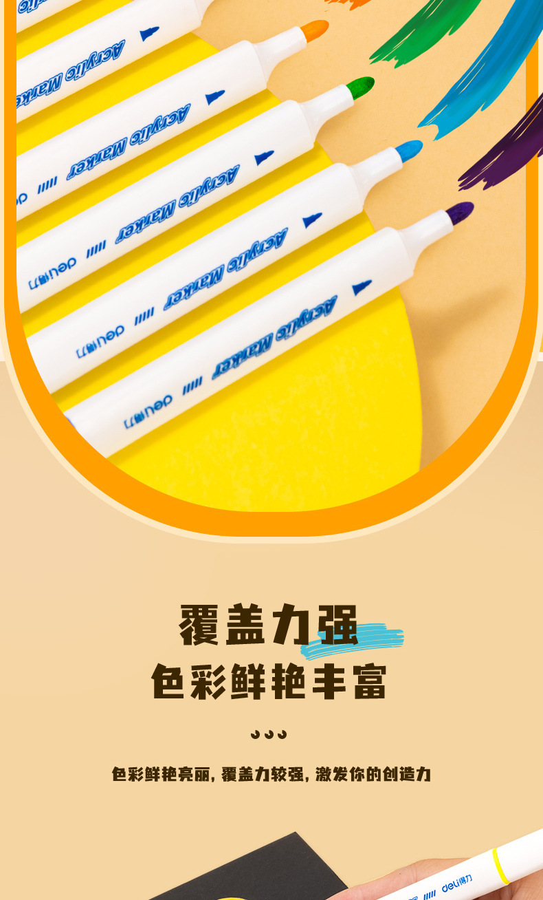 【Deli/得力文具!12/24/36/48色】得力丙烯马克笔,奶油般涂抹,色彩娇艳如梦。画出你的梦幻世界,儿童、学生皆可轻松驾驭。多材质随心涂鸦,水洗不褪色,用心创作每一笔。