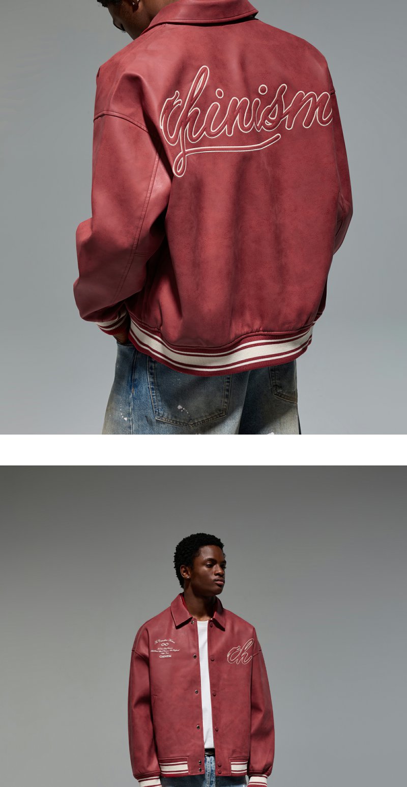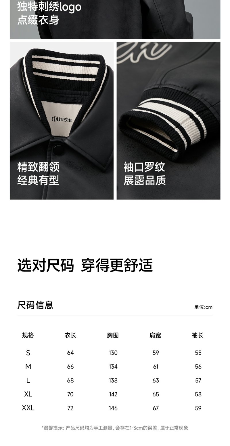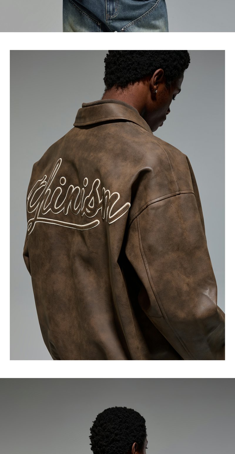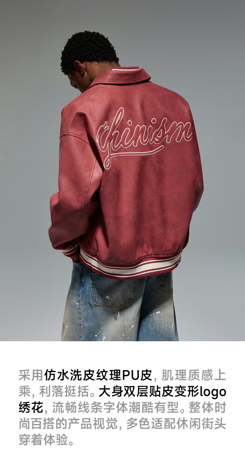 CHINISM赤尘 黑色复古翻领岩纹PU皮夹克男美式新款机车皮衣外套