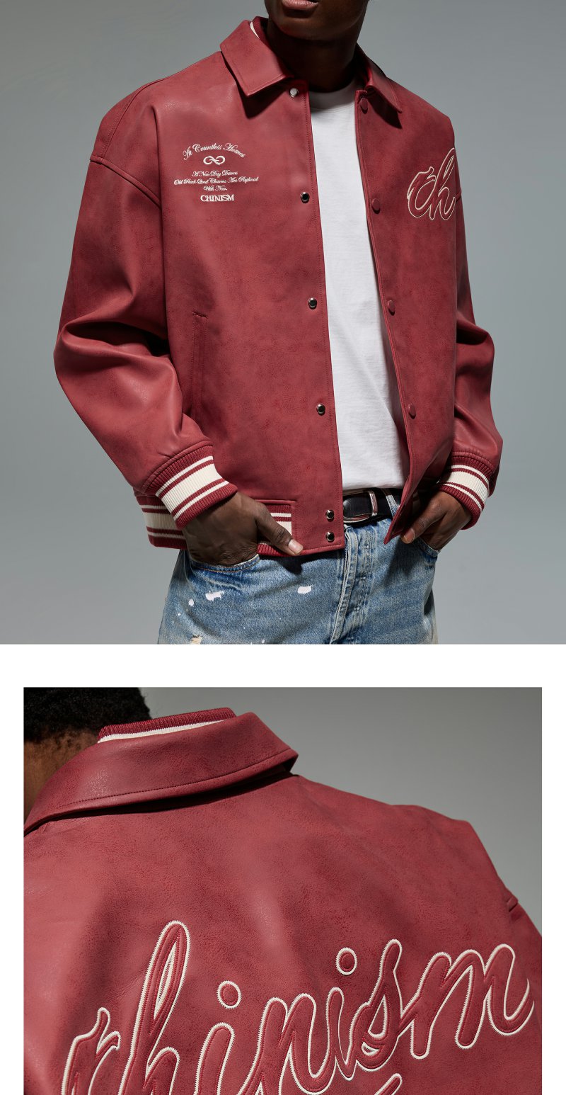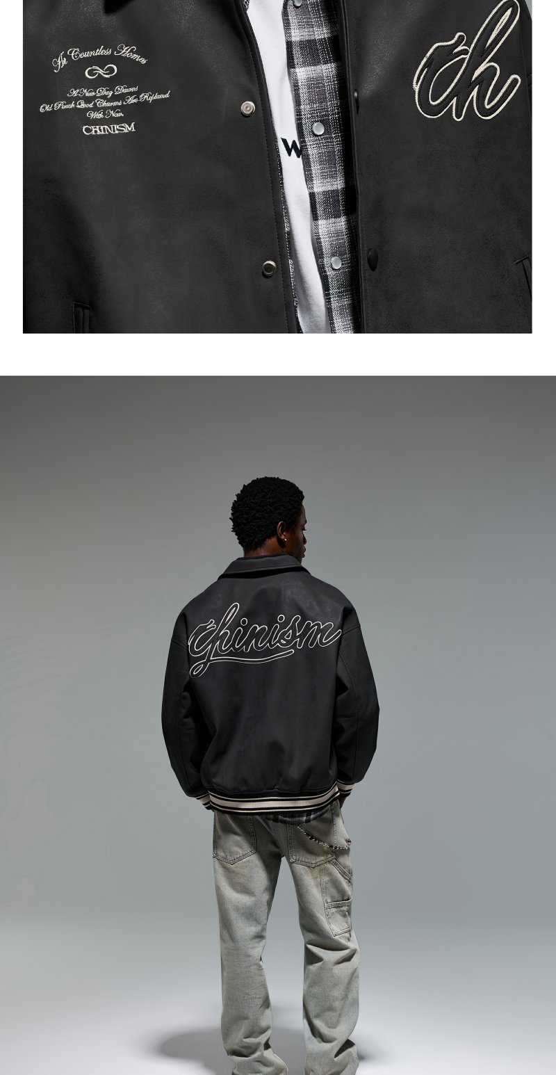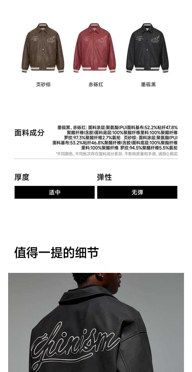 CHINISM赤尘 黑色复古翻领岩纹PU皮夹克男美式新款机车皮衣外套