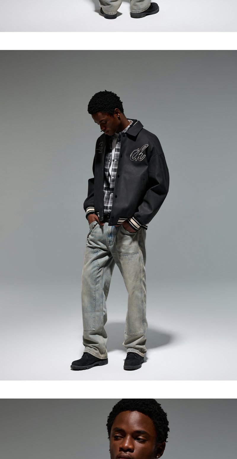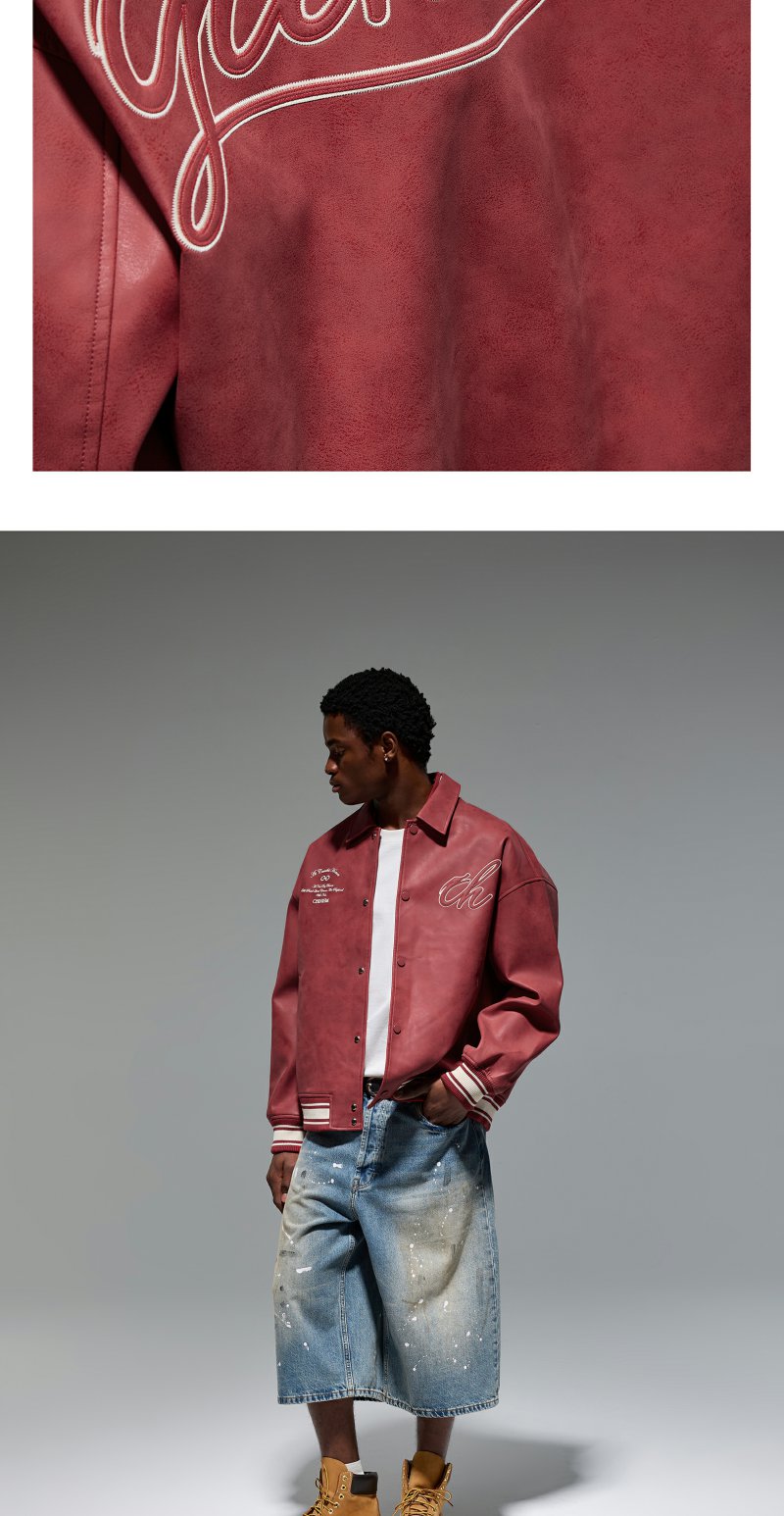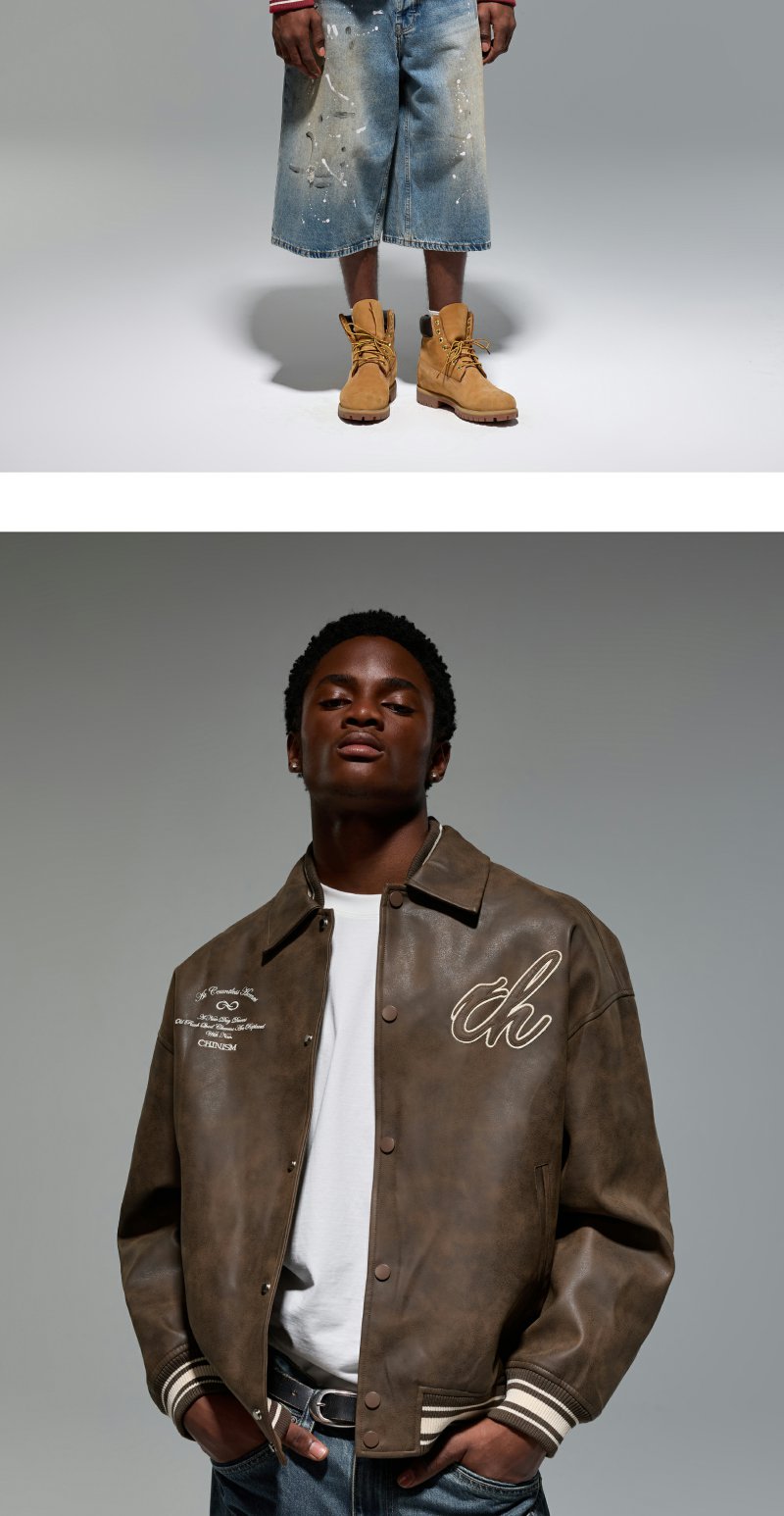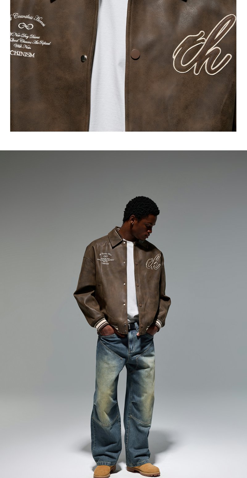 CHINISM赤尘 黑色复古翻领岩纹PU皮夹克男美式新款机车皮衣外套