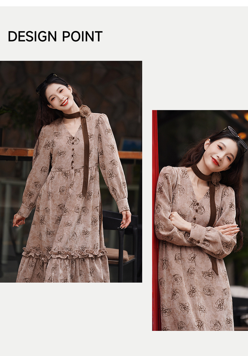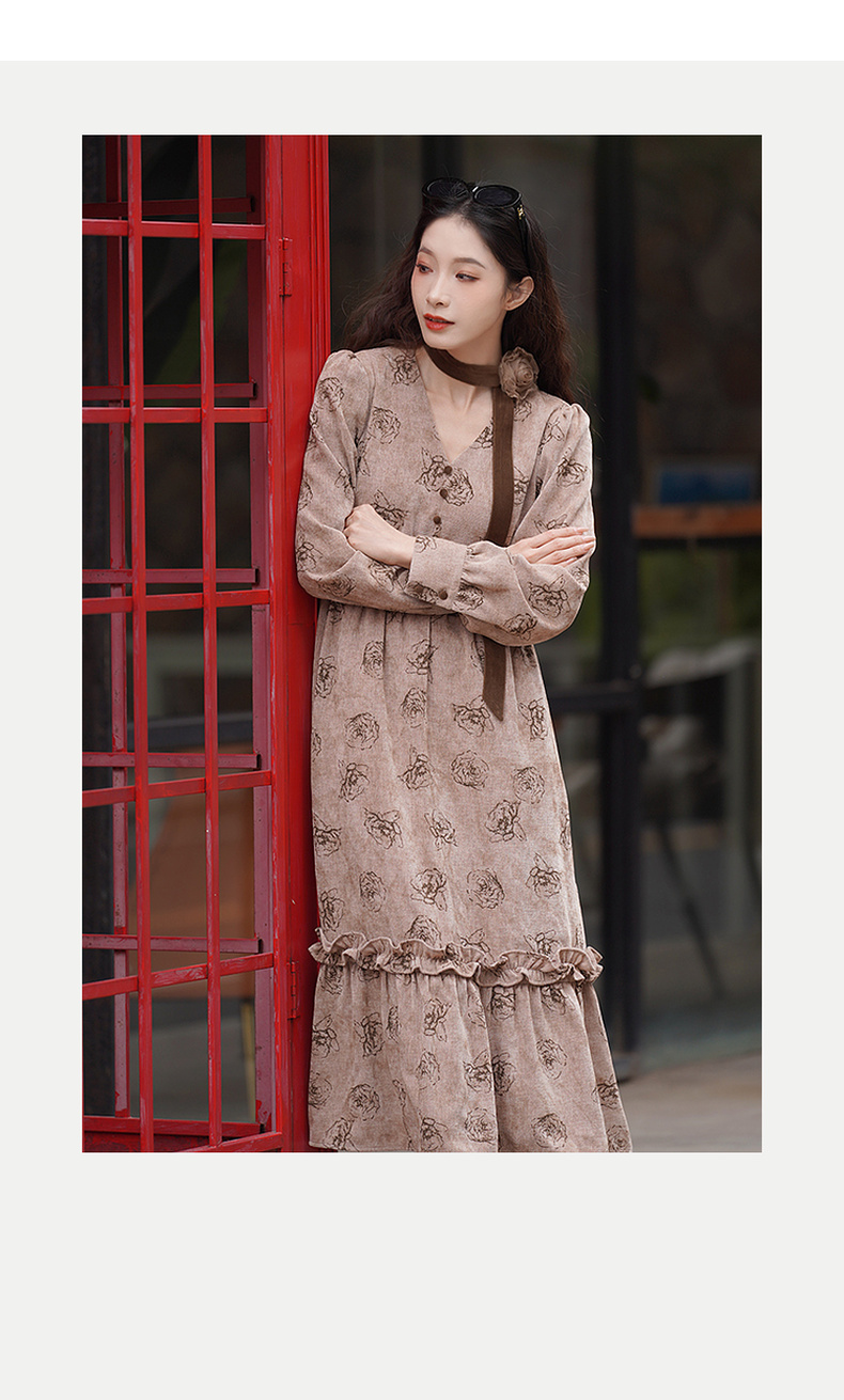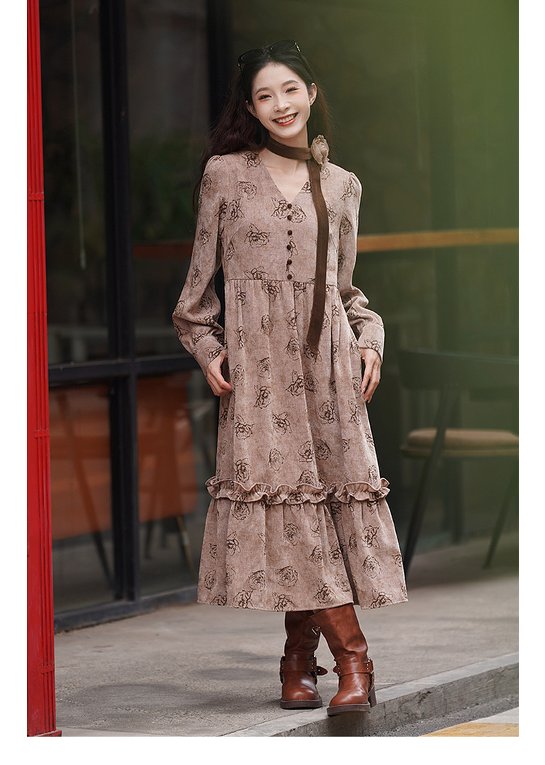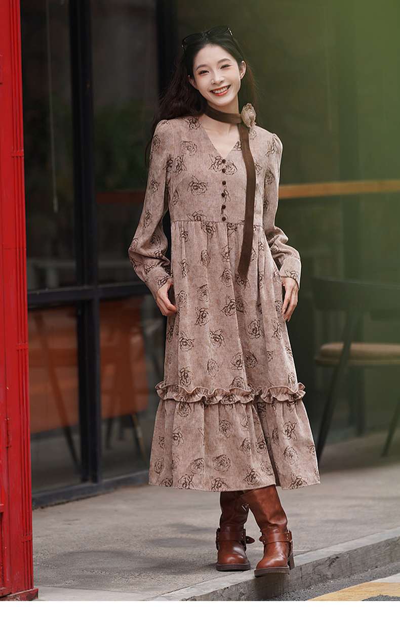 两三事沙漠玫瑰2024冬季新款森女风印花木耳边裙摆绑带a字连衣裙