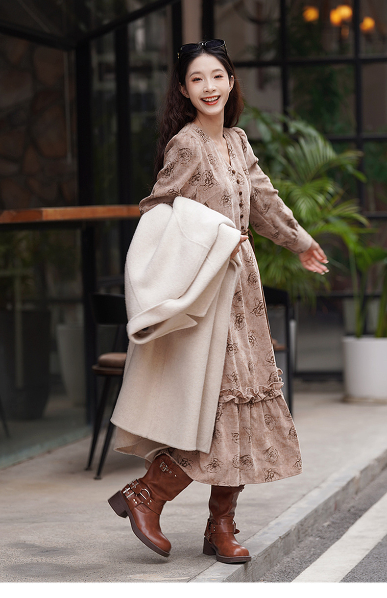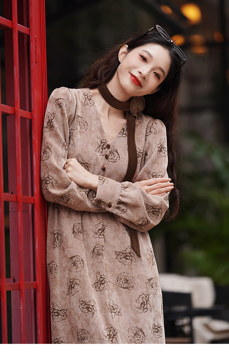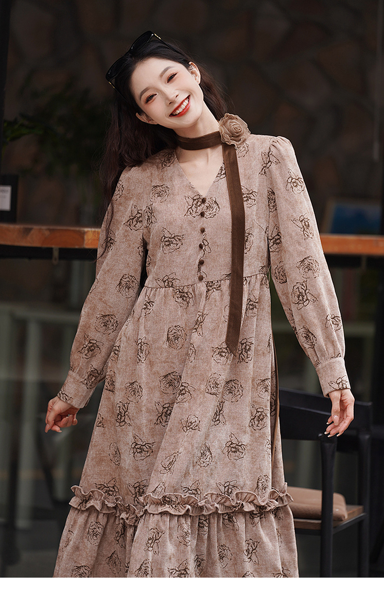 两三事沙漠玫瑰2024冬季新款森女风印花木耳边裙摆绑带a字连衣裙