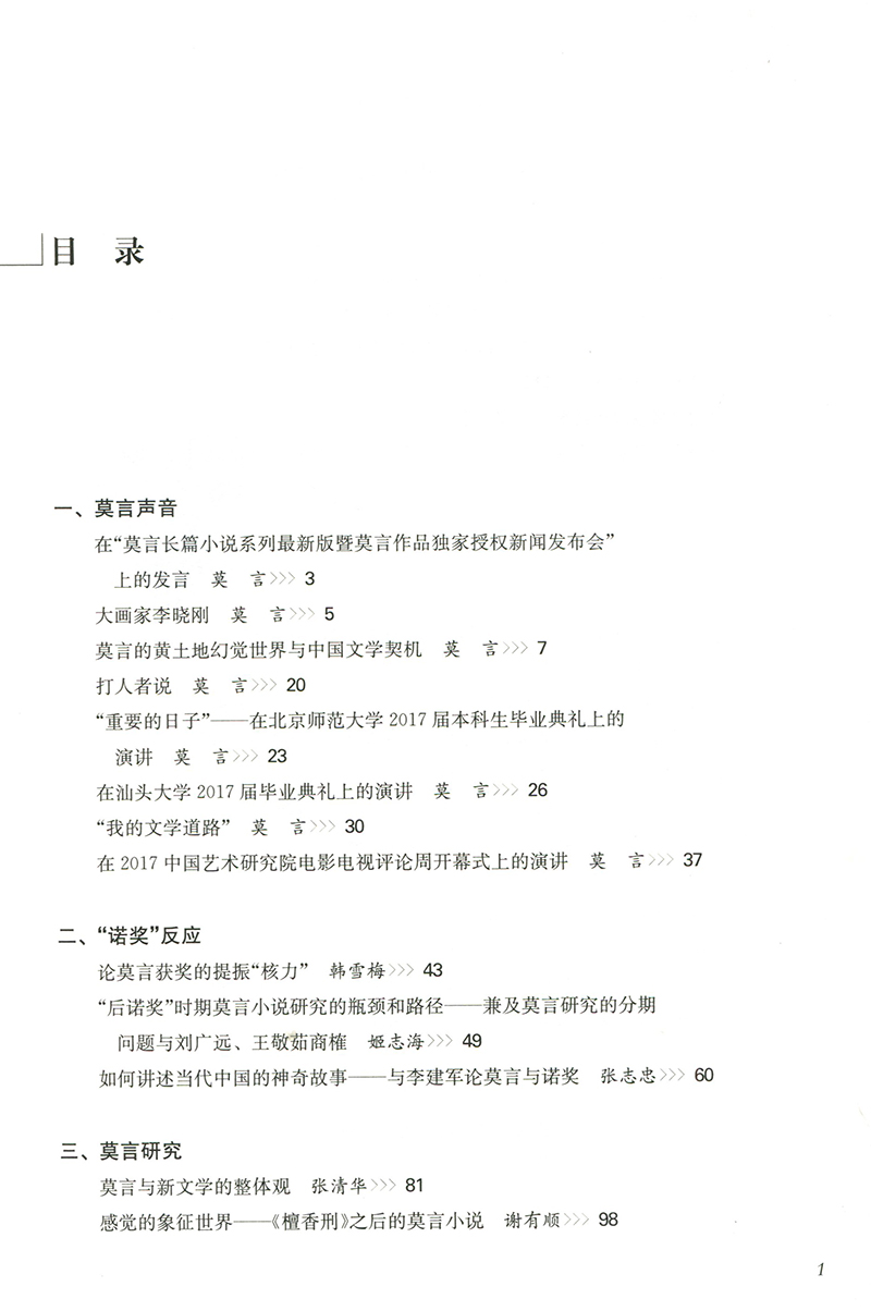 本年编旨在为莫言研究、文学史以及当代历史研究提供可参考的文献与资料。每年编选一卷,对莫言获诺贝尔文学奖之后的中文研究成果进行搜集和整理,以便观察和整体呈现中国当代文学在莫言研究方面的方法与成就。选文主要来源于各种学术期刊、专业报刊。年编的选文以文章内容的重要性和学术价值为标准,按照“莫言声音”“诺奖反应”“莫言研究”“媒体声音”四个部分组织选文,并附录莫言参与的文学对话、莫言研究的文章索引等,旨在全方位展现当年莫言研究的整体状况,为莫言研究奠定文献基础。