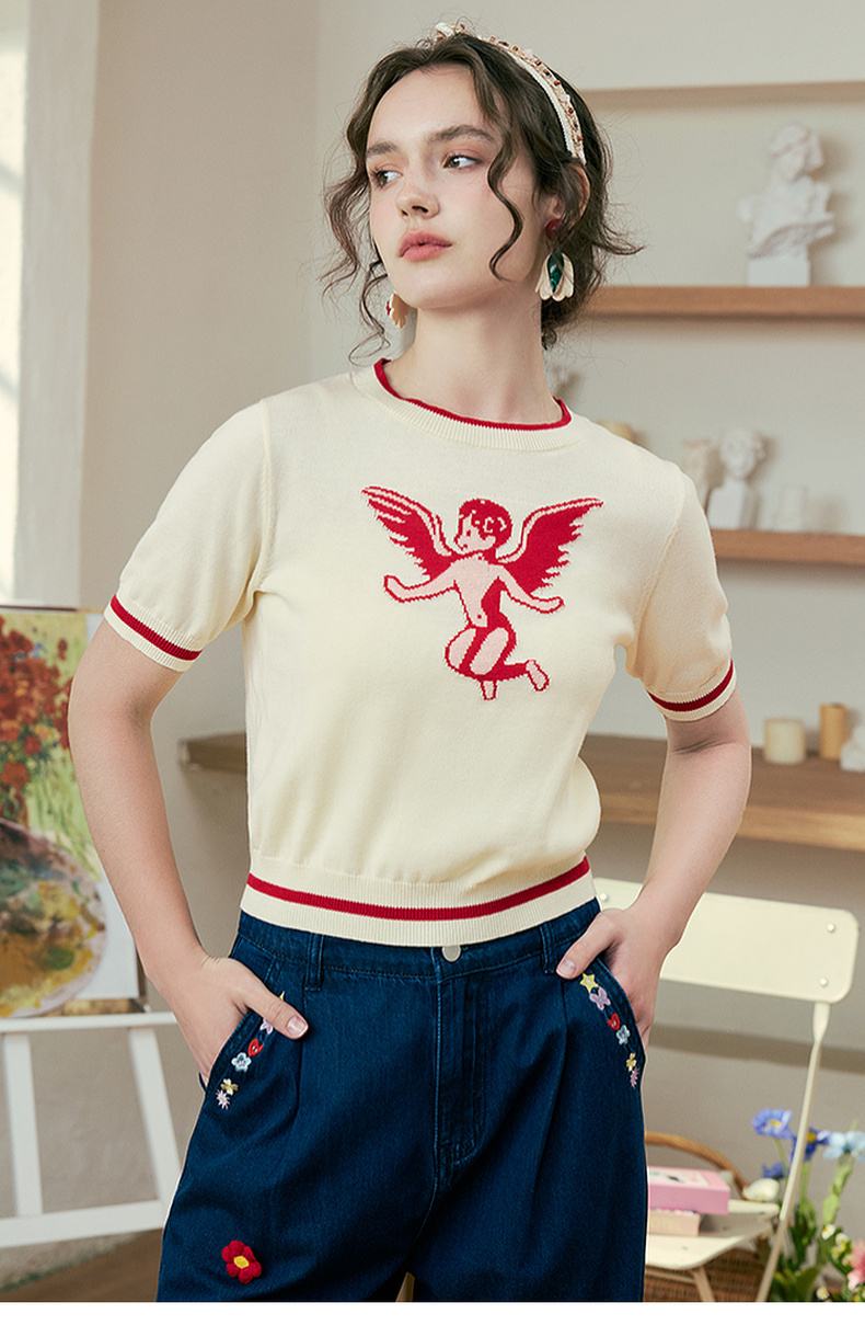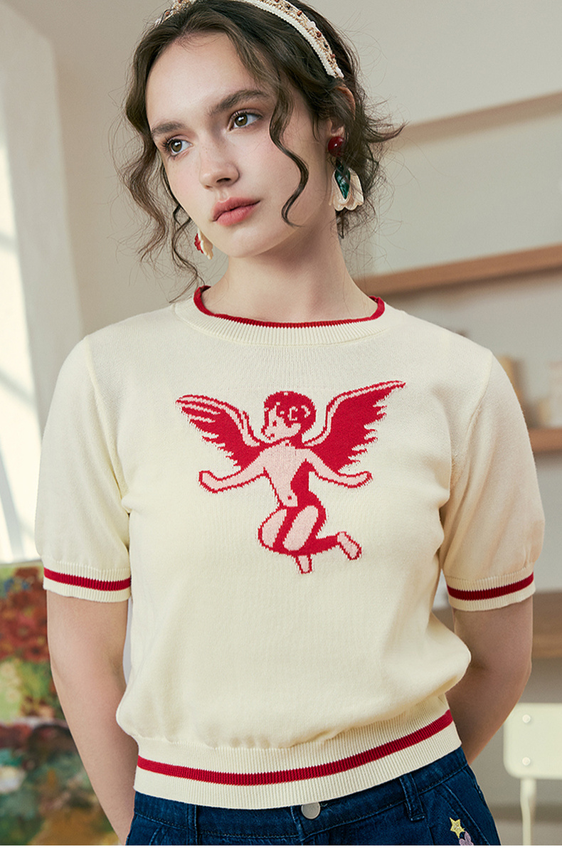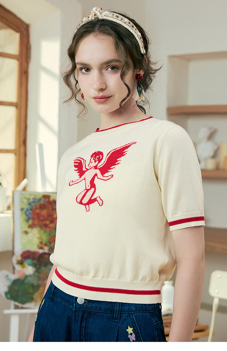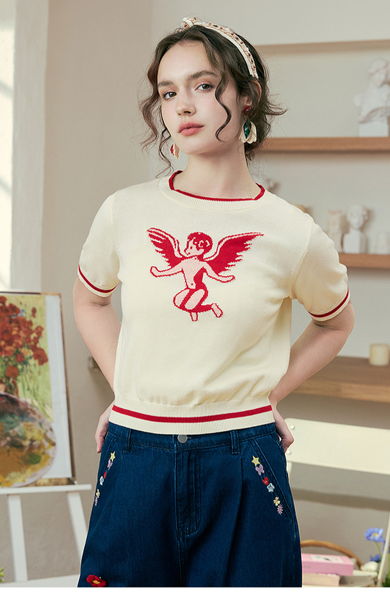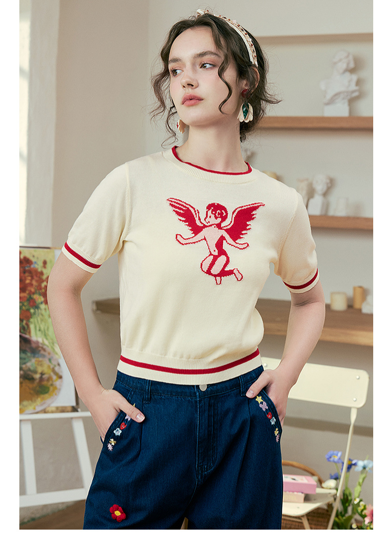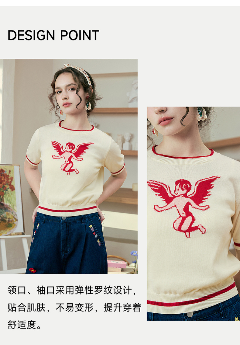 两三事 月光天使 2025春季新款可爱天使图案收腰短款针织衫女