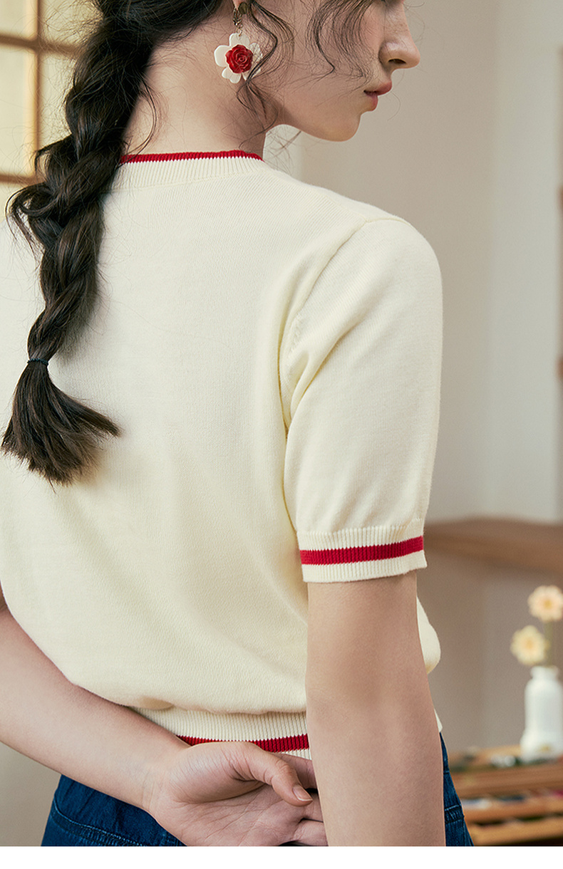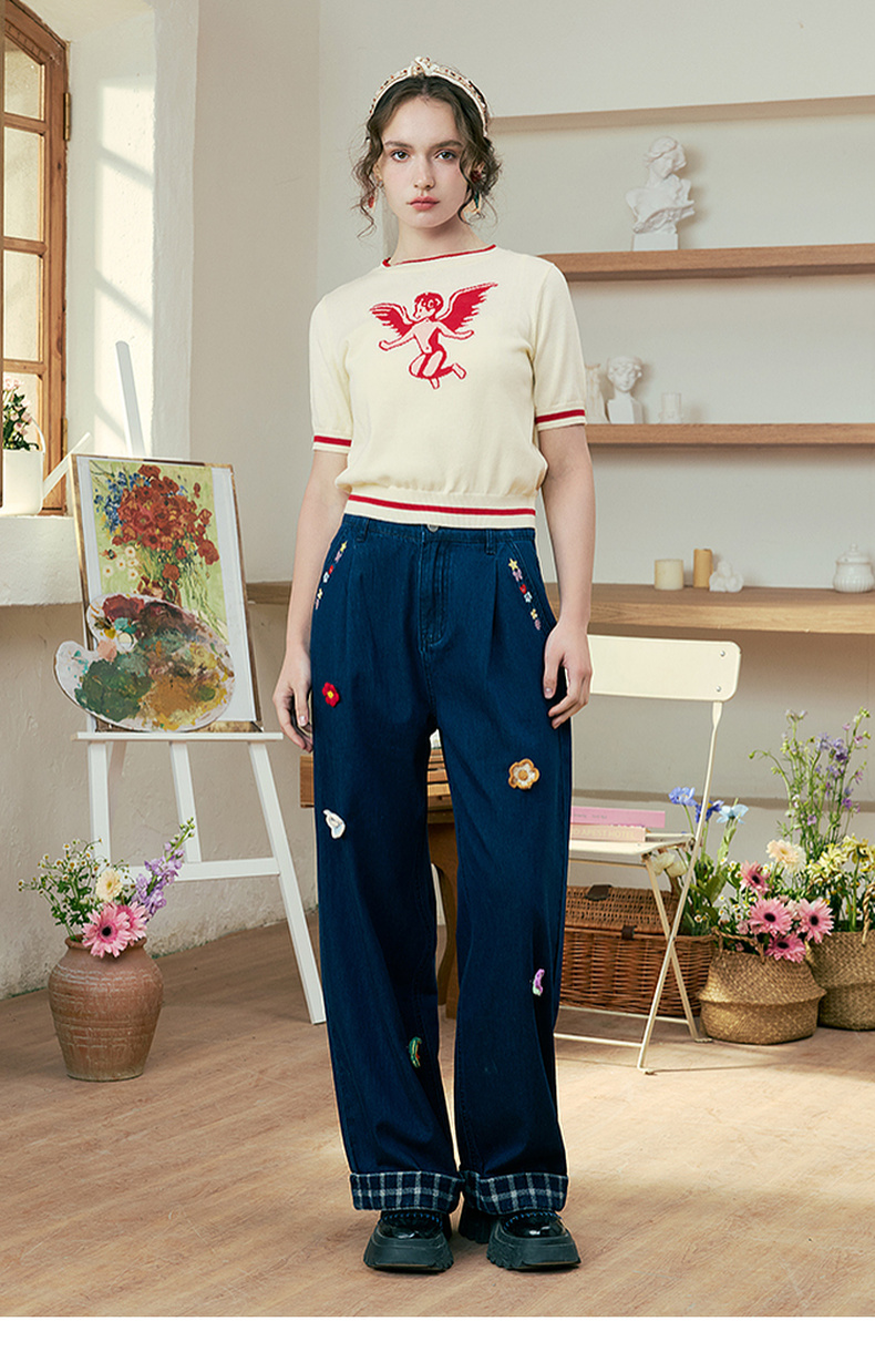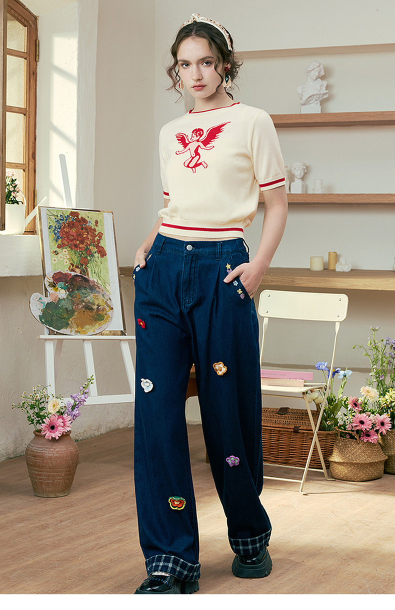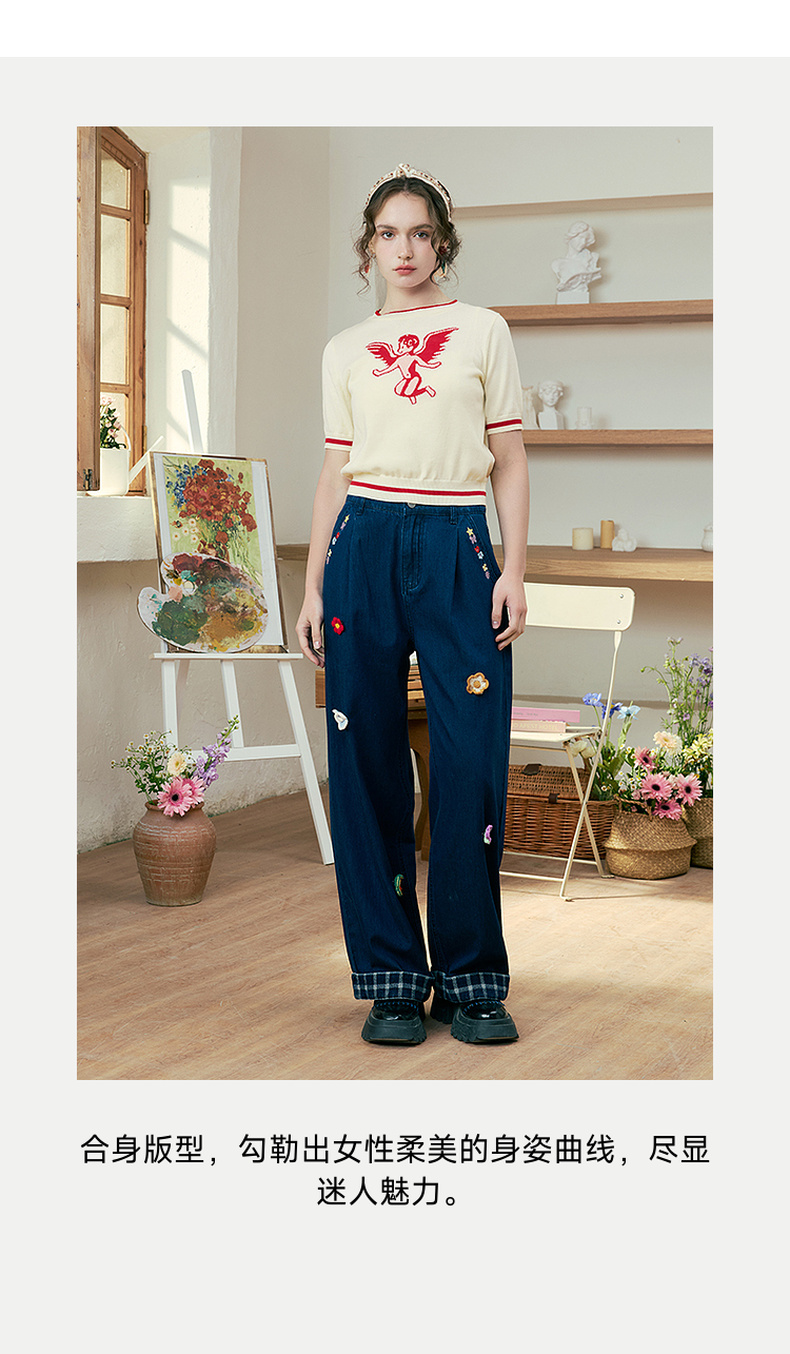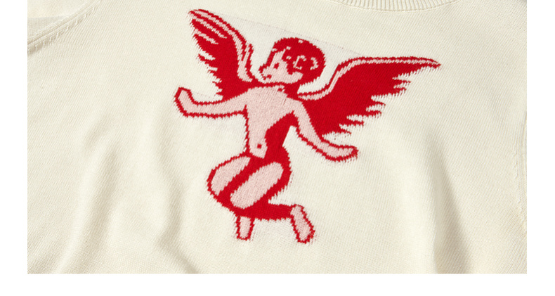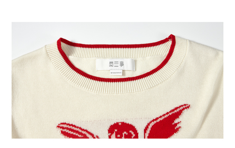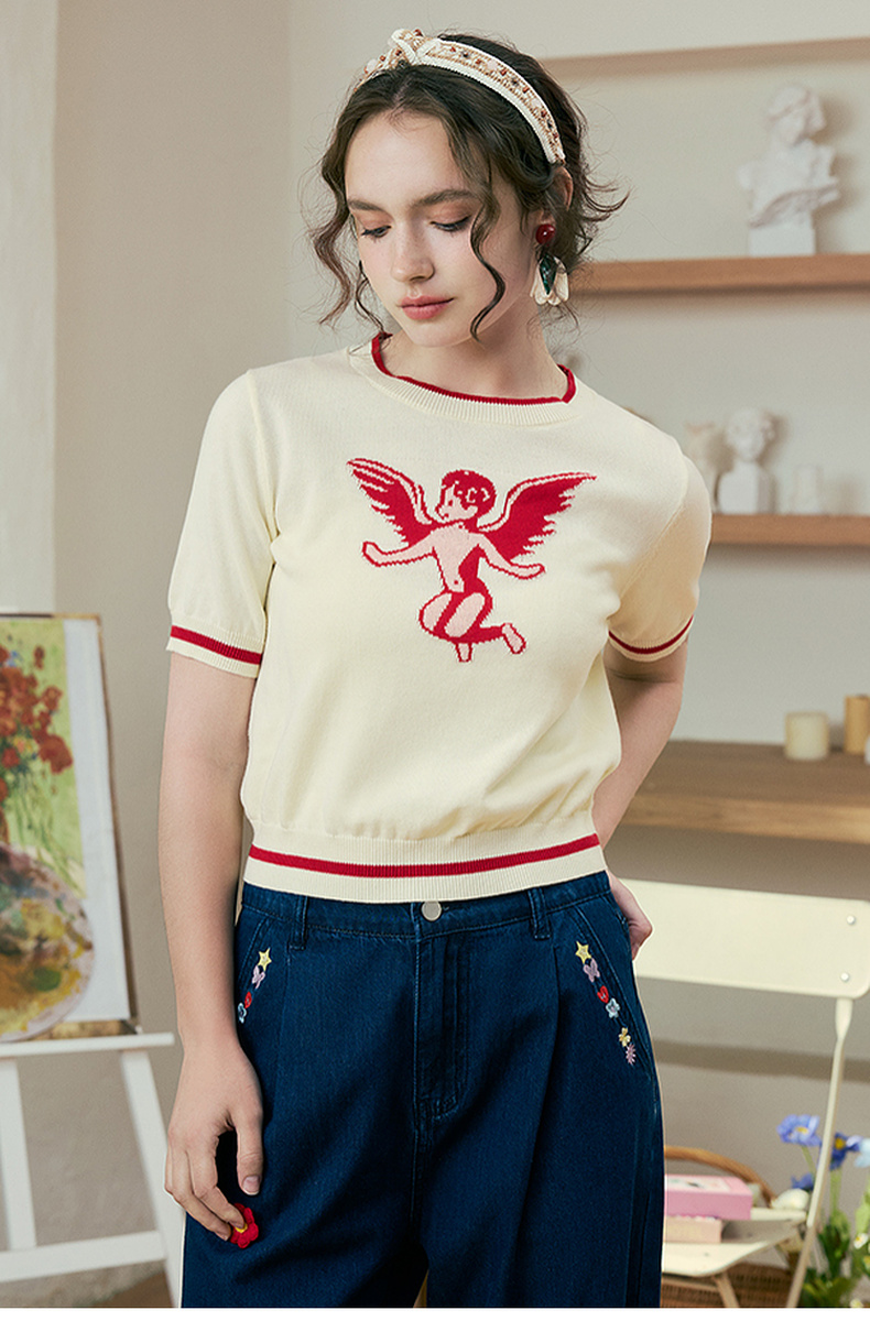 两三事 月光天使 2025春季新款可爱天使图案收腰短款针织衫女