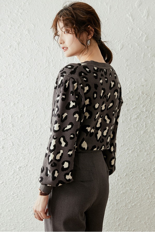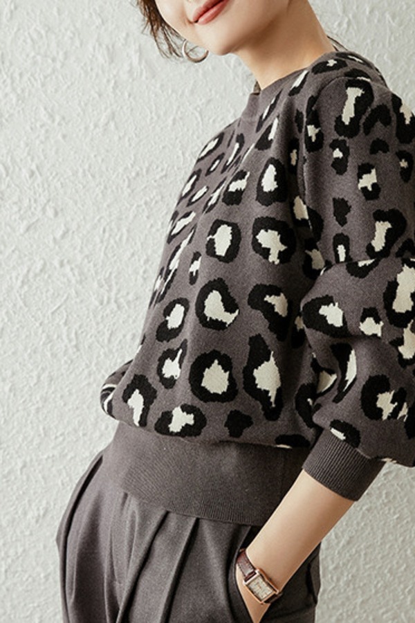 LOUIS YAO/白鹿语 撞色豹纹圆领垫肩廓形针织毛衣 10407