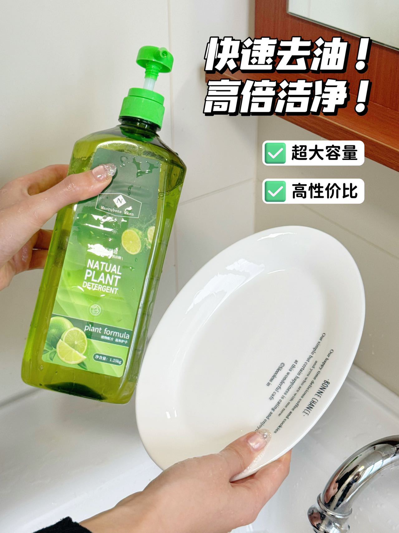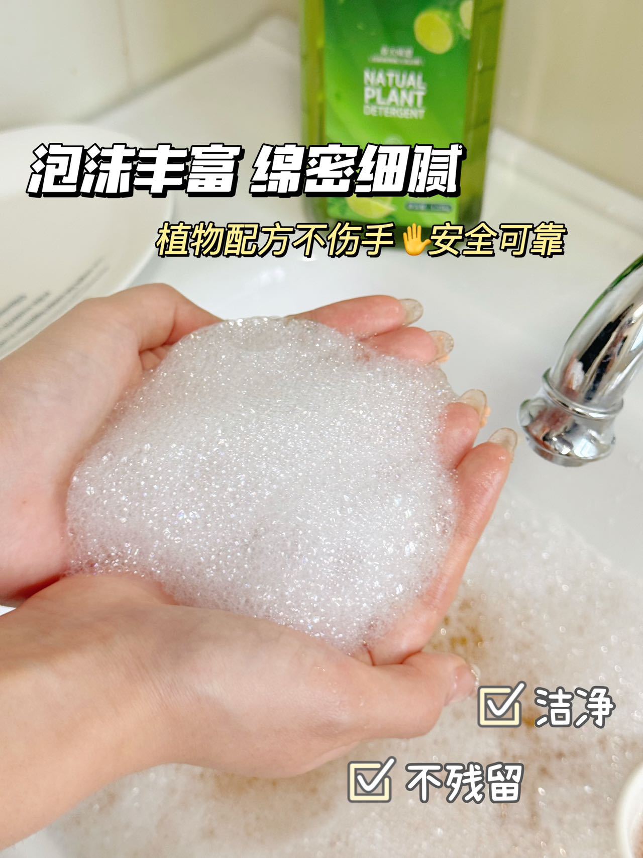 它真的不是普通的洗洁精!!! 每次就往水槽里面挤2-3泵 各种重油渍的盘子碗筷都能轻松洗掉✅ 淡淡的植物清香很好闻!! 洗完碗手上再也不是油渍异味了 而且淡淡的青柠🍋🟩香还能护手!!!