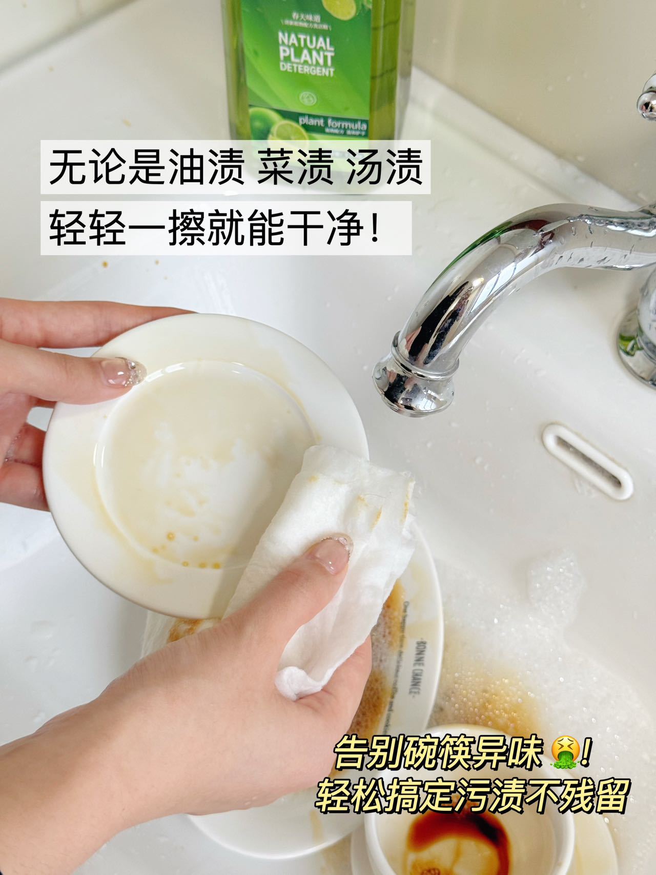 清洁效果真的太强了👍 💁♀️使用方法也超级简单 只需要将适量的洗洁精倒在湿的海绵上 轻轻擦拭餐具就可以啦! 过水一遍就能冲干净更节水!!