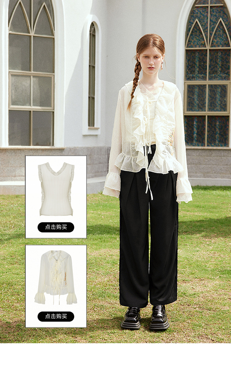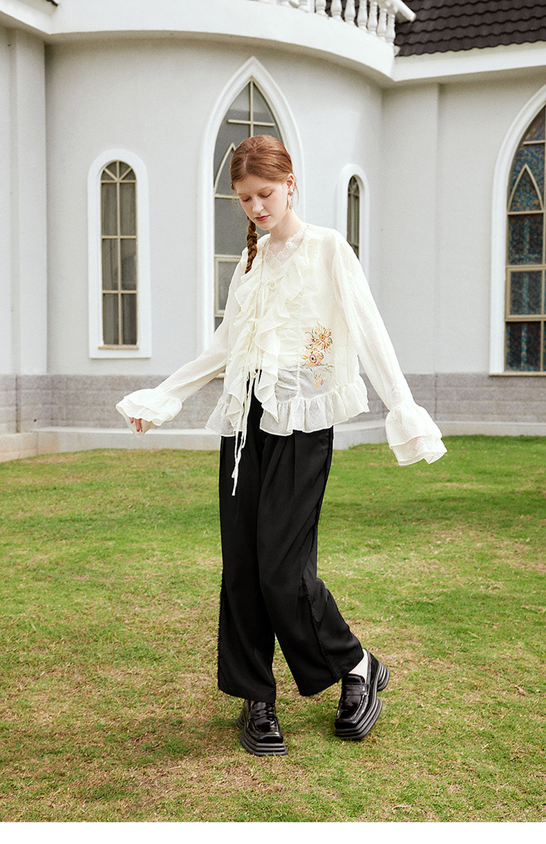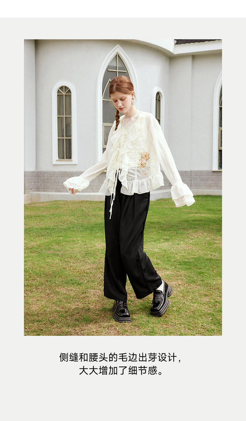 两三事 月缎流萤 2025夏季新款淑女风印花荷叶边刺绣翻领衬衫女