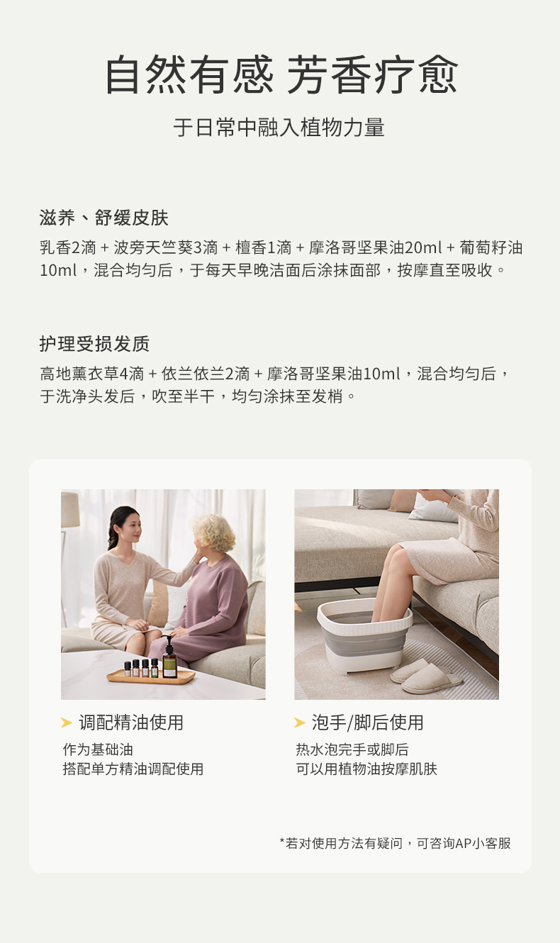 Aroma Promise秉承自然平衡、疗愈和愉悦的产品理念,通过纯天然植物精油的力量,传递健康美好的生活方式,帮助您找到一片栖息和放松之地。 “热爱生活,勇敢无畏,自由自在。”
