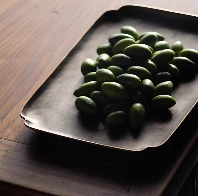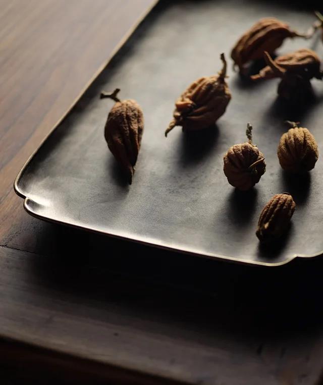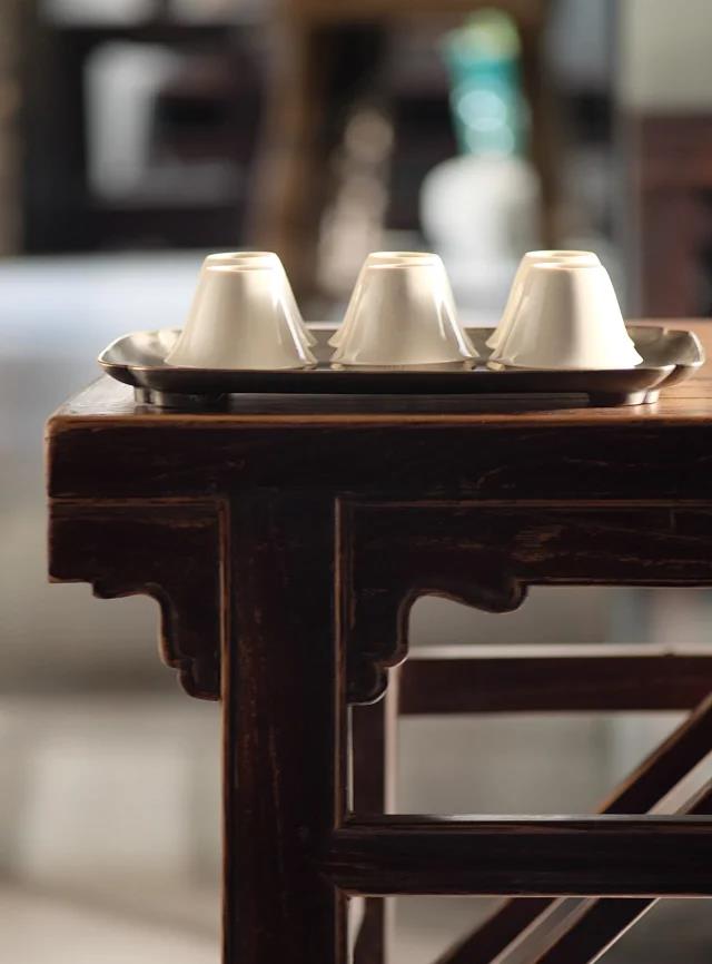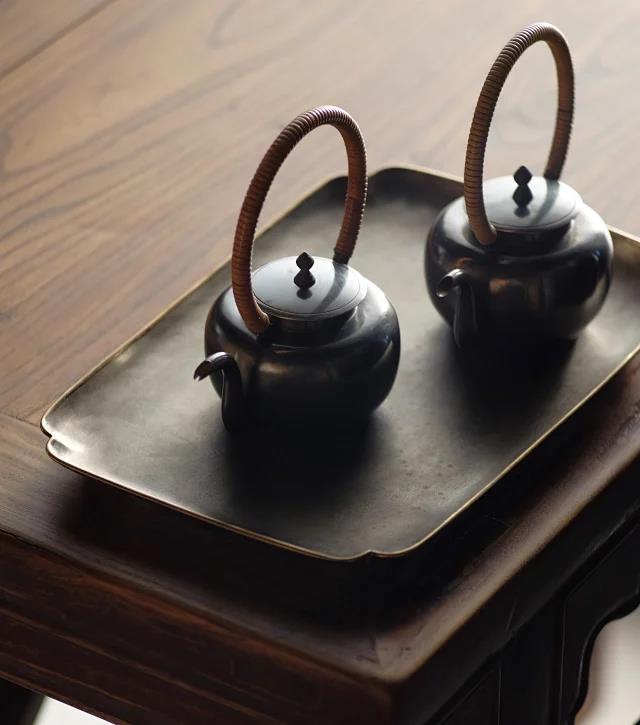 倭口锡托盘,锡盘包铜边,旧器来源:清代中期锡托盘为原型,纯手工打造,厚重圆融,倭口过渡自然,镶嵌铜边加固,两材金银双色相配,用以承托茶器食物更为文气雅致。