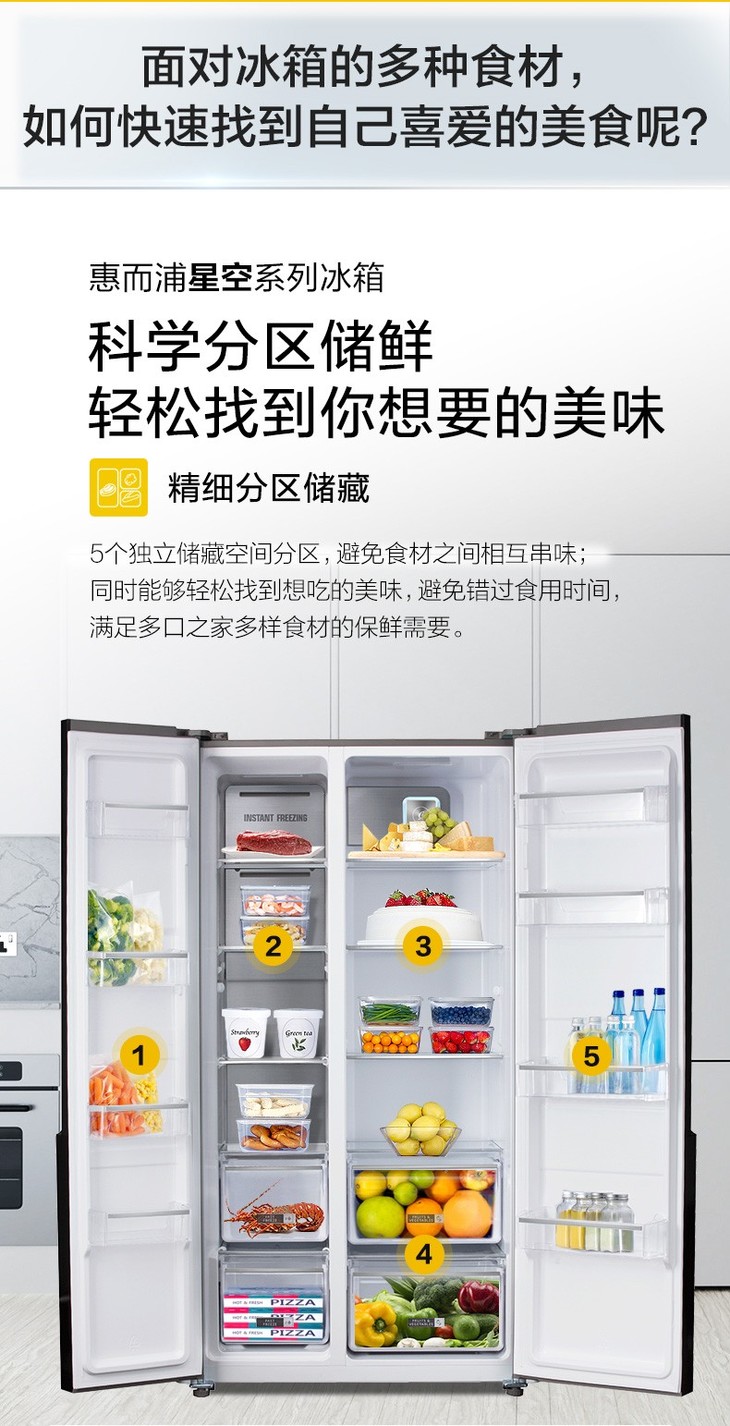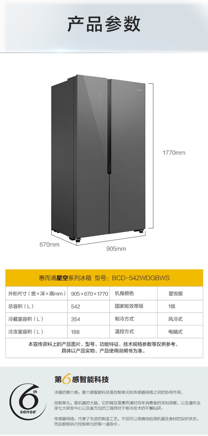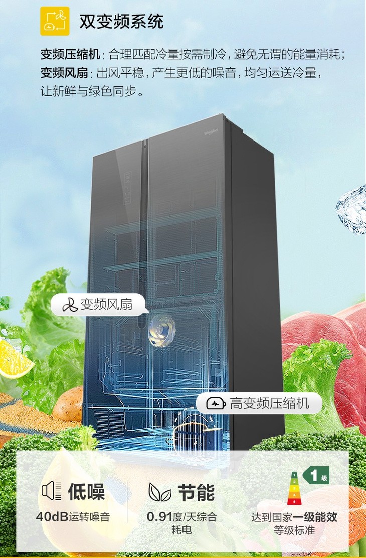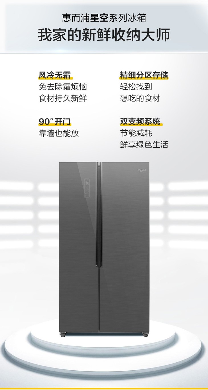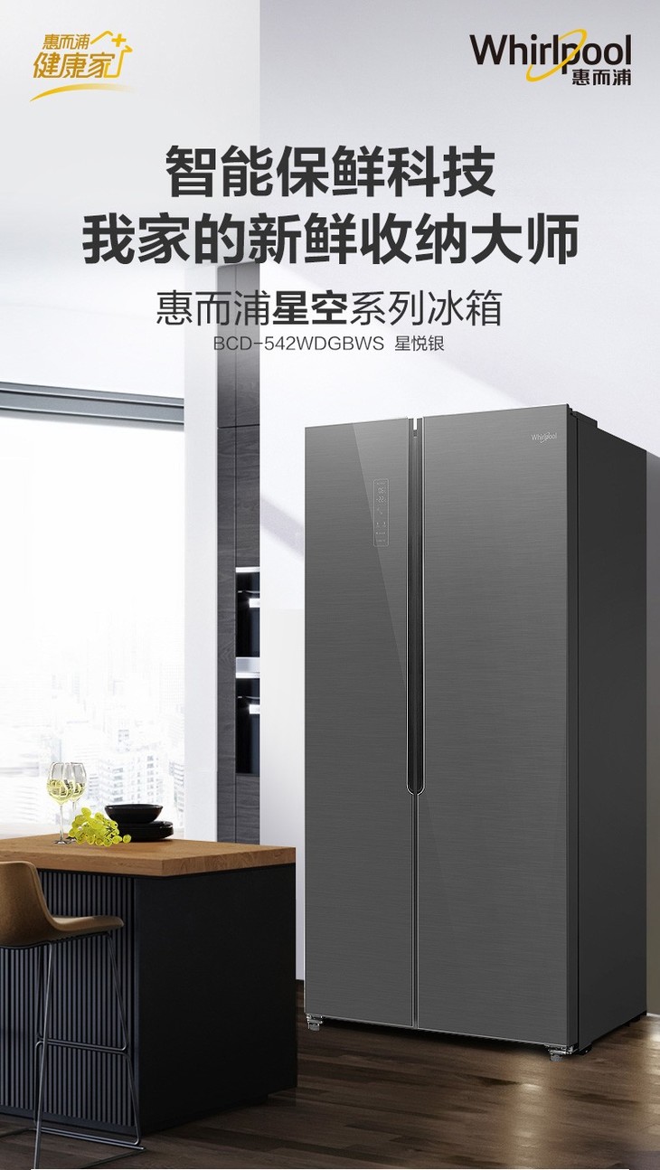 惠而浦冰箱对开门冰箱风冷无霜542升大容量双变频钢化玻璃门分区储藏家用BCD-542WDGBWS