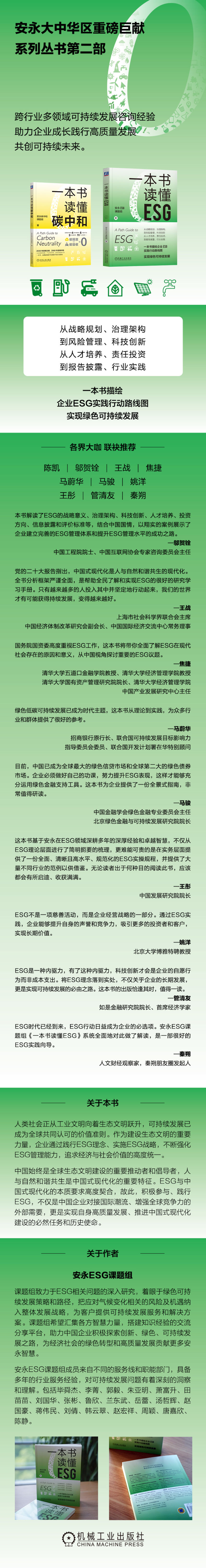 当前,ESG(环境、社会、治理)作为一种价值理念,高度契合新发展理念,它已成为企业高质量发展的助推器。本书介绍了ESG的内涵、ESG政策发展、ESG评级与标准及企业未来发展面临的ESG方面的机遇与挑战,从战略规划、治理架构到风险管理、科技创新,从人才培养、负责任投资到报告披露、行业实践,描绘了一幅企业ESG行动路线图,以帮助读者了解ESG相关知识及发展趋势,推动企业以ESG为抓手实现绿色可持续发展。