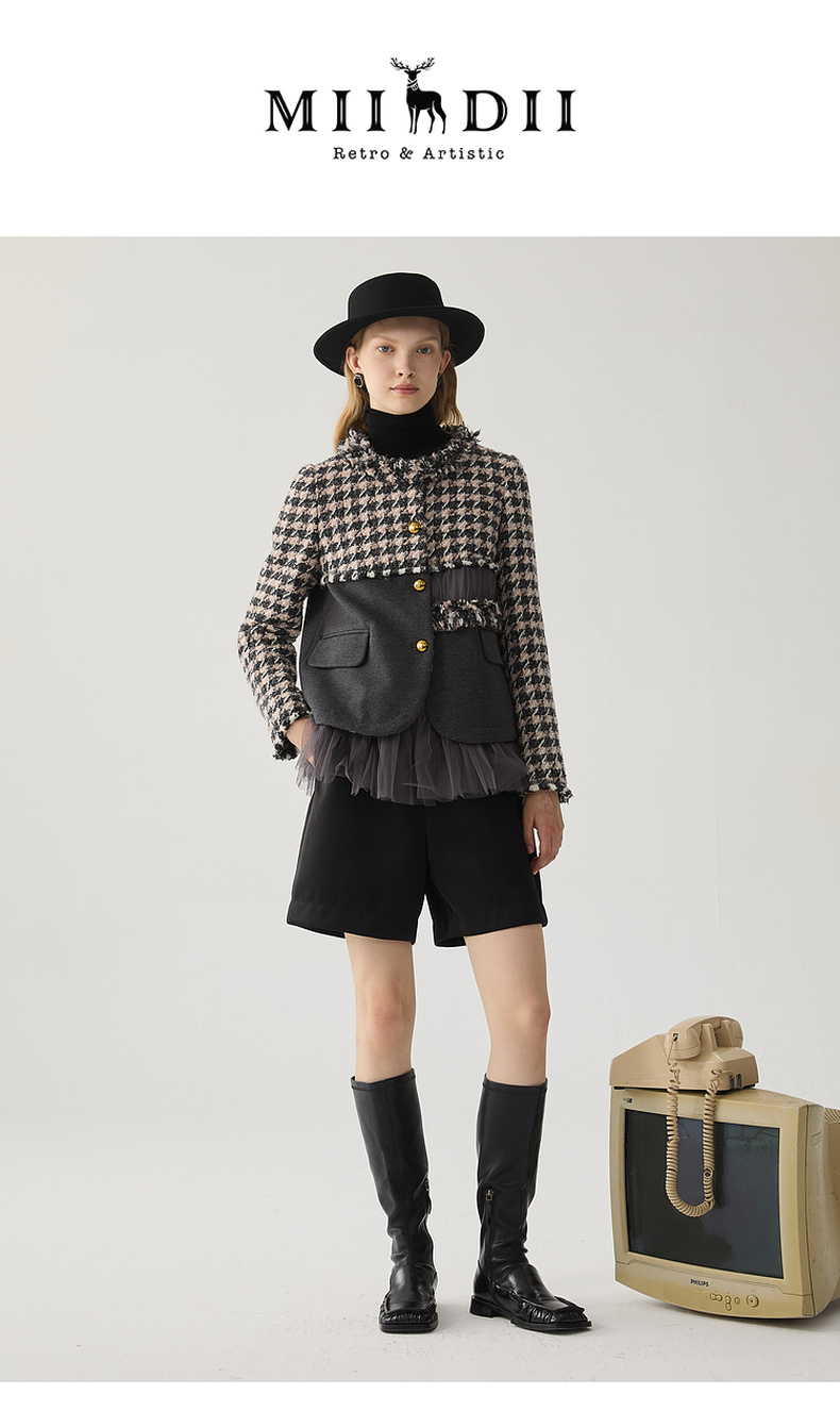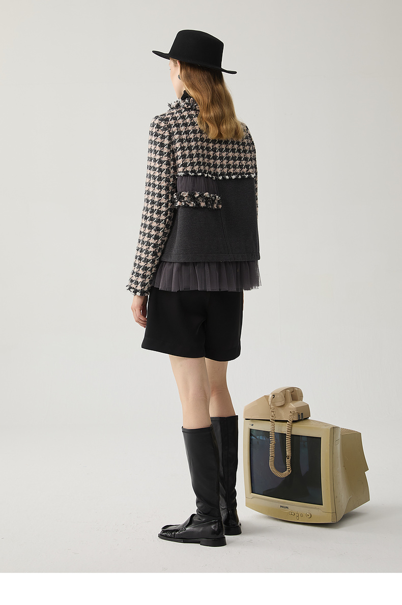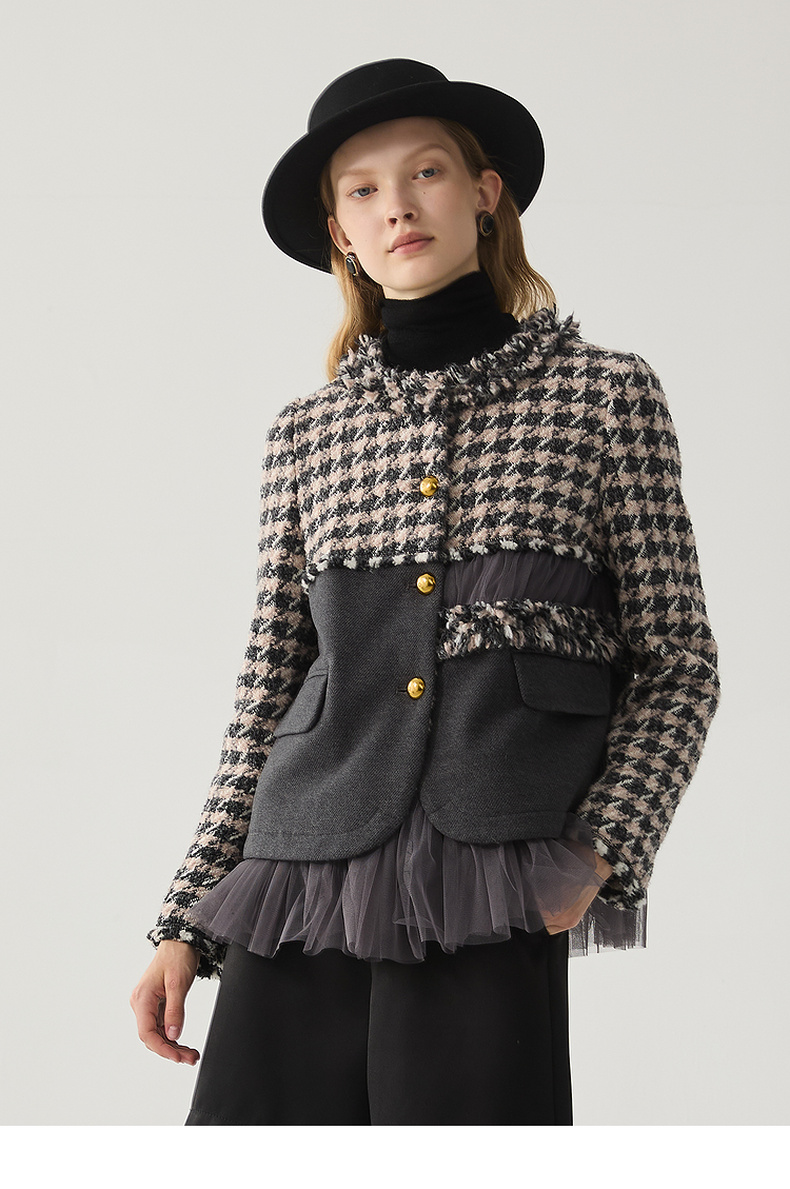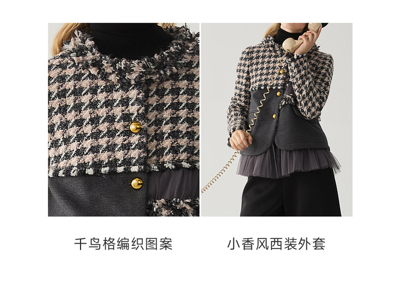 谜底拼接感外套女2024冬新品特色淑女千鸟格小香风外套244MW1655