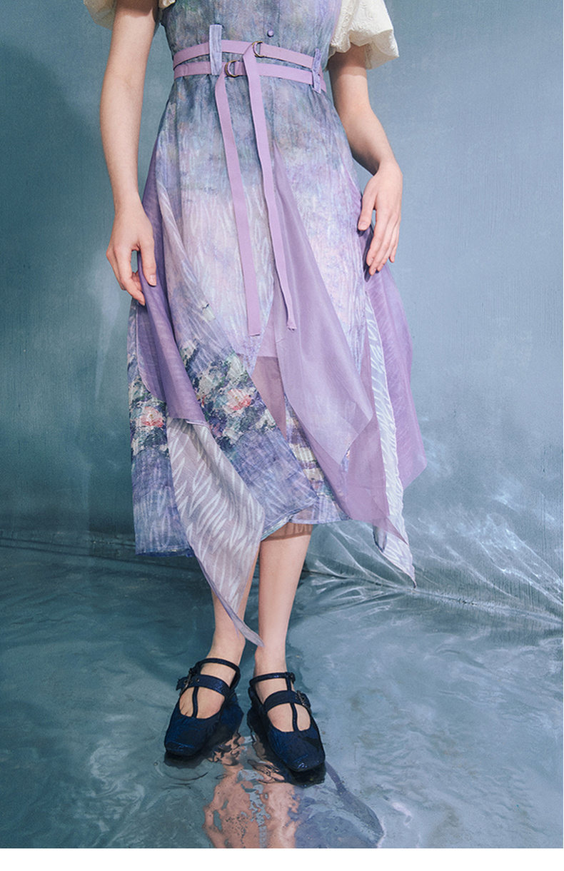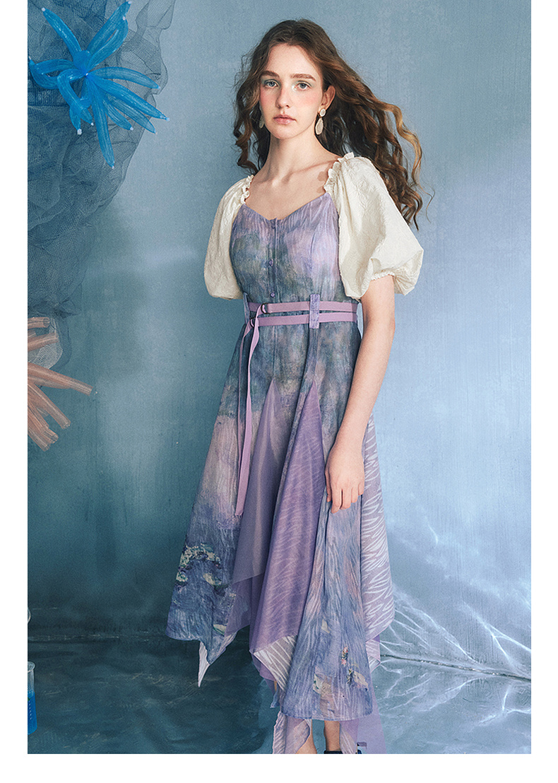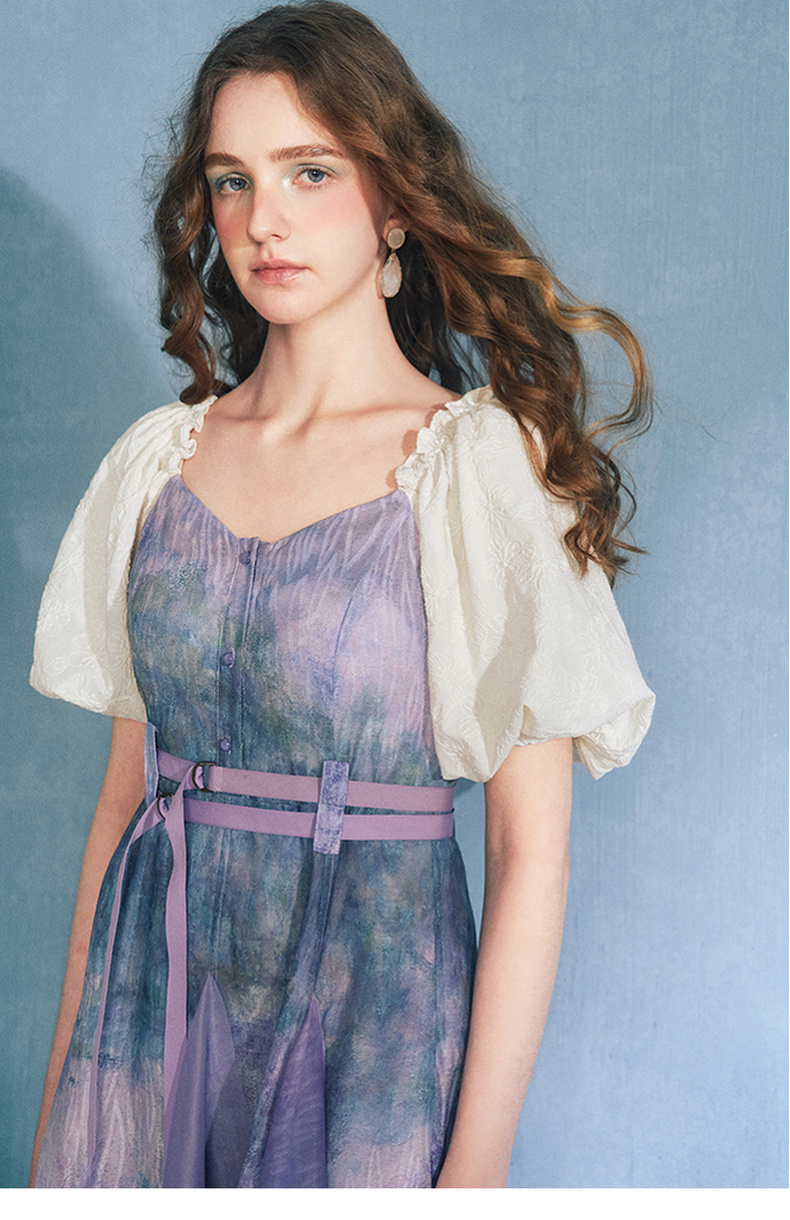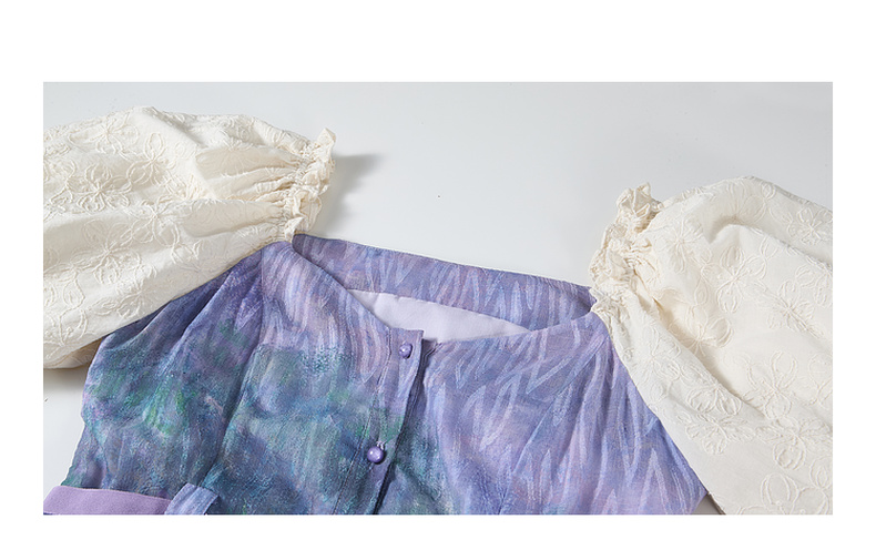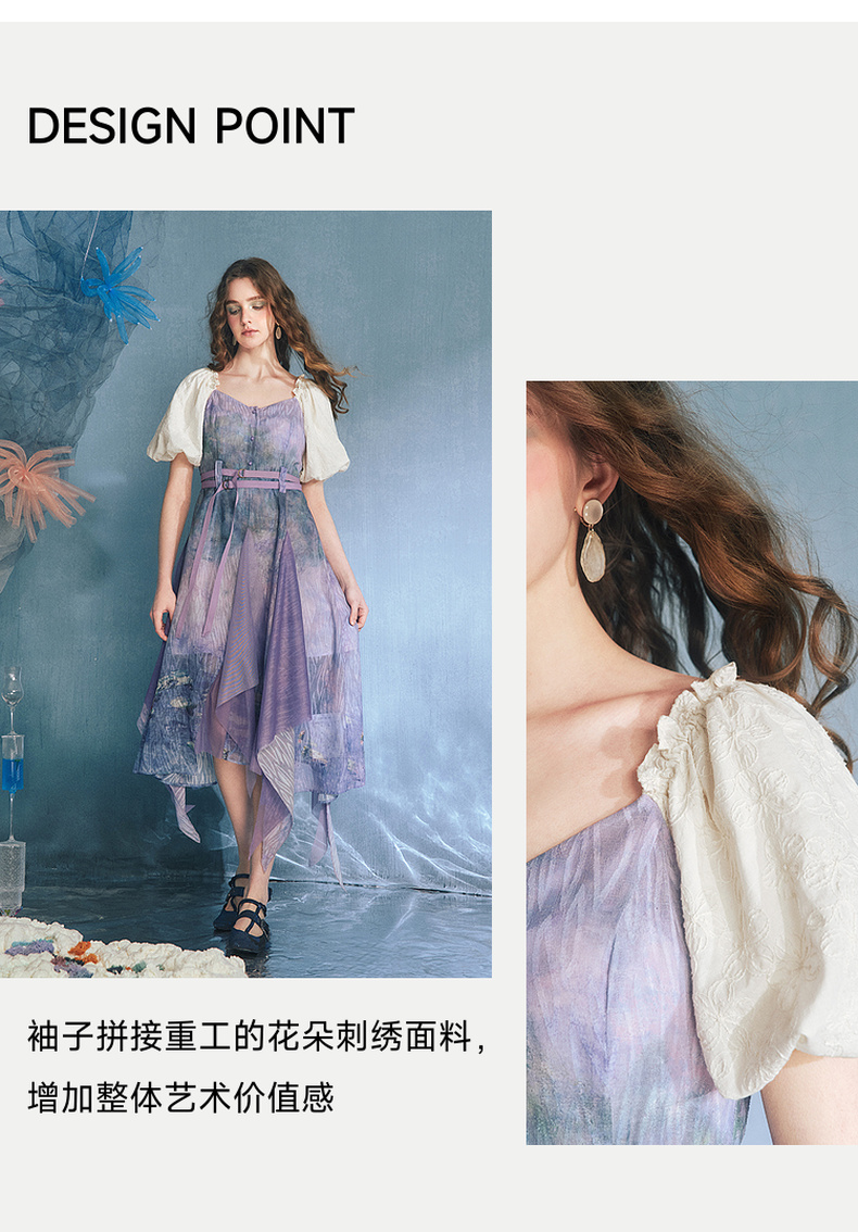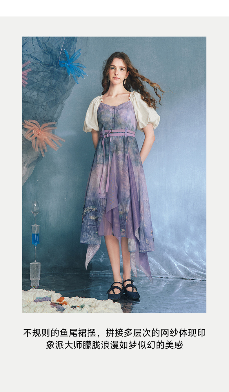 两三事诗意午后2024夏季新款复古拼色泡泡袖系带印花连衣裙