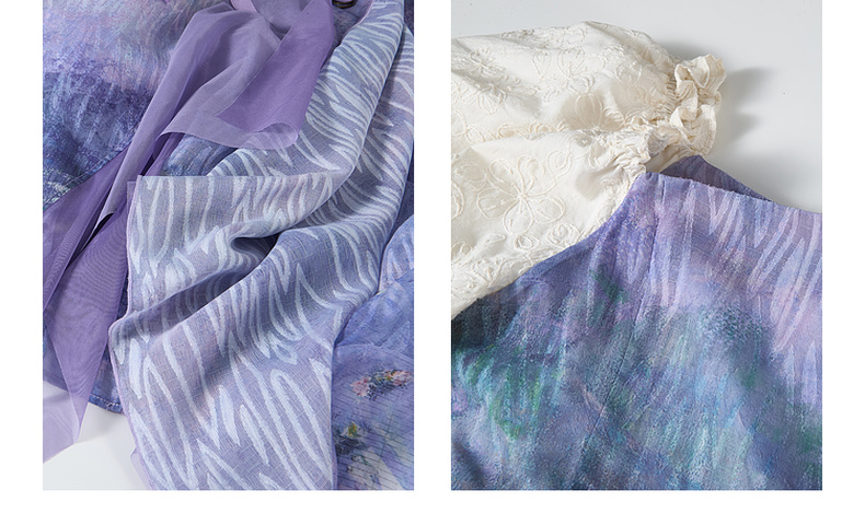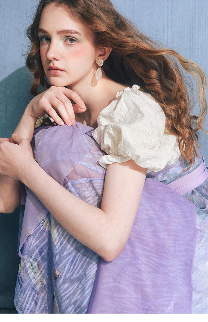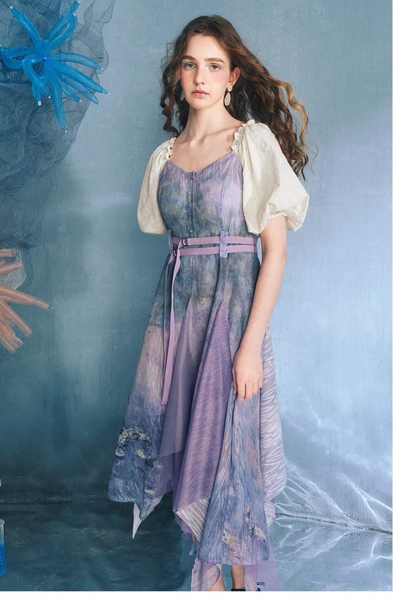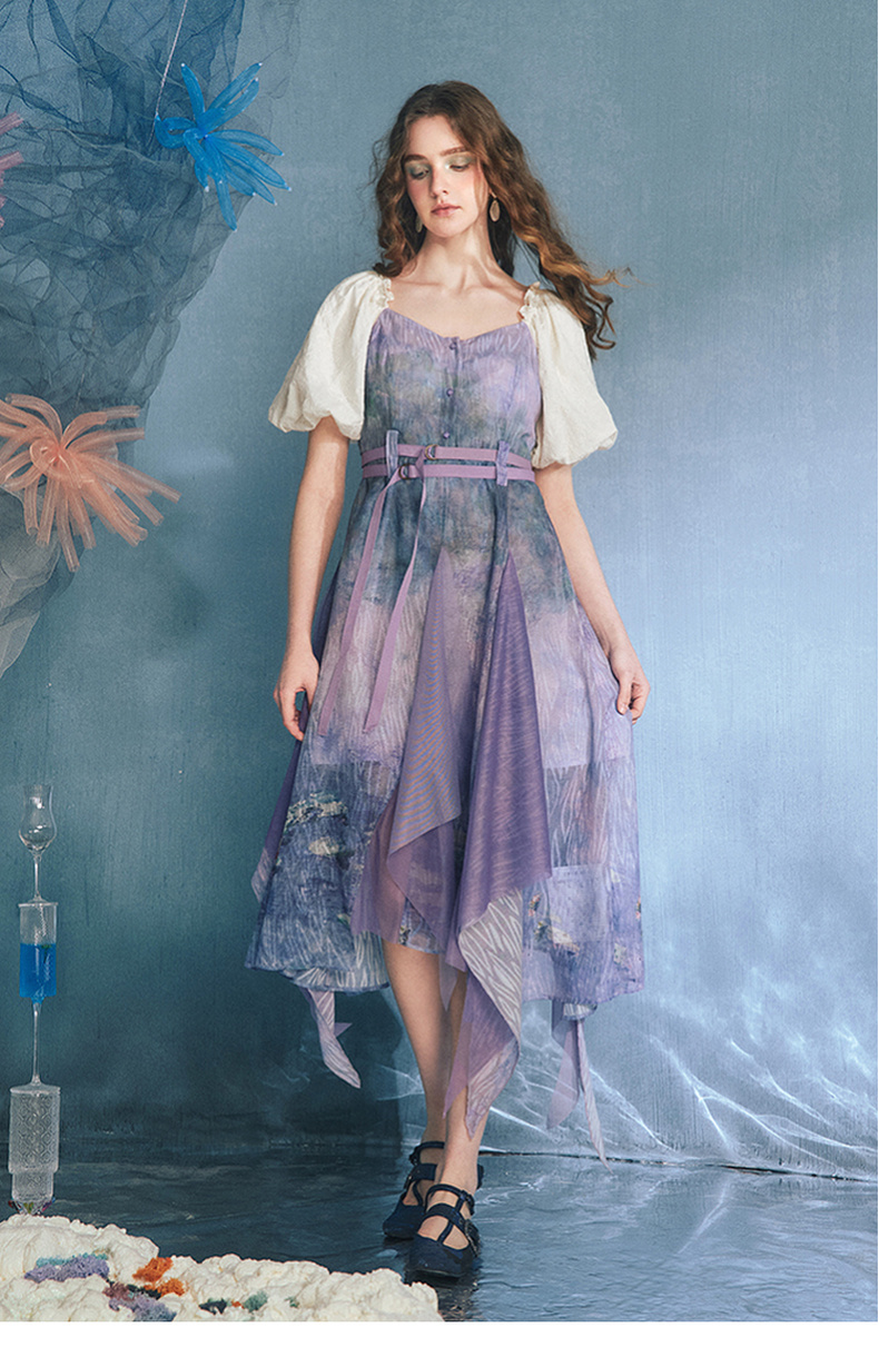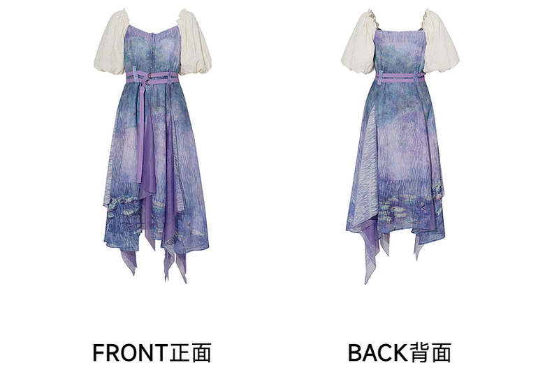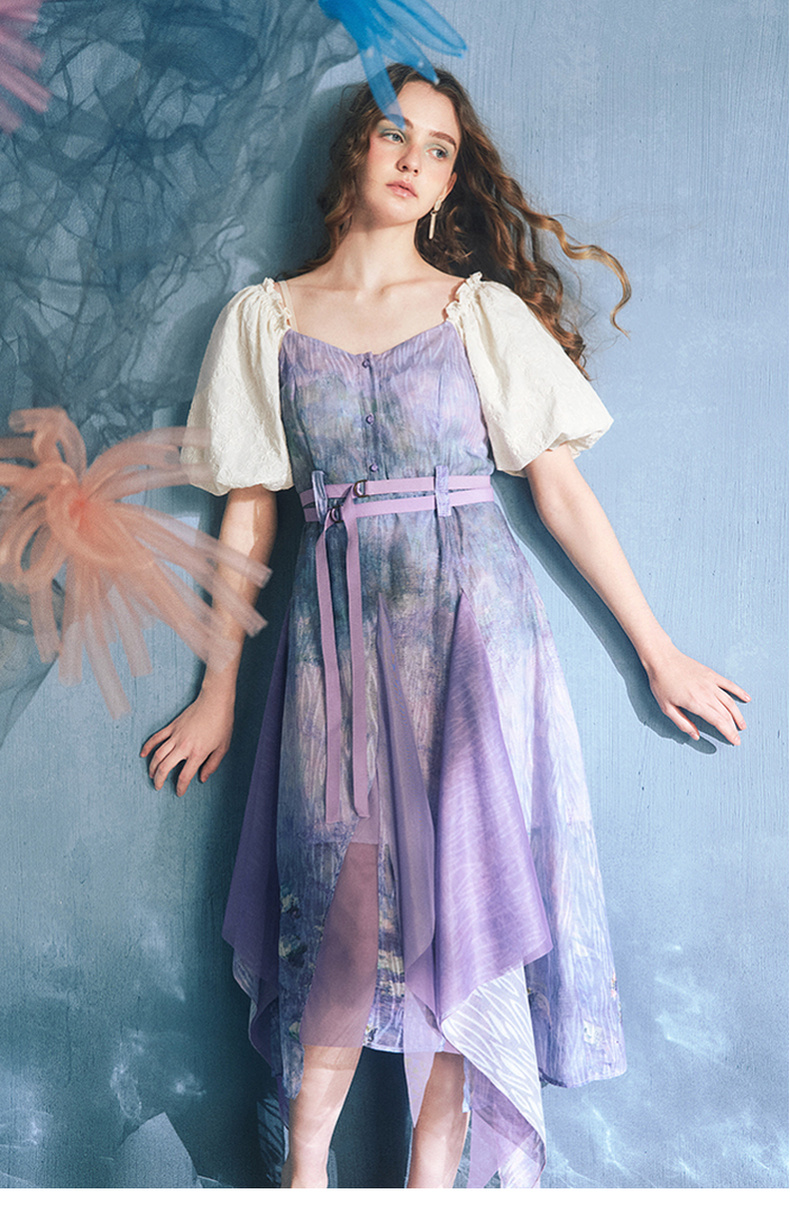 两三事诗意午后2024夏季新款复古拼色泡泡袖系带印花连衣裙