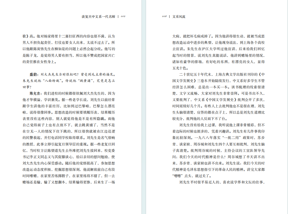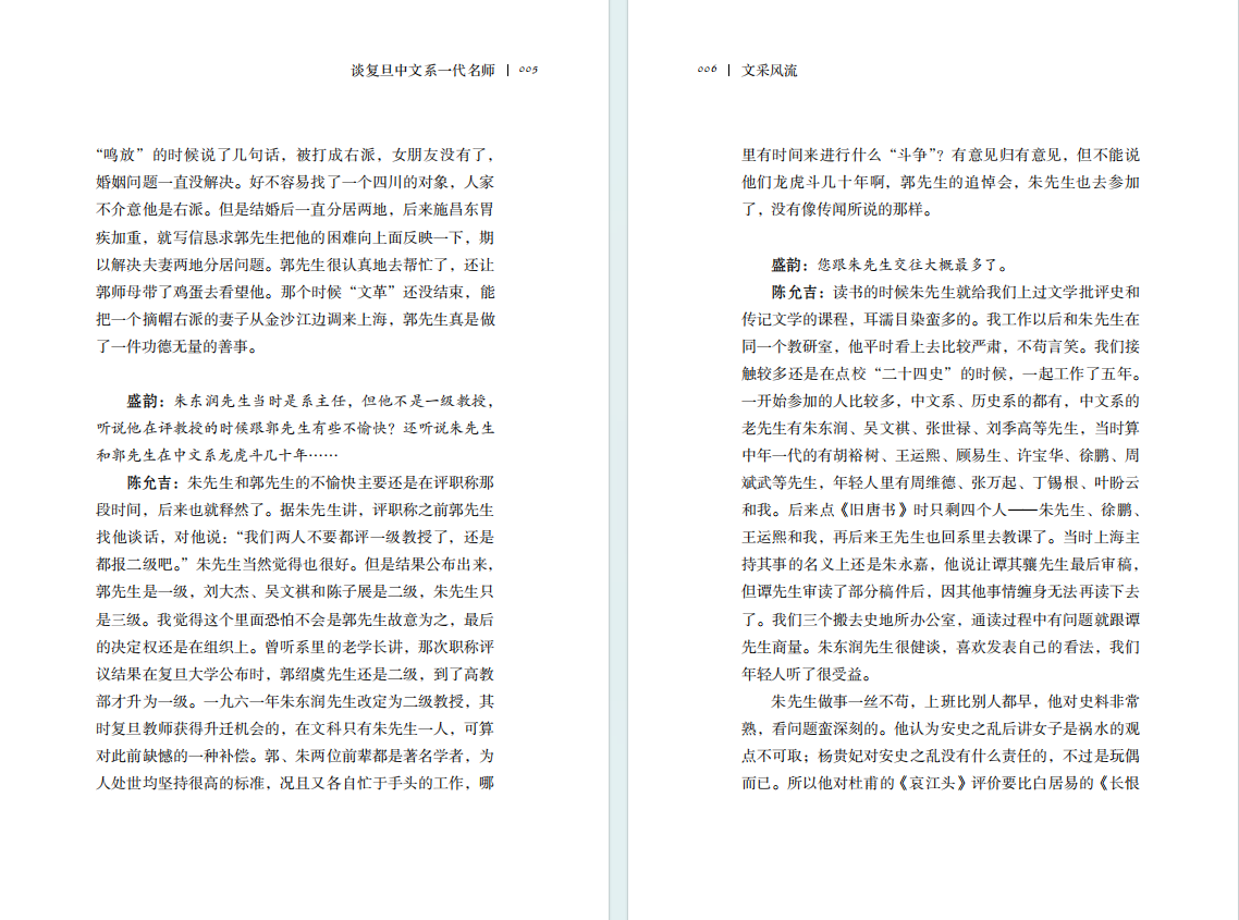 本集汇录允吉夫子应对沪上多家报刊媒体的访谈答问,精彩纷呈。集内回忆一九七零年代前期参与《旧唐书》、《旧五代史》点校往事一篇,尤具史料价值;然郭(绍虞)、朱(东润)、陈(子展)、赵(景深)、蒋(天枢)、刘(大杰)等“复旦中文”诸老无疑仍是叙说之中心,且更多层面展现其为学为人的丰富生动之细节。