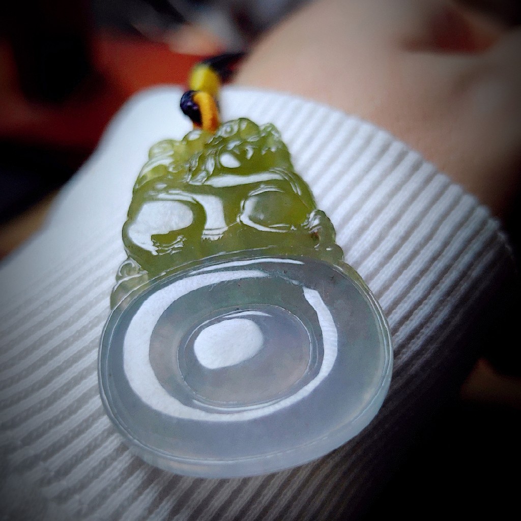 这又是一件双色翡翠牌,只见一只褐黄色的貔貅,遵守在的淡紫色钱币图案上。