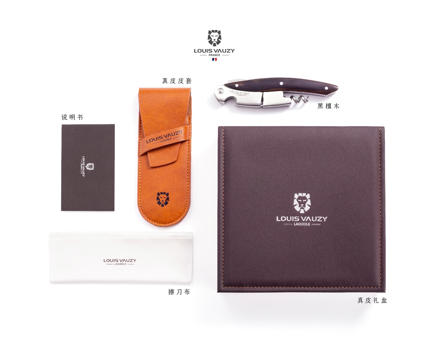 酒刀套装包括礼盒、手提袋、擦刀布、皮套和说明书,精美贵气,是收藏自用和礼品馈赠的上好选择。