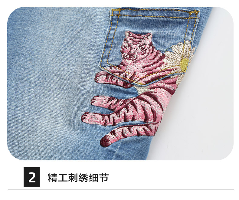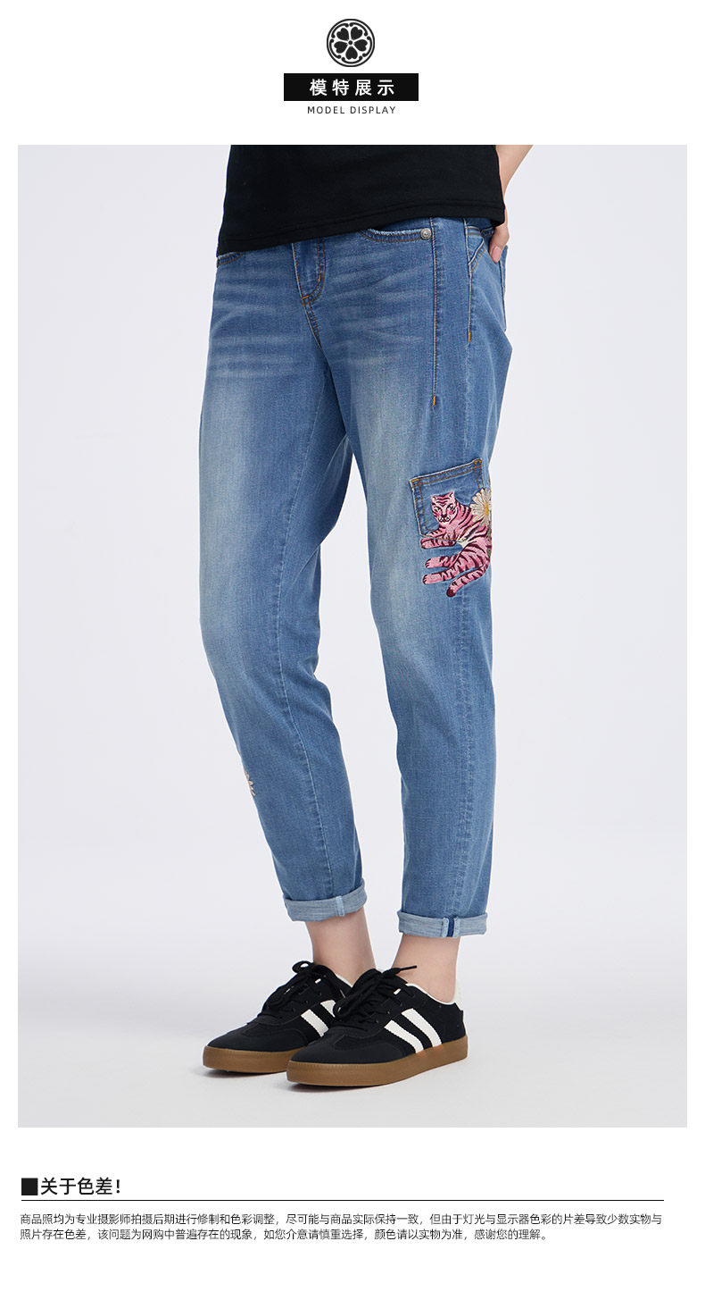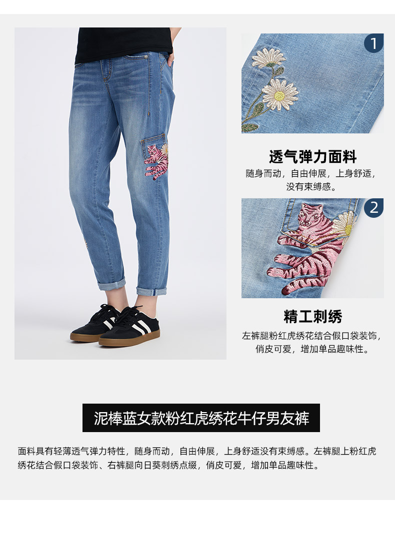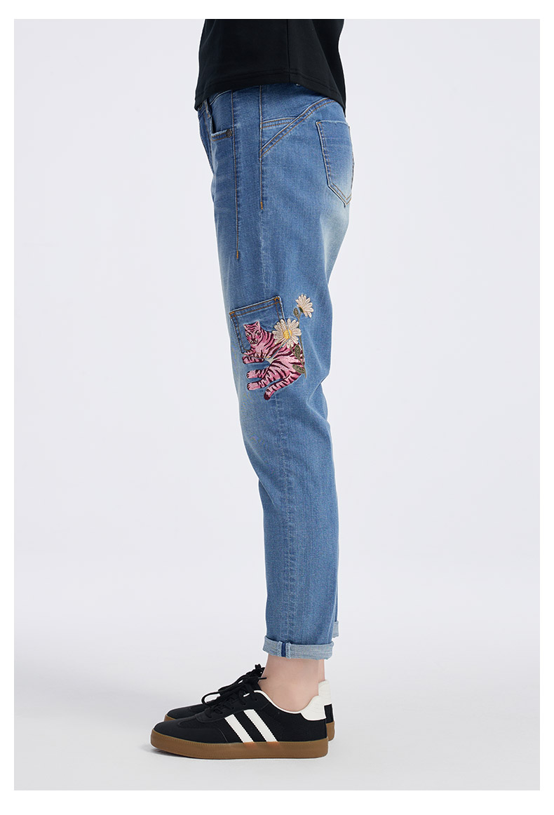 ONIARAI/鬼洗25春夏新品泥棒蓝女款粉红虎绣花牛仔男友裤 25N3406