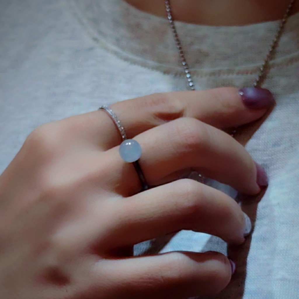 戒托以银为基底,经电镀黑金工艺淬炼,利落的几何线条勾勒出纯粹轮廓,喷砂工艺突出了深沉的哑光光泽与翡翠白珠形成克制而精妙的对比。摒弃繁杂装饰,仅以流畅的托举镶嵌糯种翡翠珠子,极简设计将天然婉约之美烘托至极致,每一处细节都彰显着“少即是多”的设计哲学。