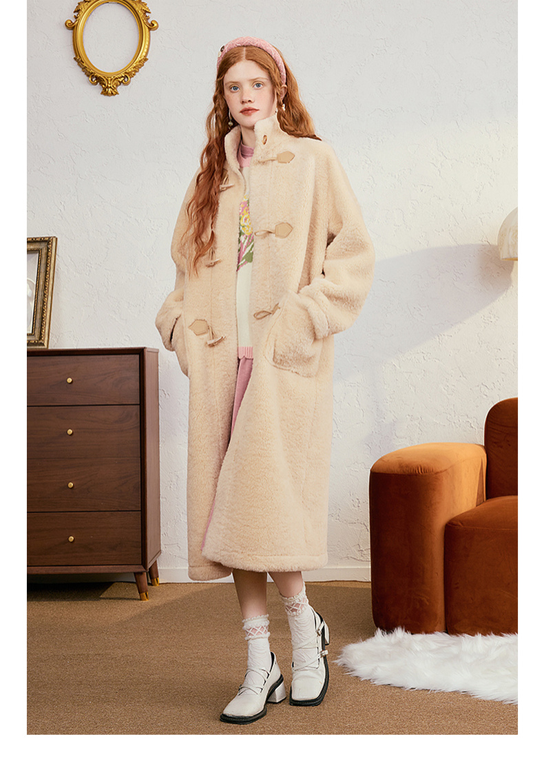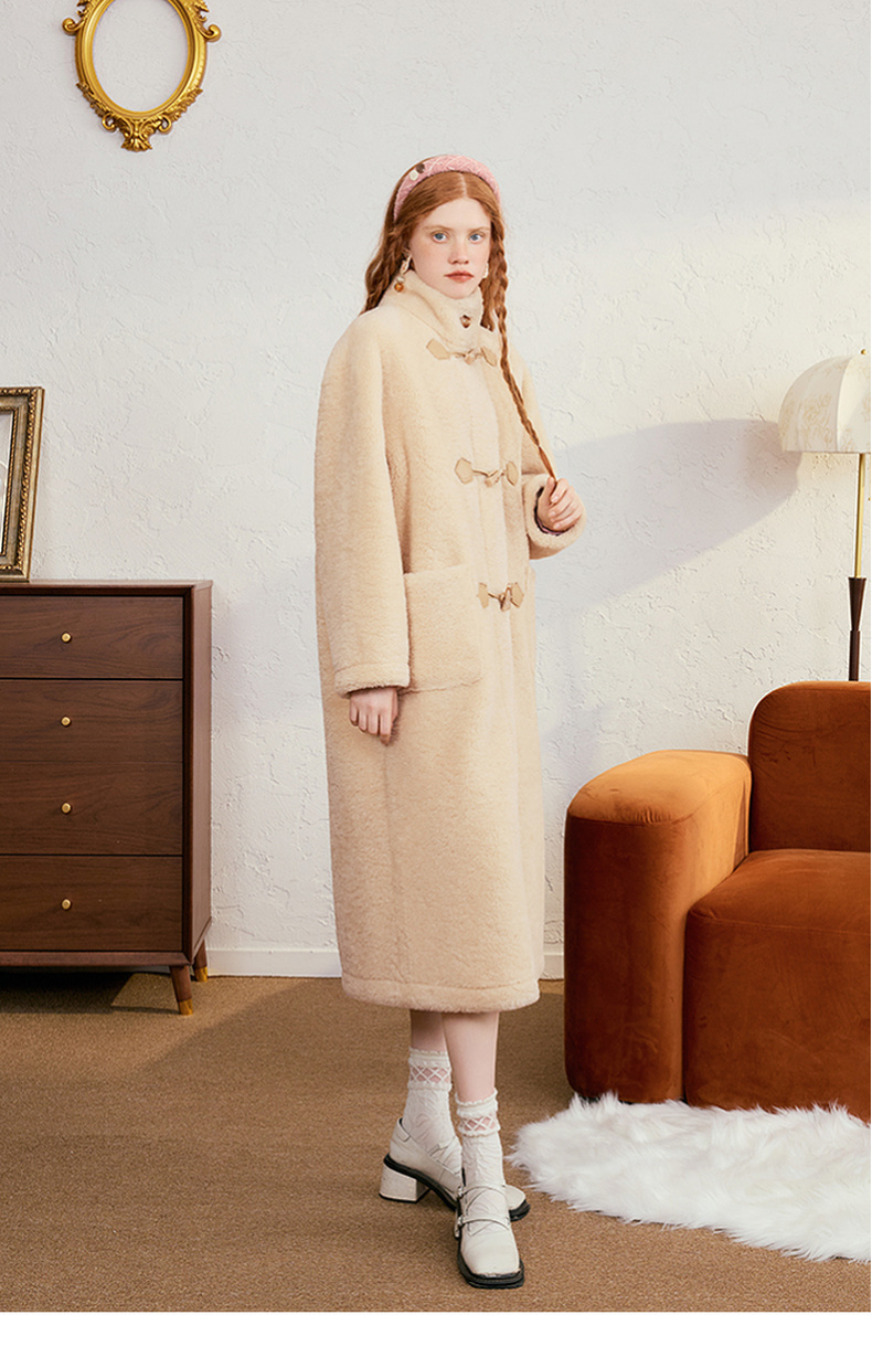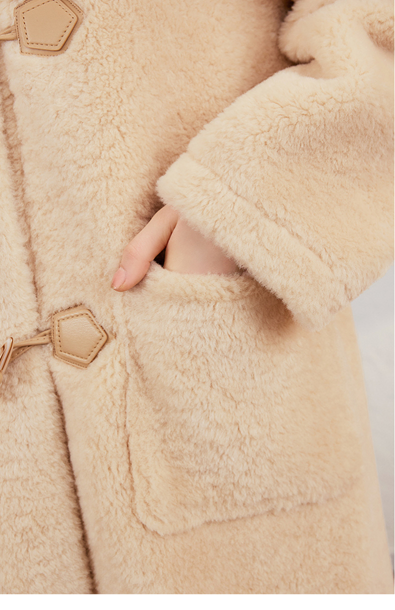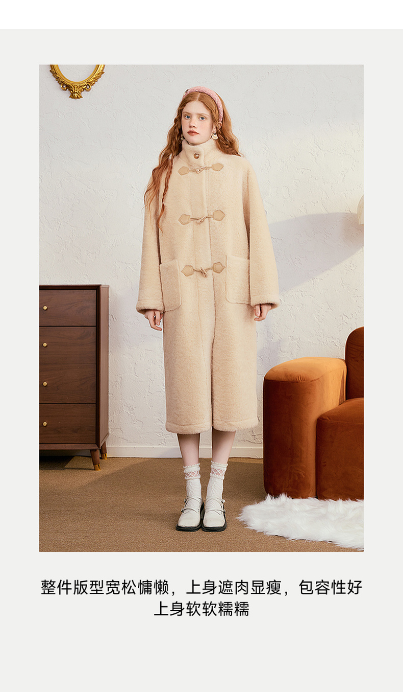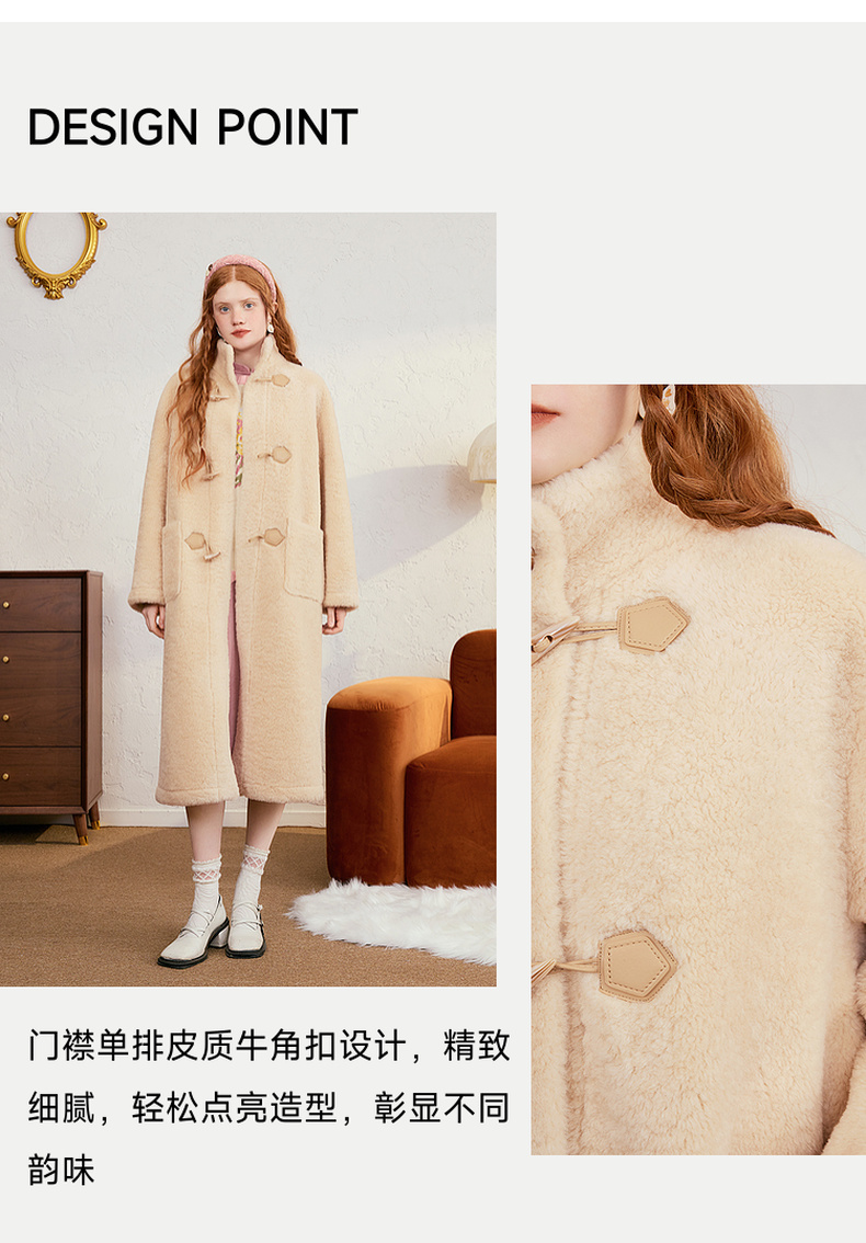 两三事 慕斯假日 2024冬季新款休闲牛角扣羊羔绒外套女中长款