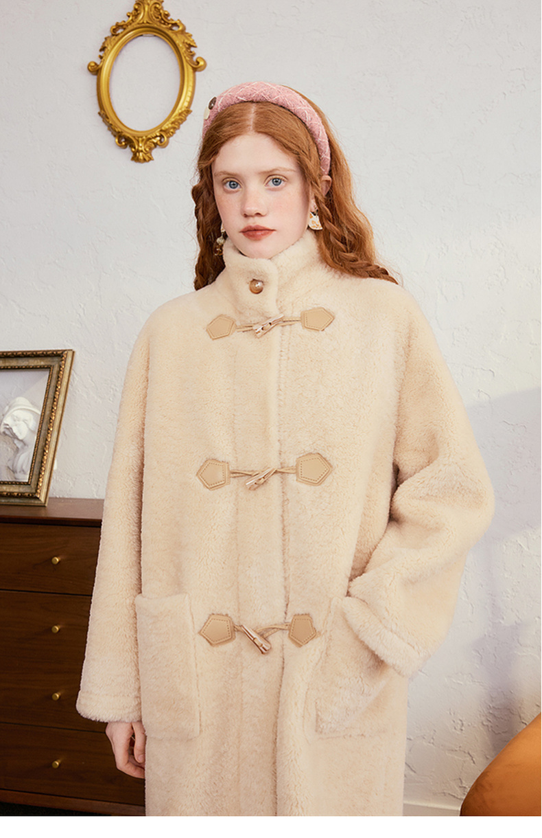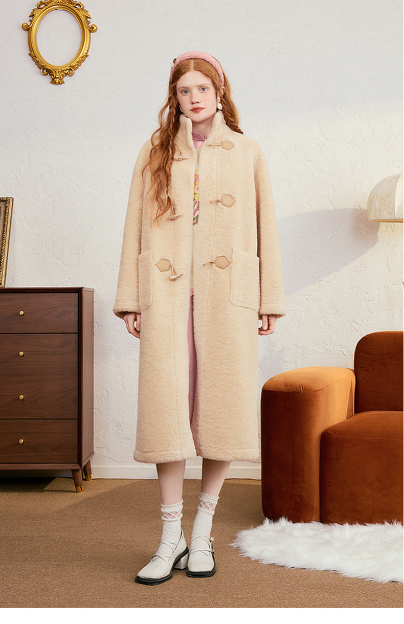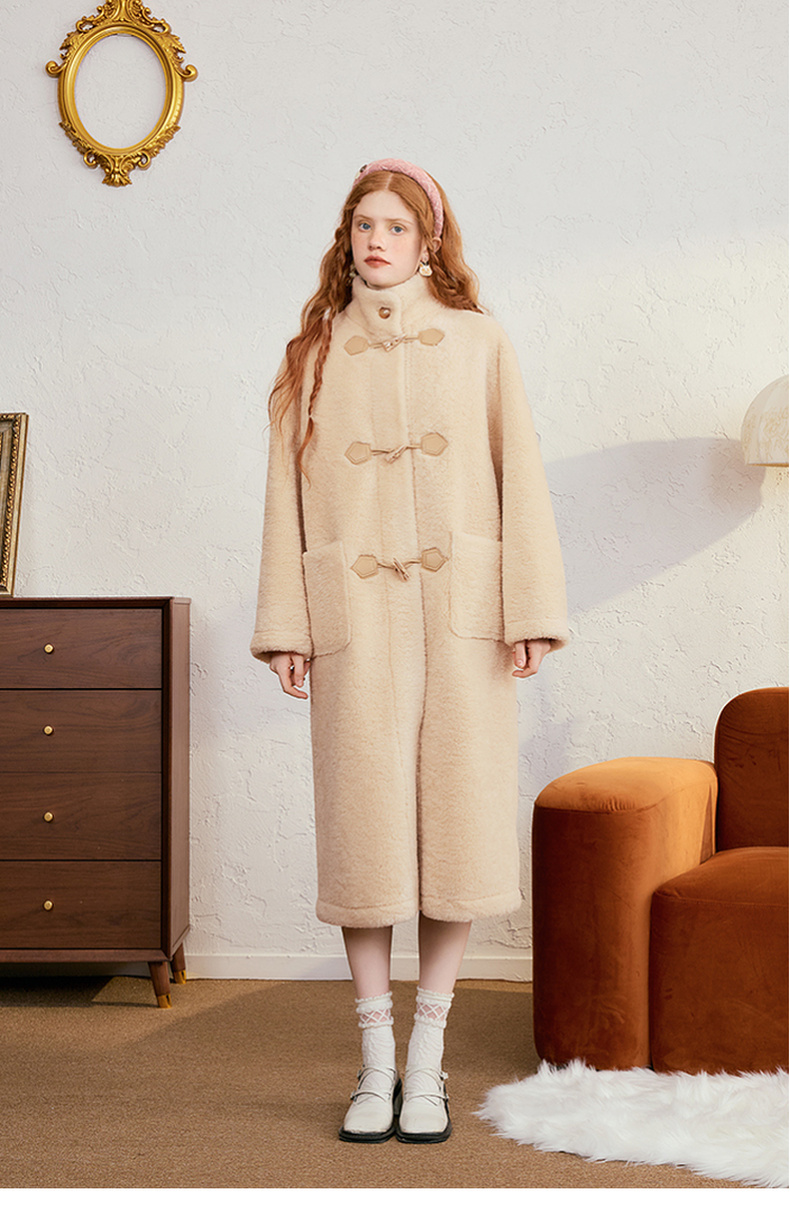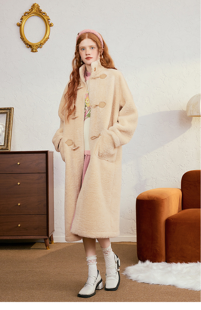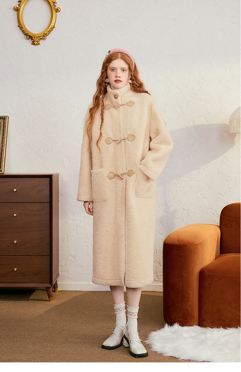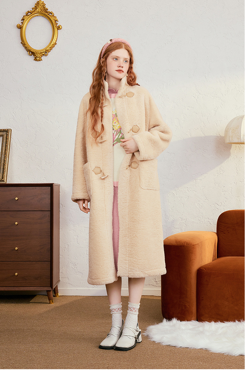 两三事 慕斯假日 2024冬季新款休闲牛角扣羊羔绒外套女中长款
