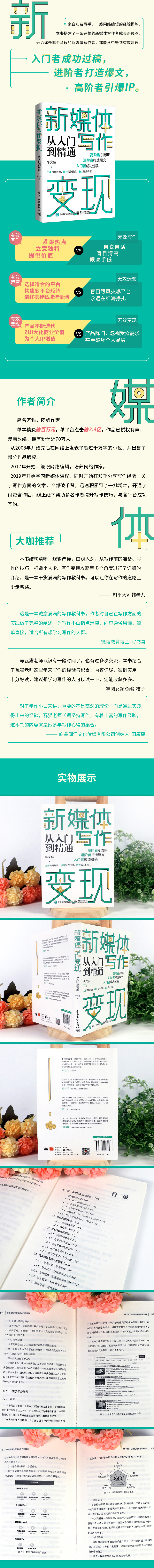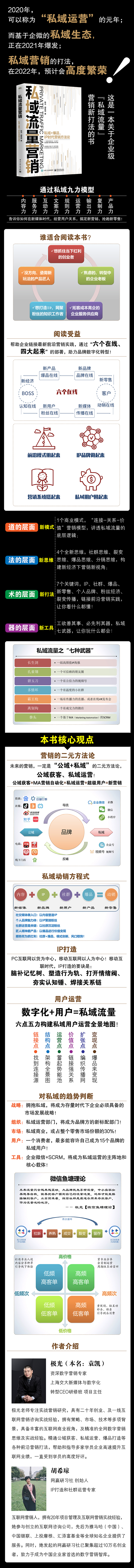 PC互联网以货为中心,移动互联网以人为中心。PC互联网的流量和转化法则正在被颠覆,5G时代的营销新打法,将会是什么?做生意,有三种流量,门店流量、平台流量、私域流量,你用的是哪一种?未来已经来临,只是尚未流行!IP、社群、爆品、新零售、个人品牌、粉丝经济、裂变传播……让你收获满满,让你从容应对不确定性时代的挑战和变化!这是一本移动互联时代,关于私域流量营销新玩法的书!让你学会IP化生存、让你搞定社群粉丝运营,让你在移动互联时代,自建用户鱼塘,创新模式、营销突围!本书从新媒体内容创作的角度,讲述了从写作变现到打造个人IP变现的实操全流程,帮助新媒体写作者重新构建新媒体变现的底层思维逻辑,找到适合自己的平台和写作方向,完善包括选题策划、标题拟定、谋篇布局、软件使用在内的各项新媒体内容生产能力,抓取新媒体变现的本质,放大写作的商业价值,*终形成个人品牌。通过本书,可以扫清新媒体写作和打造个人IP过程中的绝大部分障碍,帮助有志于从事新媒体行业的人少走弯路,避免踩雷。